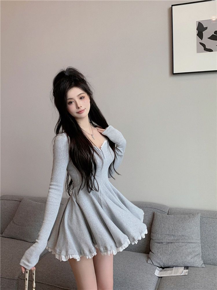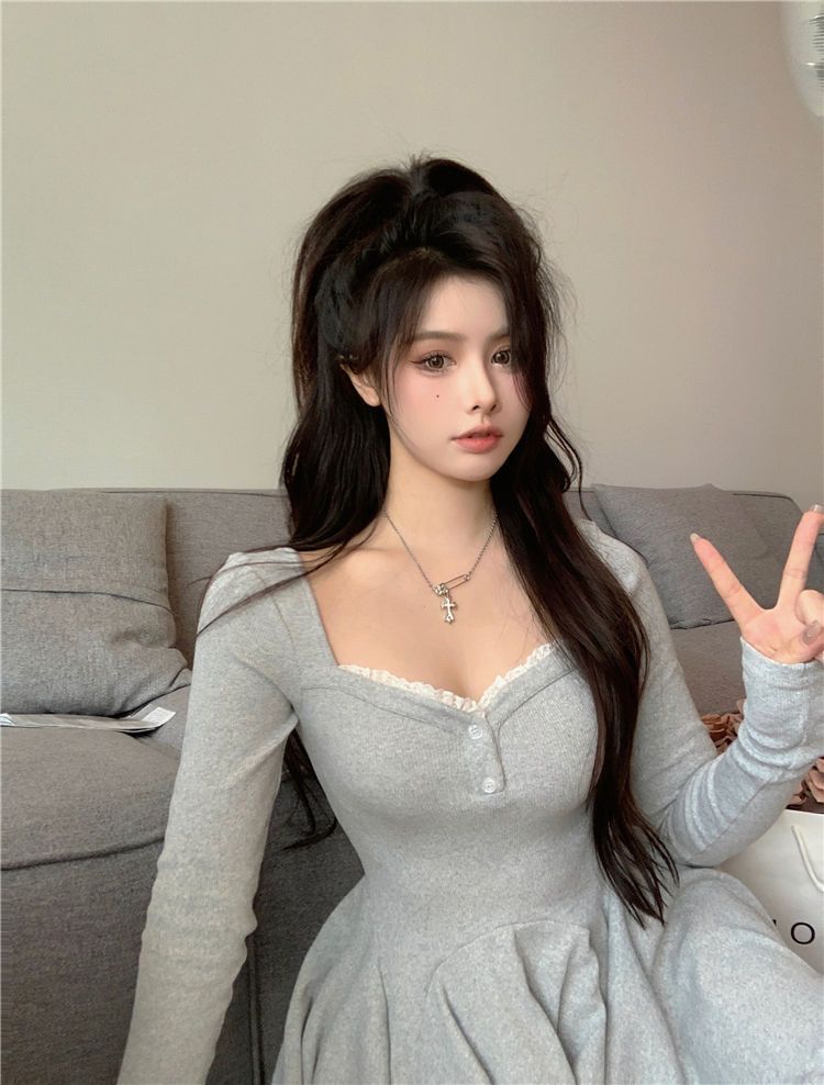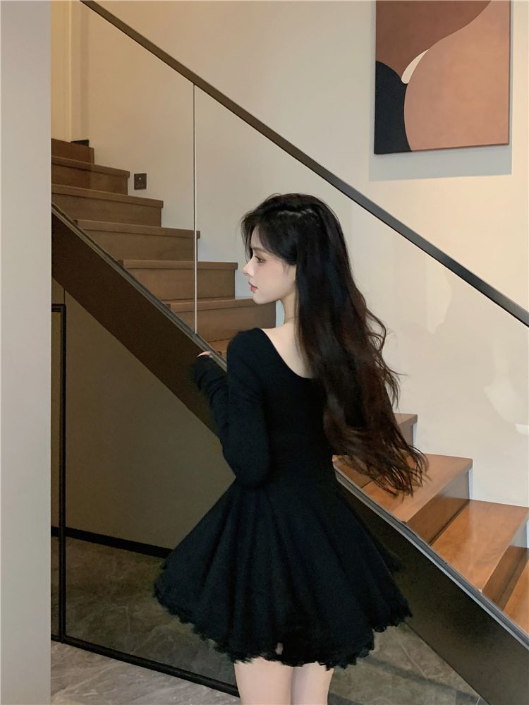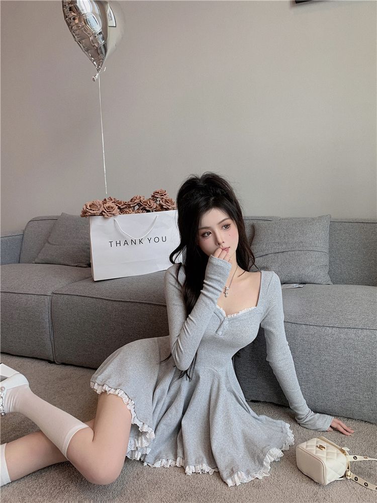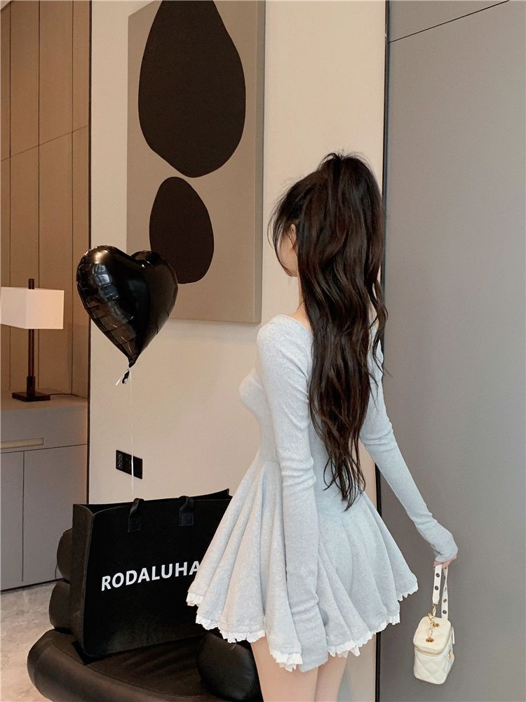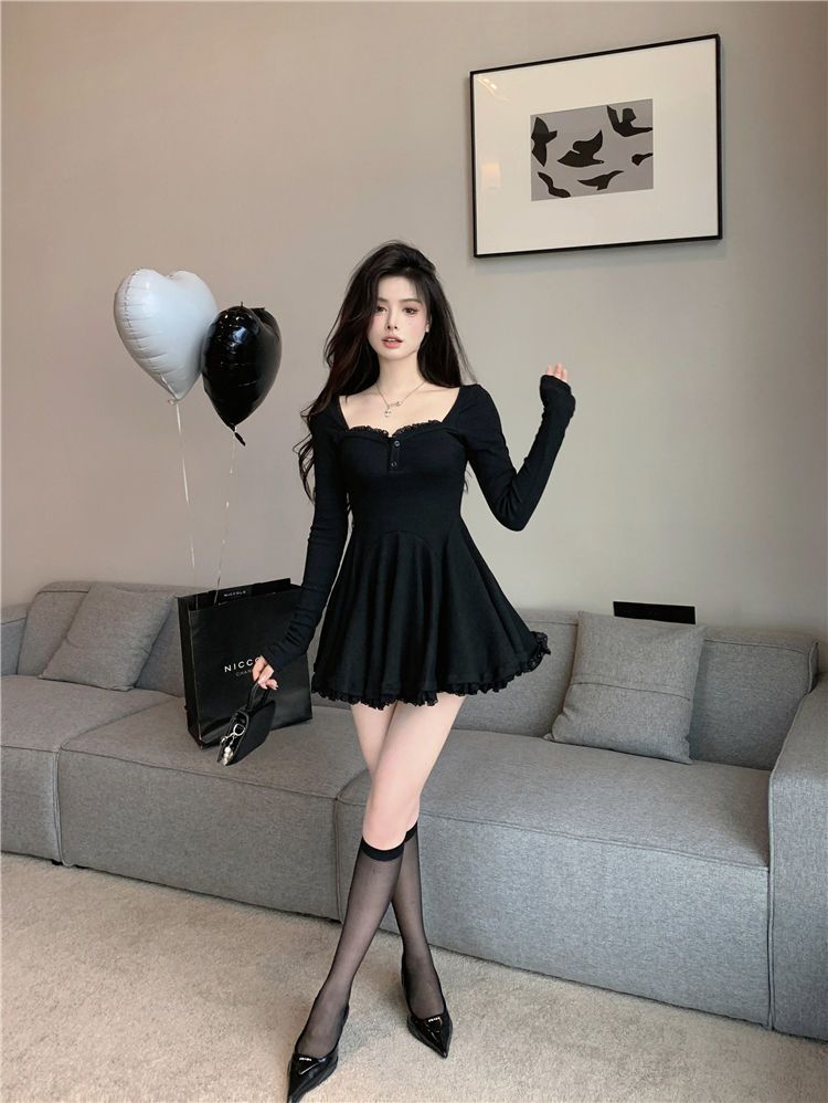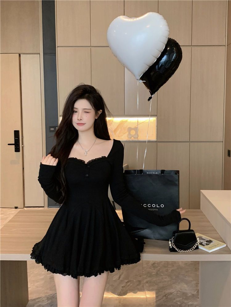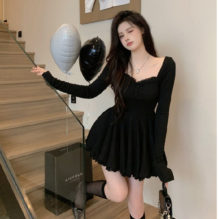 순수한 욕망 프랑스 스타일 섹시한 스파이스 소녀 광장 칼라 긴 소매 원피스 여성의 봄과 가을 새로운 도착 짧은 짧은 치마