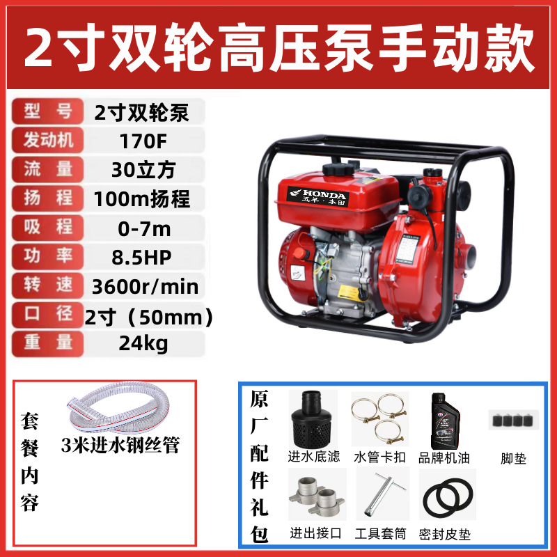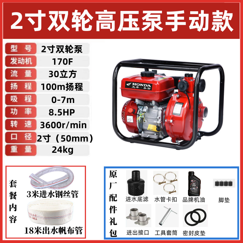• [고구성] 2inch 2륜 고압 워터펌프(8.5hp) - 표준구성(엔진오일)에는 입구 및 출구 파이프가 포함되어 있지 않습니다.