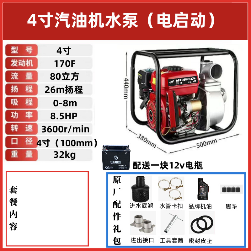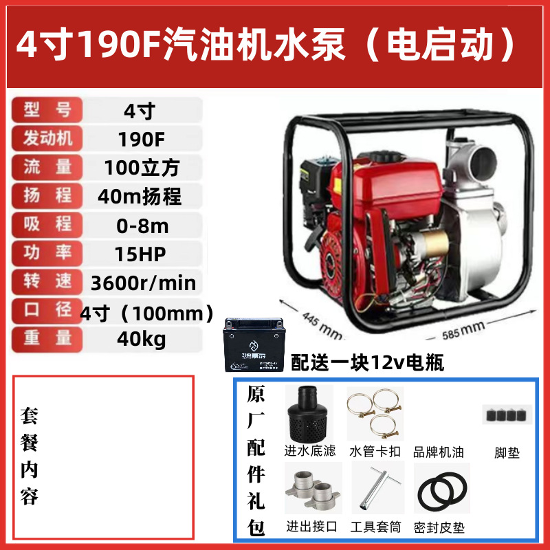 • [전기 시동] 4inch 강화 워터 펌프(배터리 제공) - 표준 구성(엔진 오일 제공)에는 입구 및 출구 파이프가 포함되어 있지 않습니다.