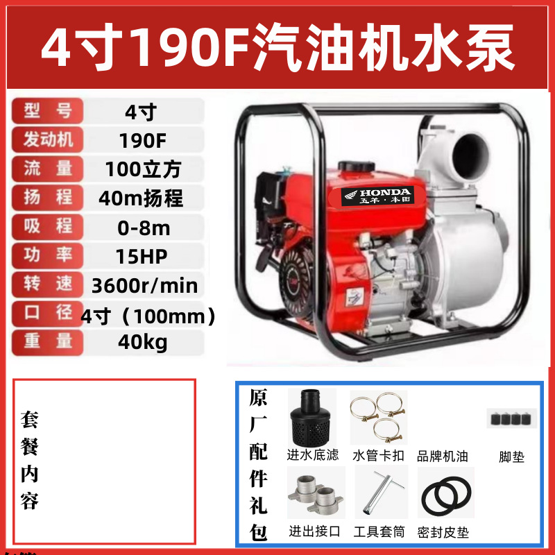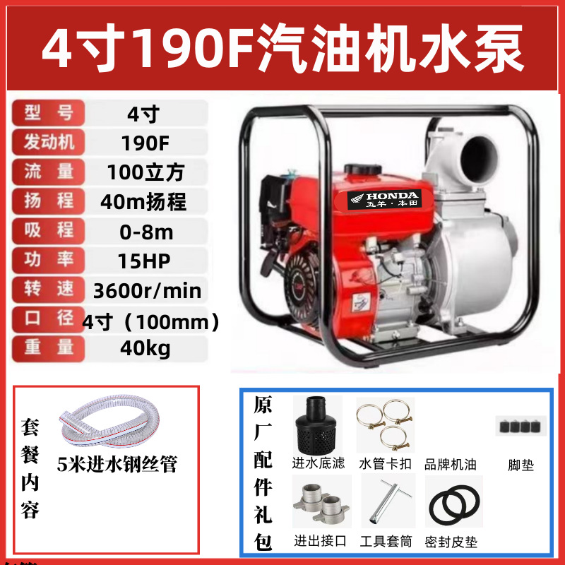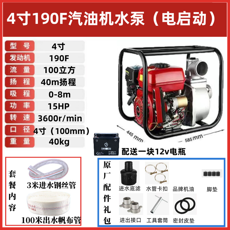 • [전기 시동] 4인치 190F 최고급 워터 펌프 장착 - 표준 구성(엔진 오일 제공)에는 입구 및 출구 파이프가 포함되어 있지 않습니다.