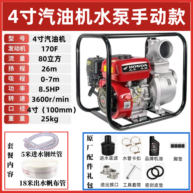 • 4inch 수동식 원심 가솔린 워터 펌프(11m 대형 흡입 범위) - 표준 구성 + 5m 물 입구 파이프 + 20m 물 출구 파이프