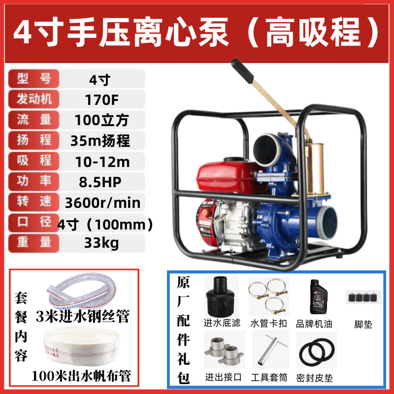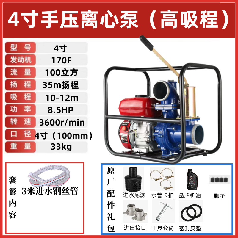 • 4inch 수동식 원심 가솔린 워터 펌프(11m 대형 흡입 범위) - 표준 구성 + 3m 물 입구 파이프