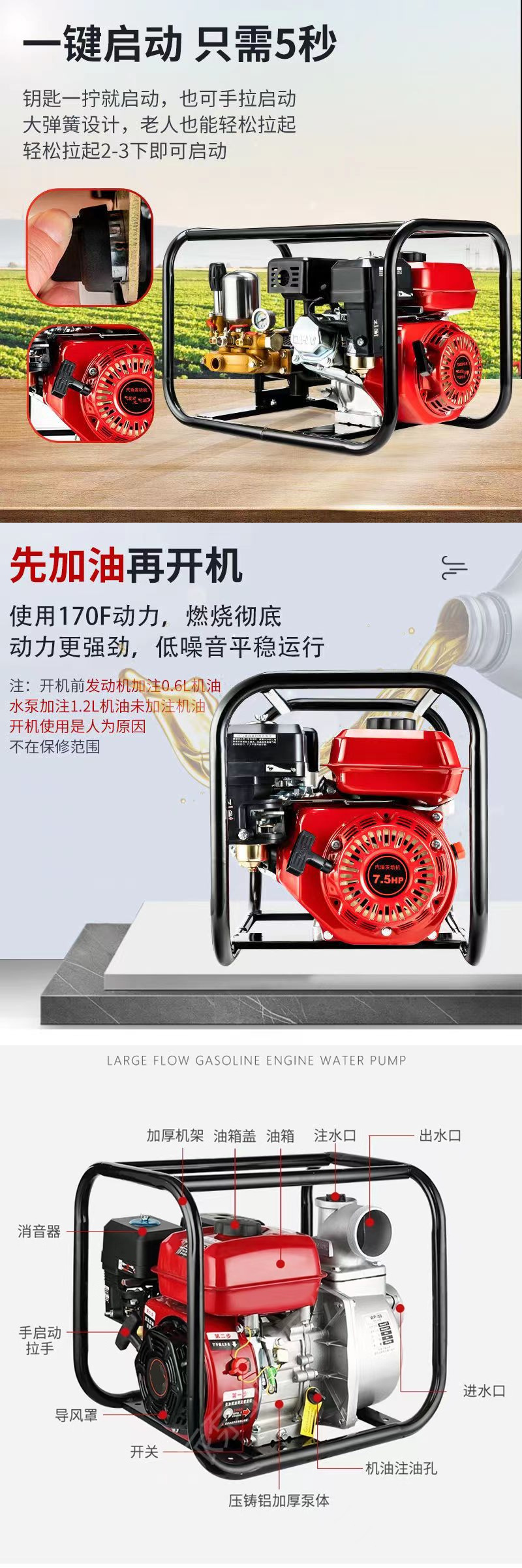 • [전기 시동] 4인치 190F 상단에는 최고급 워터 펌프가 장착되어 있습니다. 표준 구성 + 5m 물 유입 파이프