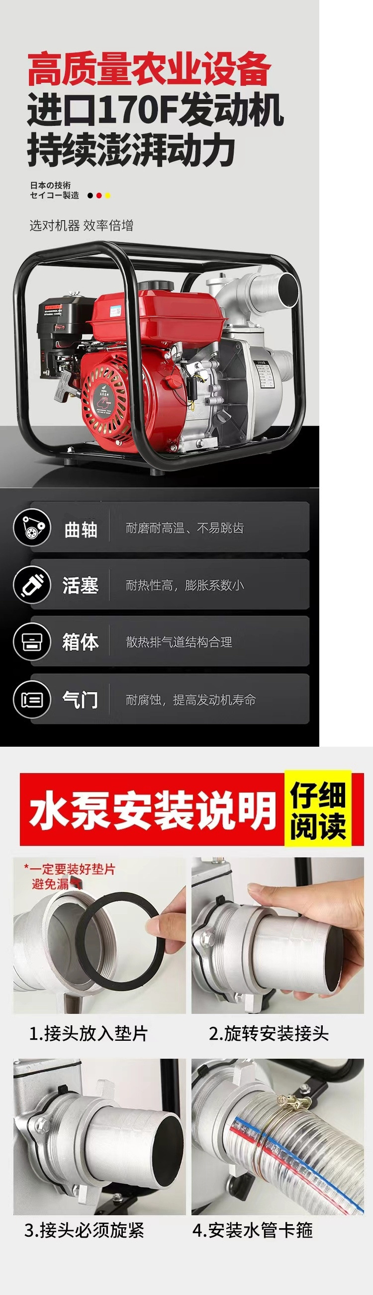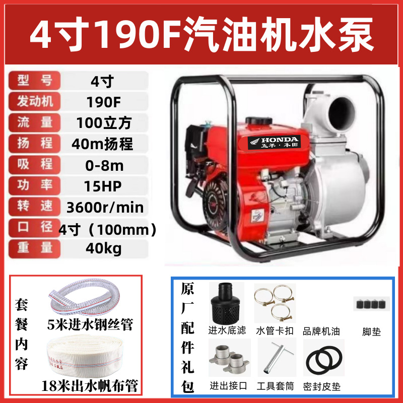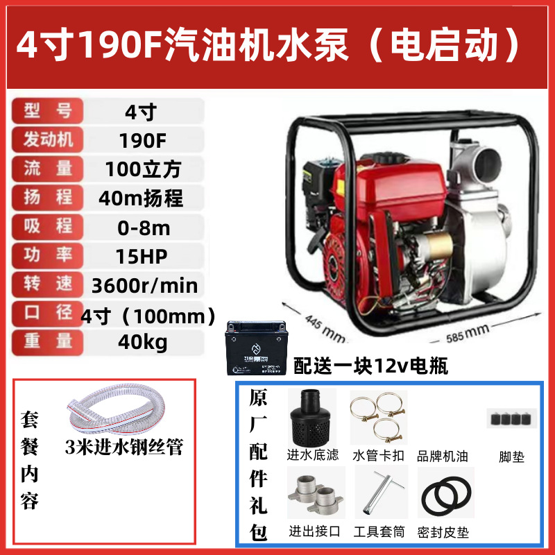 • [전기 시동] 4인치 190F 상단에는 최고급 워터 펌프가 장착되어 있습니다. 표준 구성 + 3m 물 유입 파이프