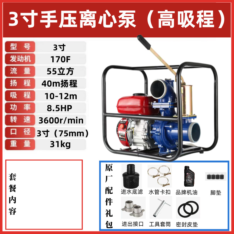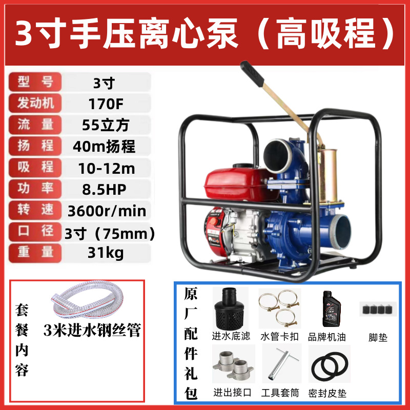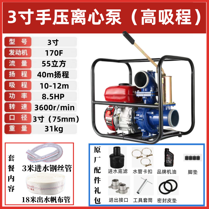 • 3inch 수동식 원심 가솔린 워터 펌프(12m 대형 흡입 범위) - 표준 구성 + 3m 물 입구 파이프