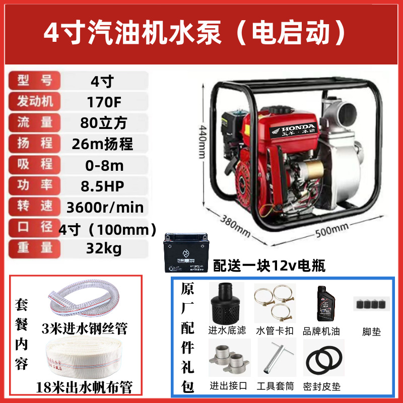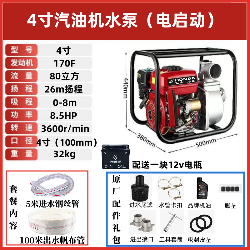 • [전기 시동] 4inch 향상된 워터 펌프(배터리 제공) - 표준 구성 + 3m 물 유입 파이프