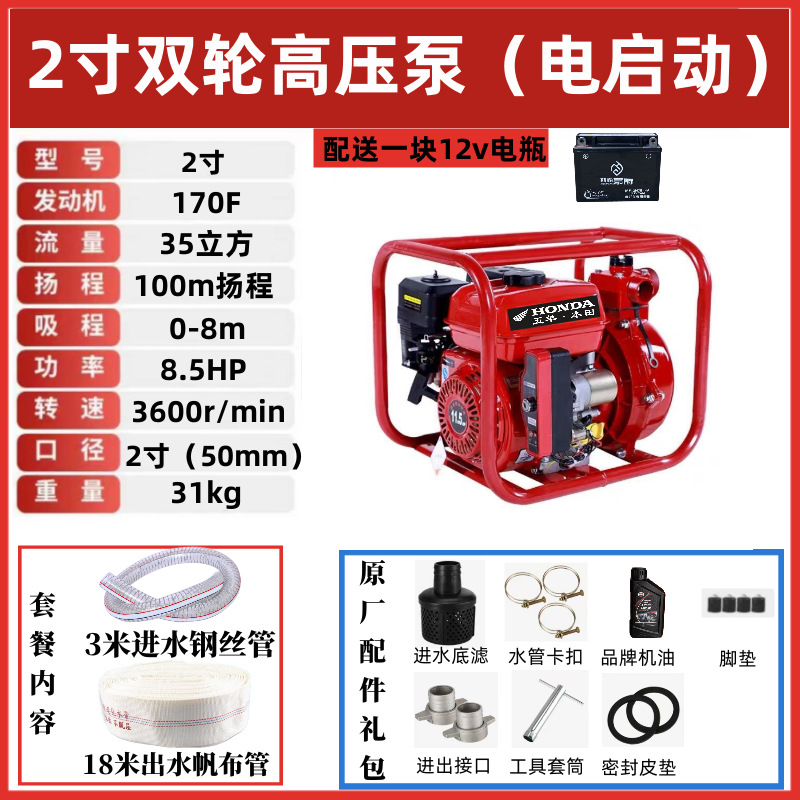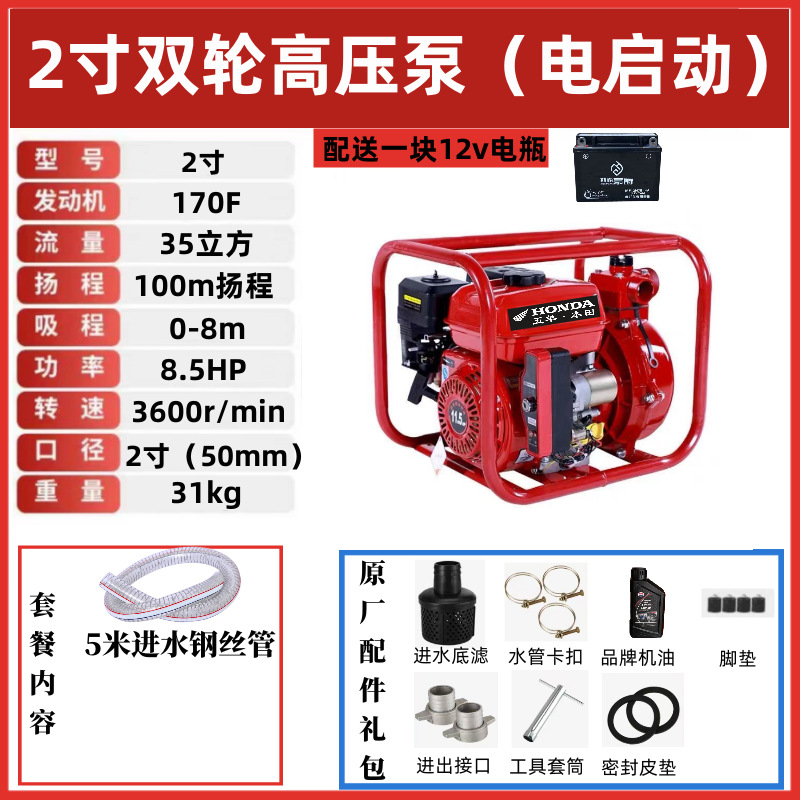 • [전기 시동] 2inch 2륜 고압 소방 펌프(배터리 포함) - 표준 구성 + 5m 물 유입 파이프