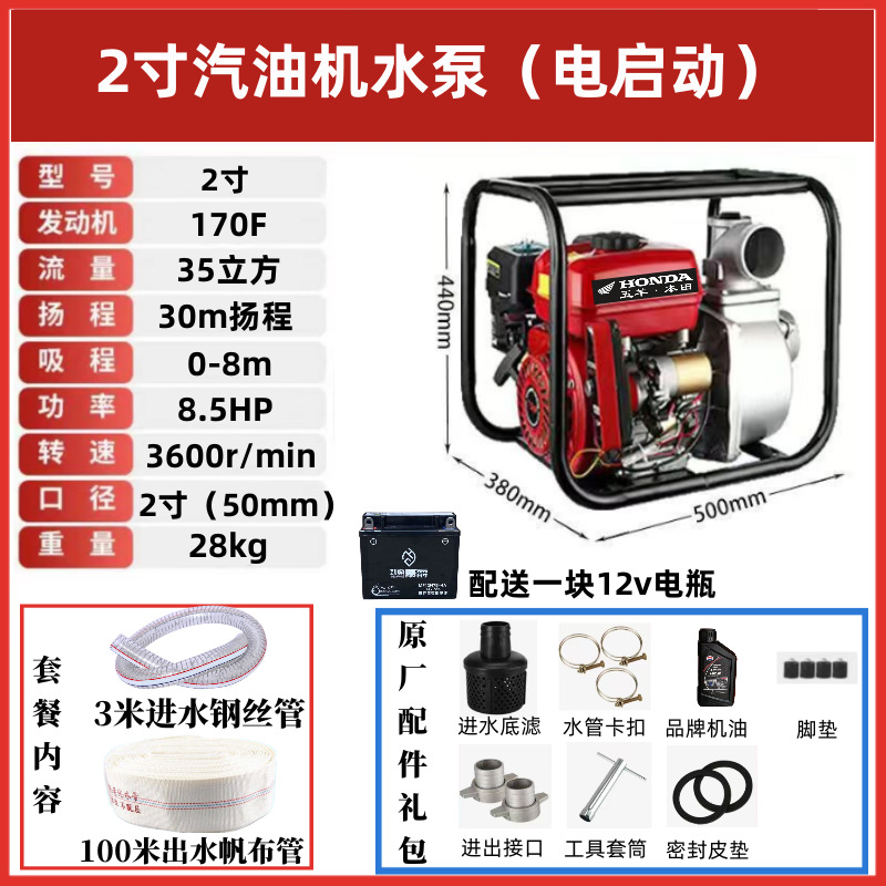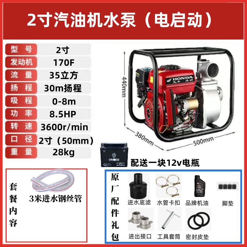 • [전기 시동] 2inch 가솔린 워터 펌프(배터리 제공) - 표준 구성 + 3m 물 유입 파이프