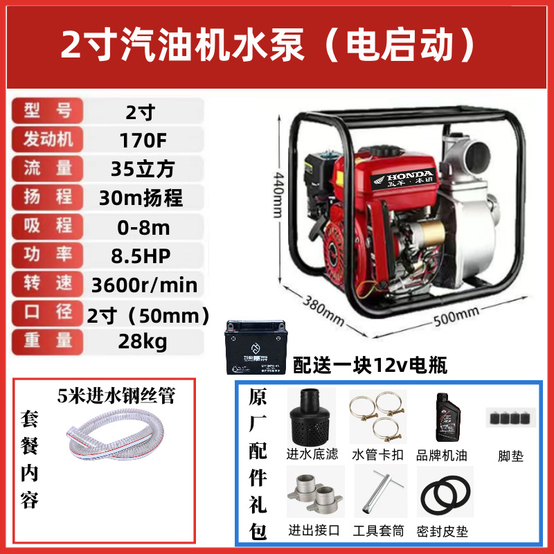 • [전기 시동] 2inch 가솔린 워터 펌프(배터리 제공) - 표준 구성 + 5m 물 유입 파이프