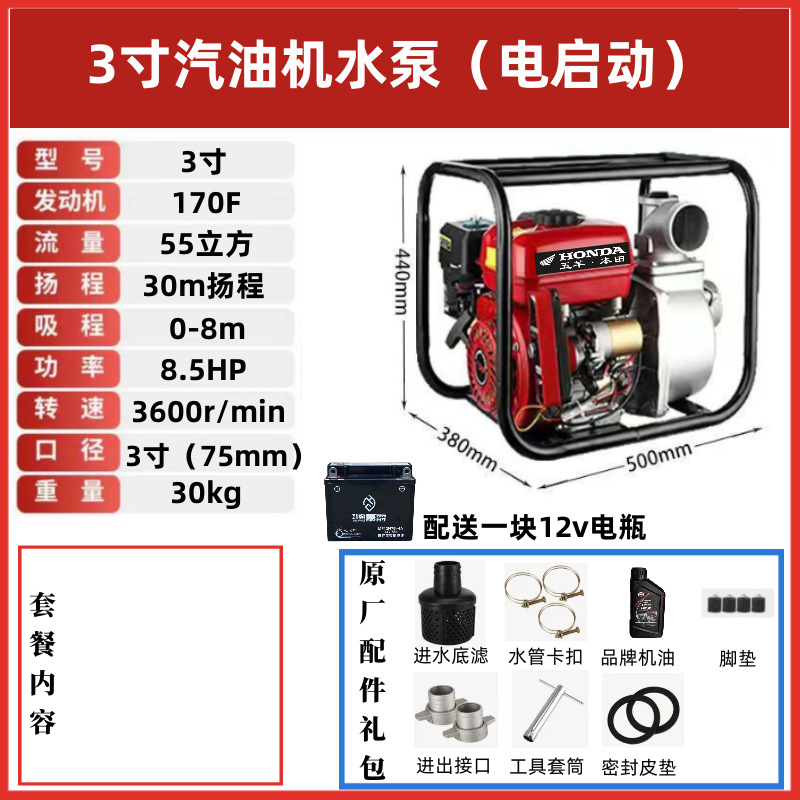 • [전기 시동] 3inch 가솔린 워터 펌프(배터리 제공) - 표준 구성(엔진 오일 제공)에는 입구 및 출구 파이프가 포함되어 있지 않습니다.