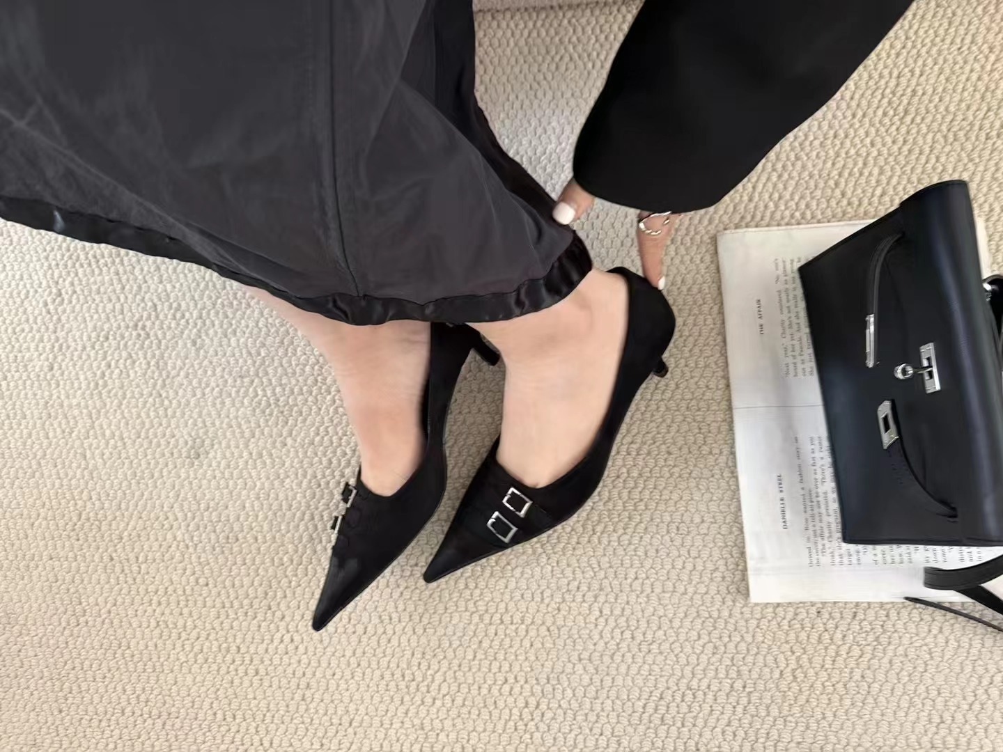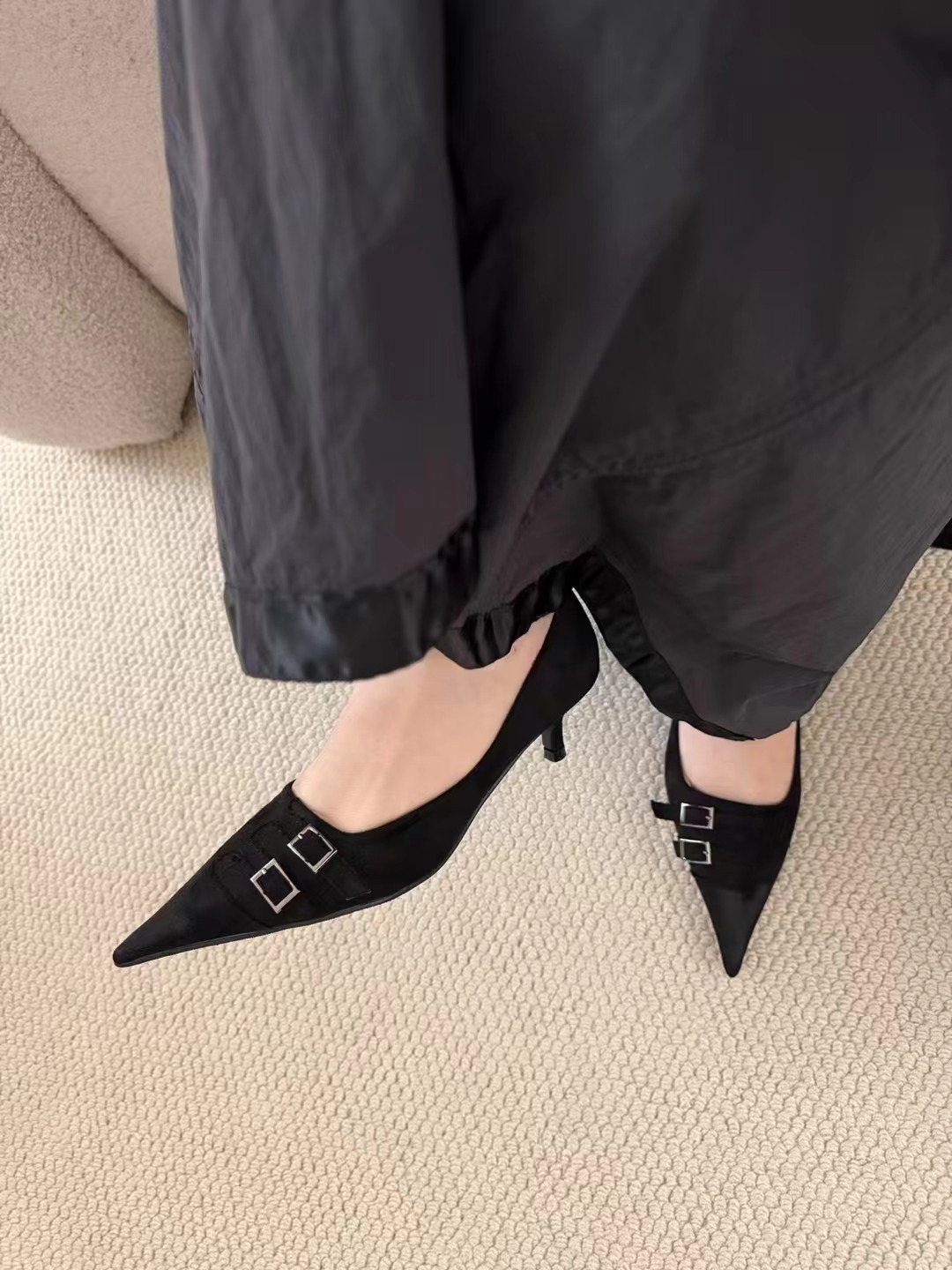 빈티지 뾰족한 발가락 얕은 입 싱글 레이어 신발 여성의 2025 봄 새로운 도착 프랑스 스웨이드 올 매치 늦은 저녁 브리즈 통근 스틸레토 힐 하이힐 신발스토어 가기