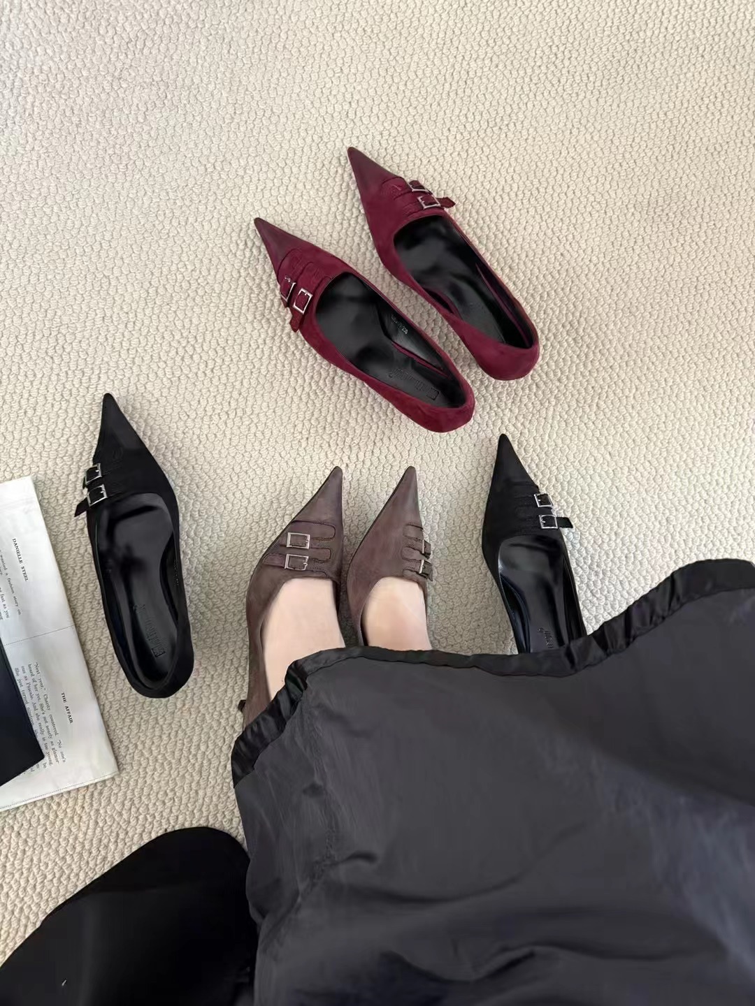 빈티지 뾰족한 발가락 얕은 입 싱글 레이어 신발 여성의 2025 봄 새로운 도착 프랑스 스웨이드 올 매치 늦은 저녁 브리즈 통근 스틸레토 힐 하이힐 신발