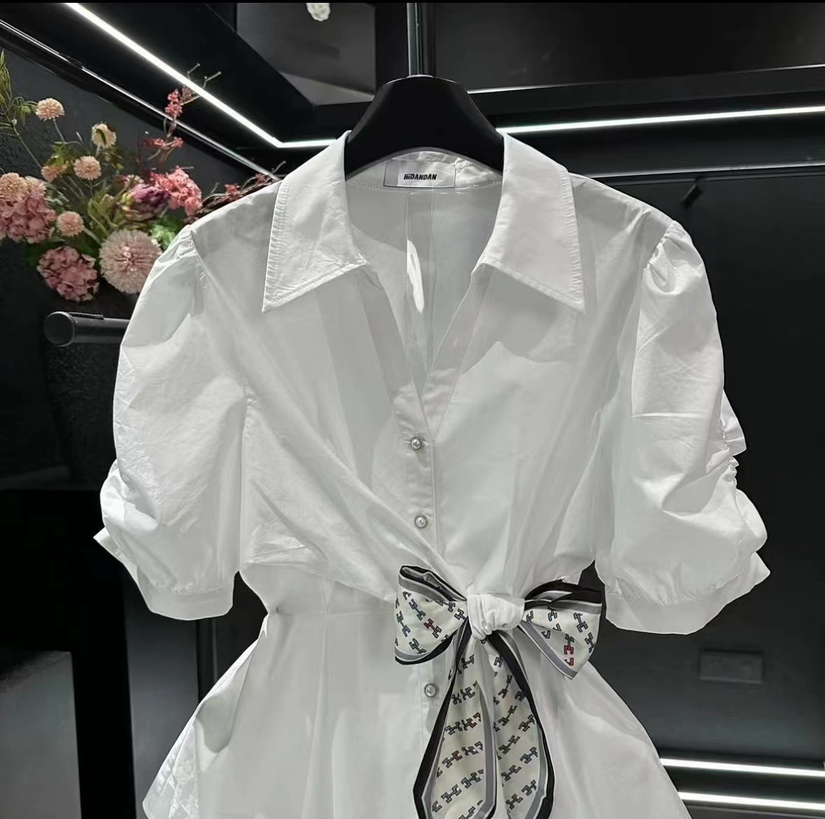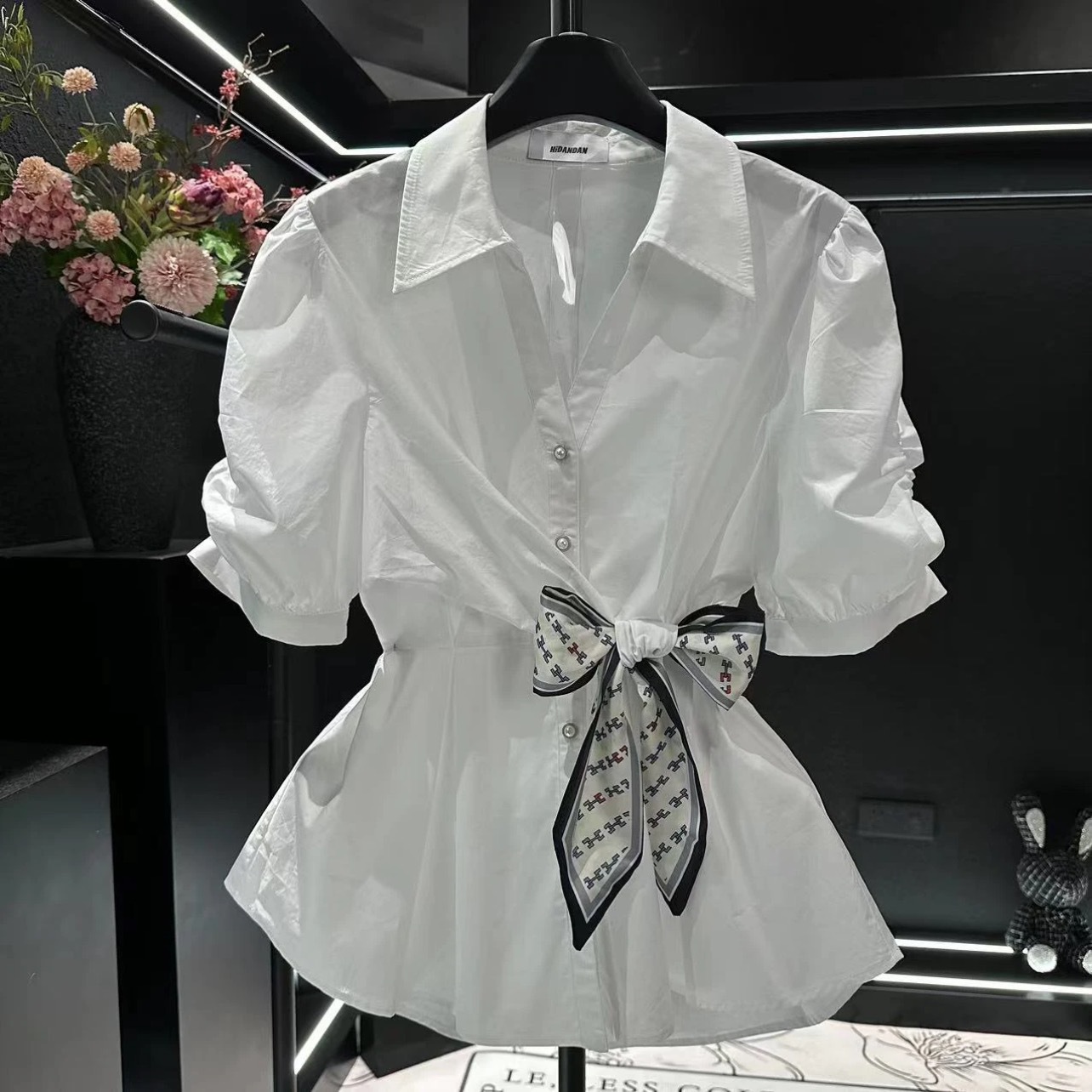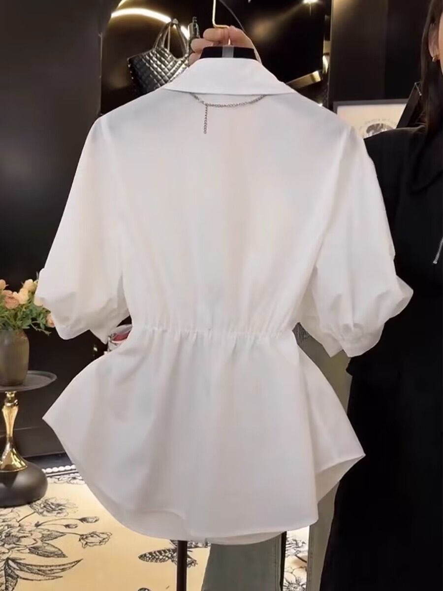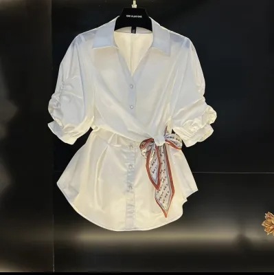 프랑스 스타일 가벼운 럭셔리 2025 봄과 여름 새로운 디자인 센스 짧은 소매 셔츠 타이트 허리 실크 스카프 탑 화이트 셔츠스토어 가기