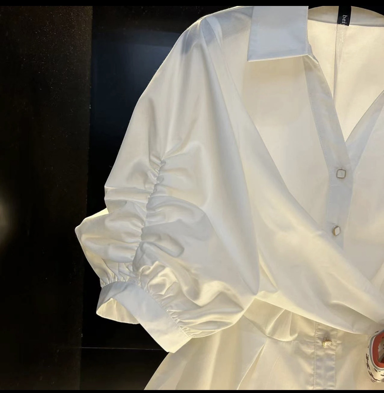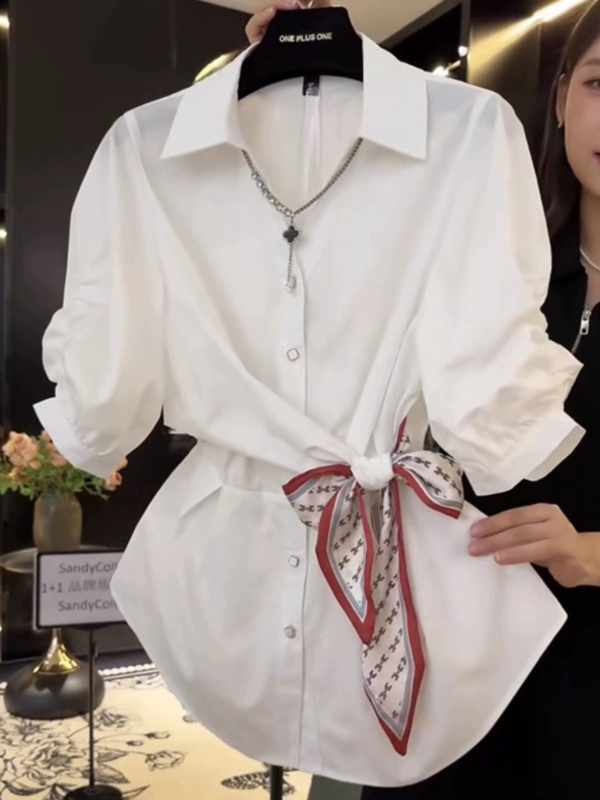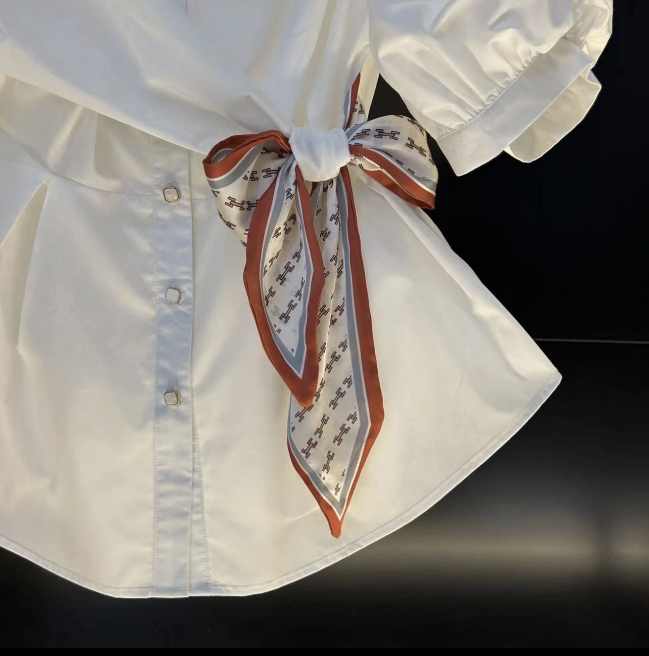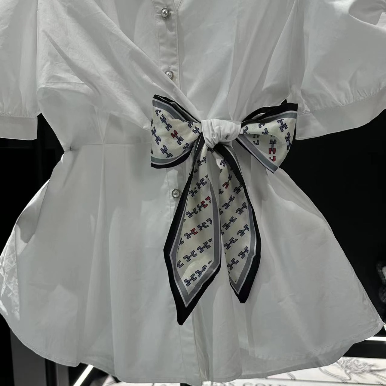 프랑스 스타일 가벼운 럭셔리 2025 봄과 여름 새로운 디자인 센스 짧은 소매 셔츠 타이트 허리 실크 스카프 탑 화이트 셔츠스토어 가기