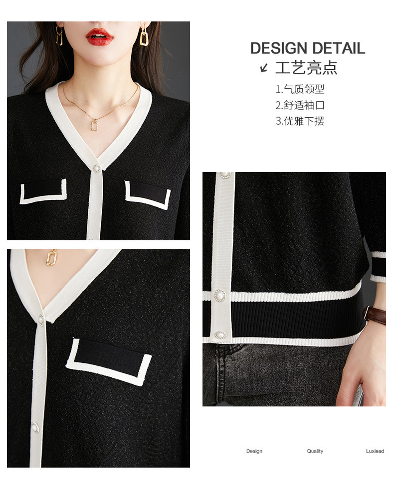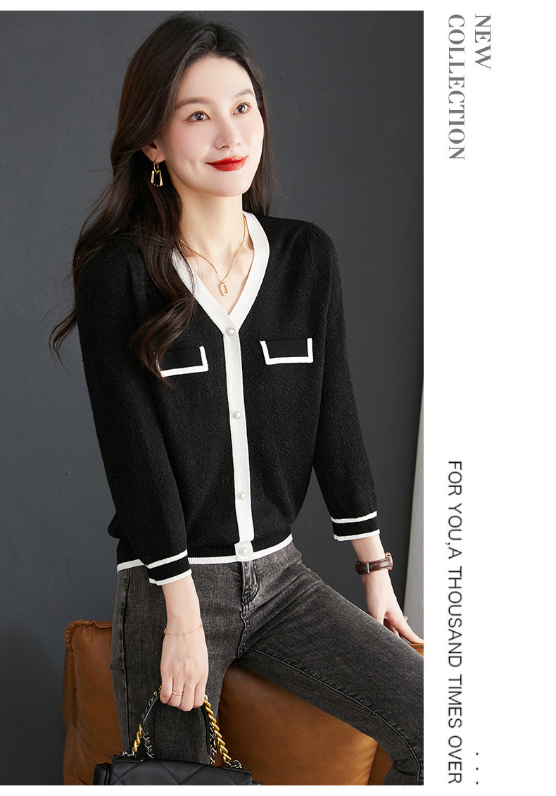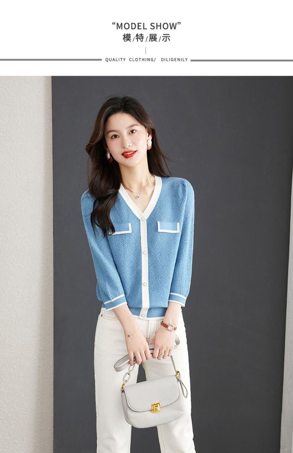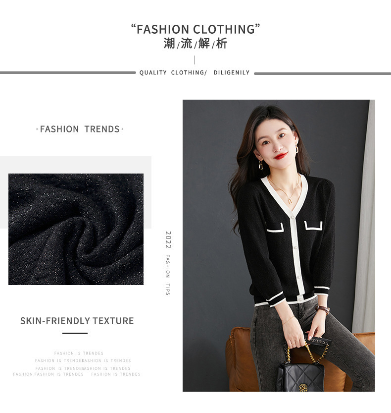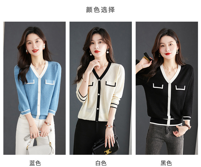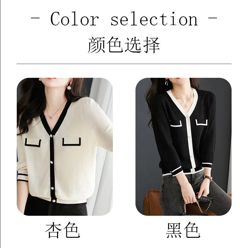 2025 새로운 V 넥 컬러 매칭 아이스 실크 니트 스웨터 여성 7 점 슬리브 캔들 실버 실크 샤넬 스타일 유행 웨스턴 스타일 탑스토어 가기