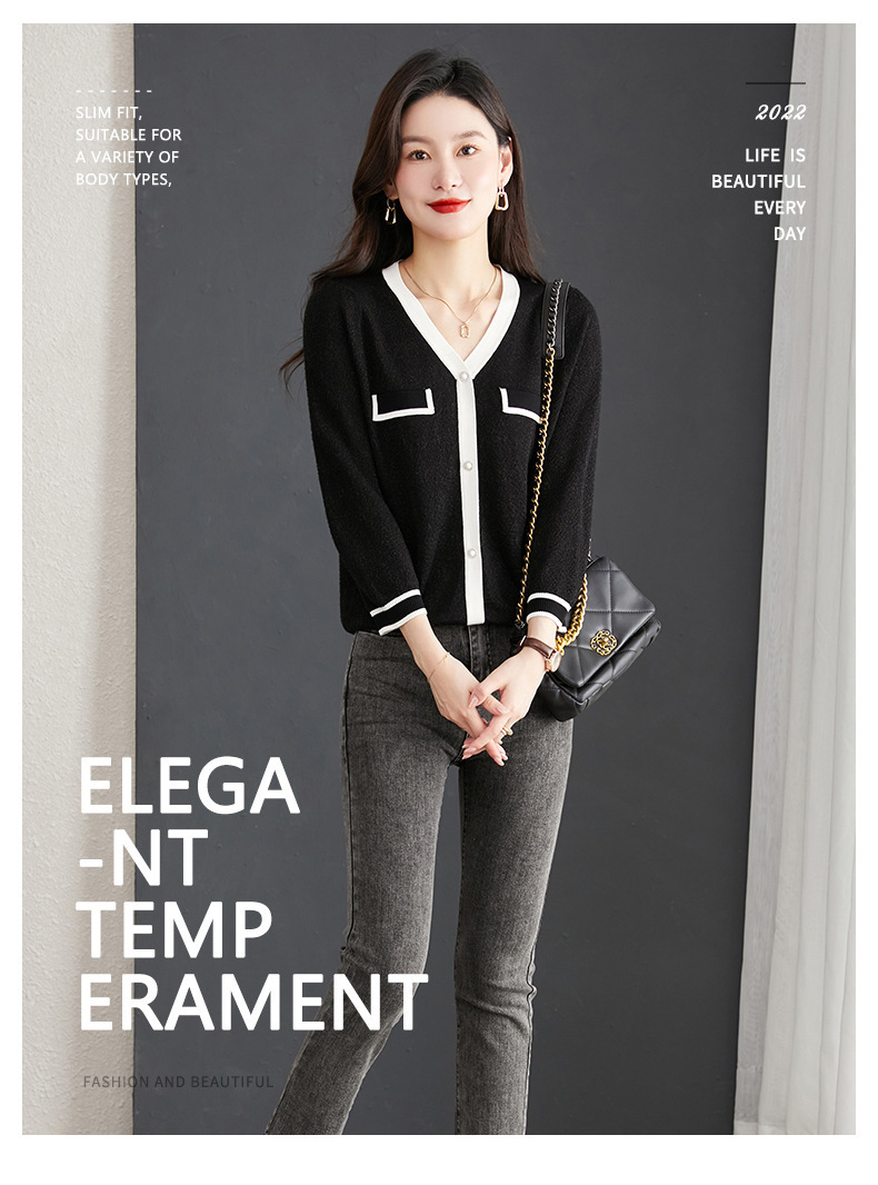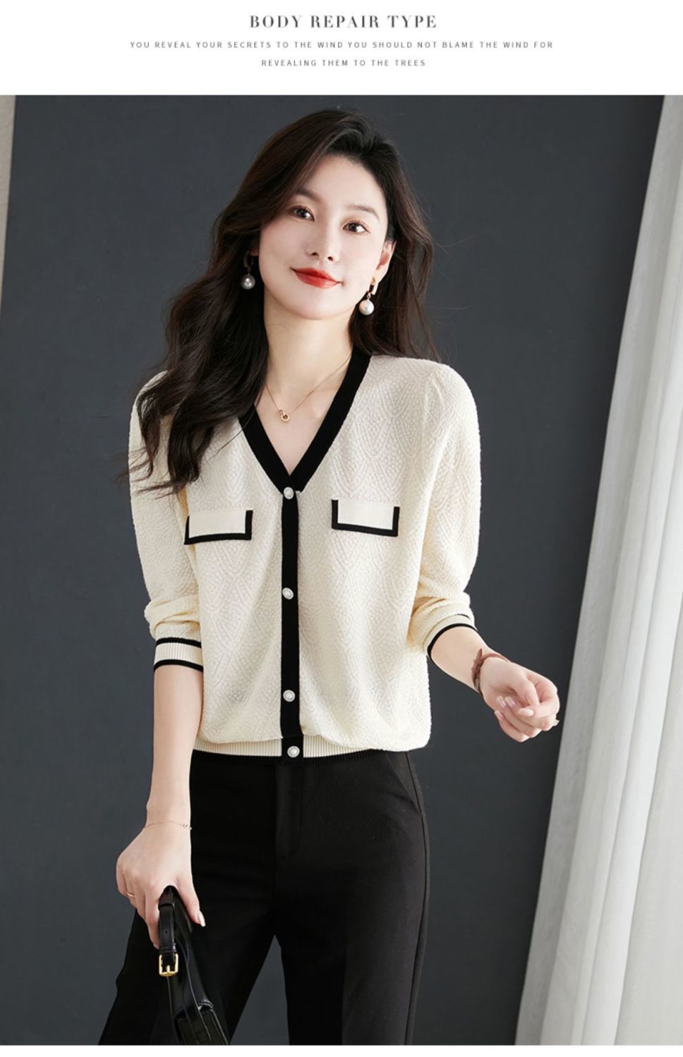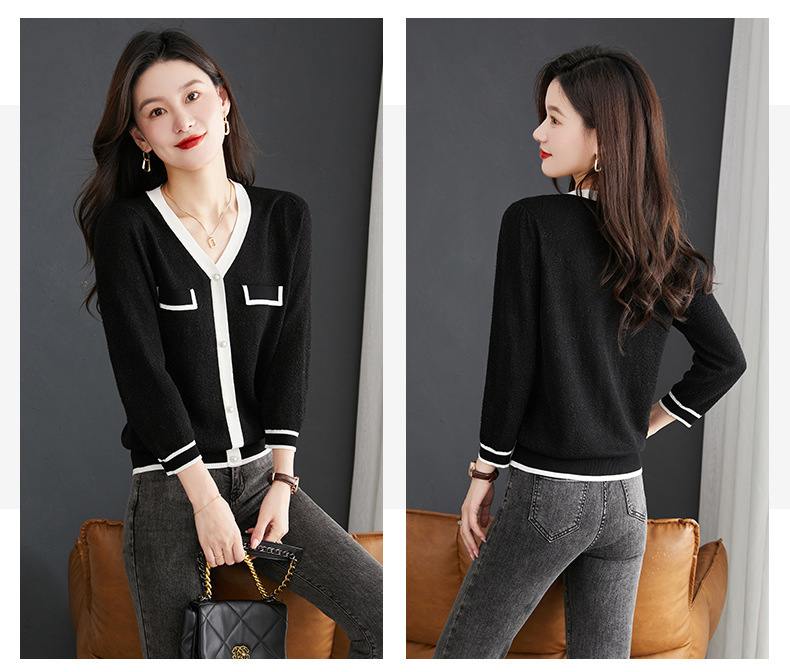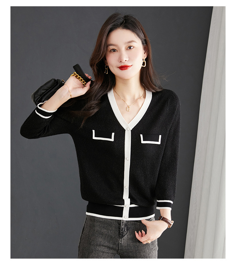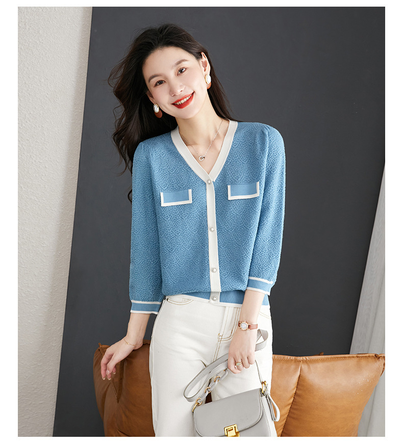 2025 새로운 V 넥 컬러 매칭 아이스 실크 니트 스웨터 여성 7 점 슬리브 캔들 실버 실크 샤넬 스타일 유행 웨스턴 스타일 탑스토어 가기