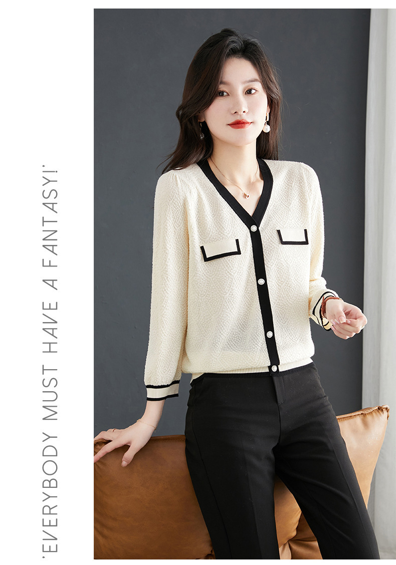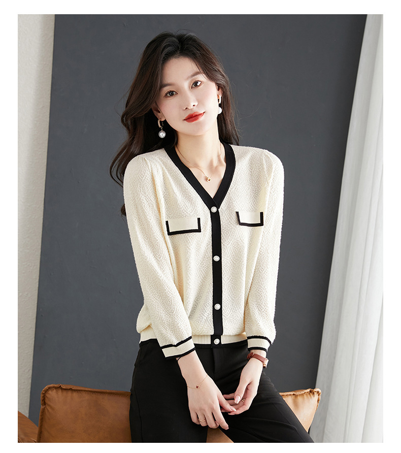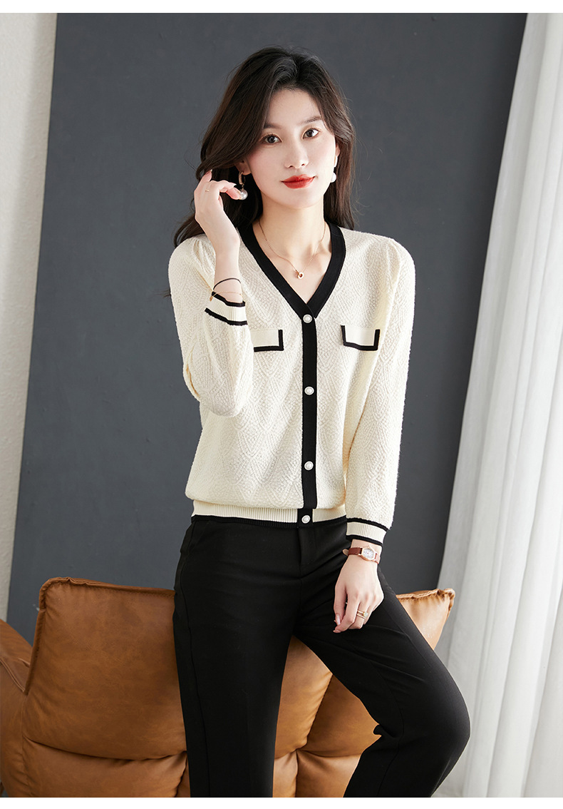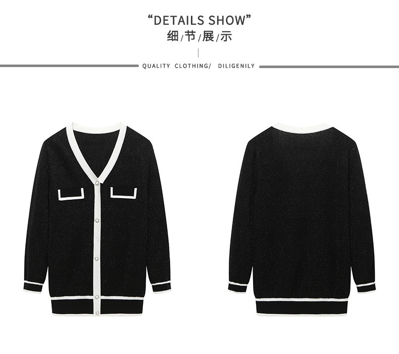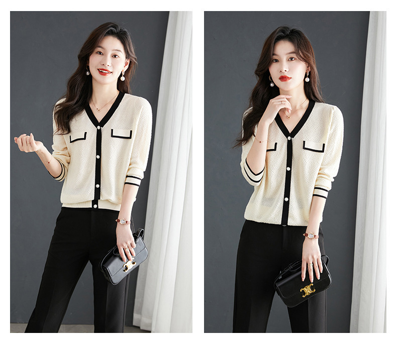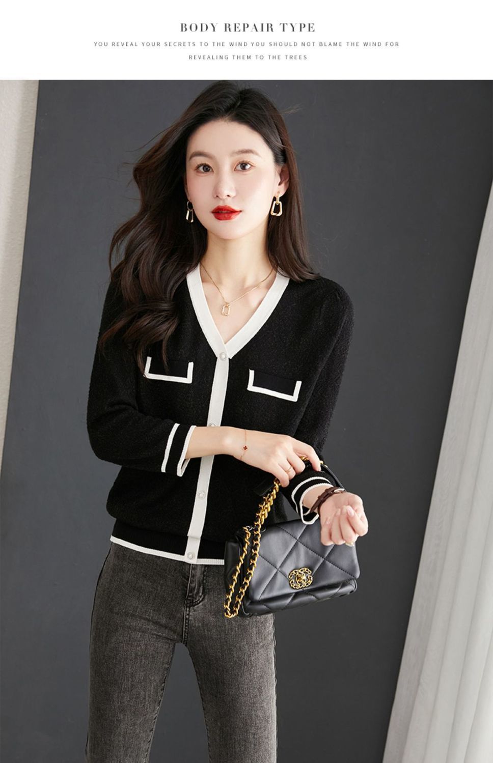 2025 새로운 V 넥 컬러 매칭 아이스 실크 니트 스웨터 여성 7 점 슬리브 캔들 실버 실크 샤넬 스타일 유행 웨스턴 스타일 탑스토어 가기