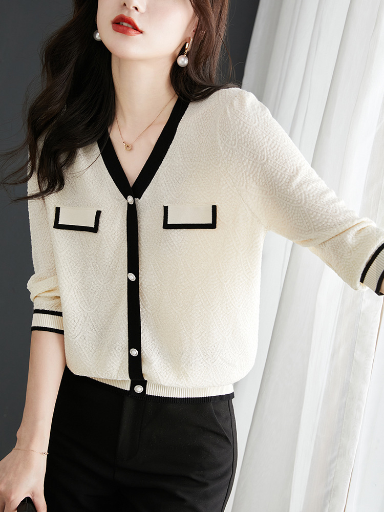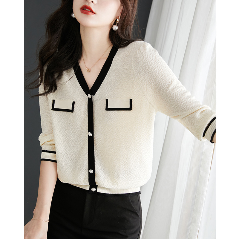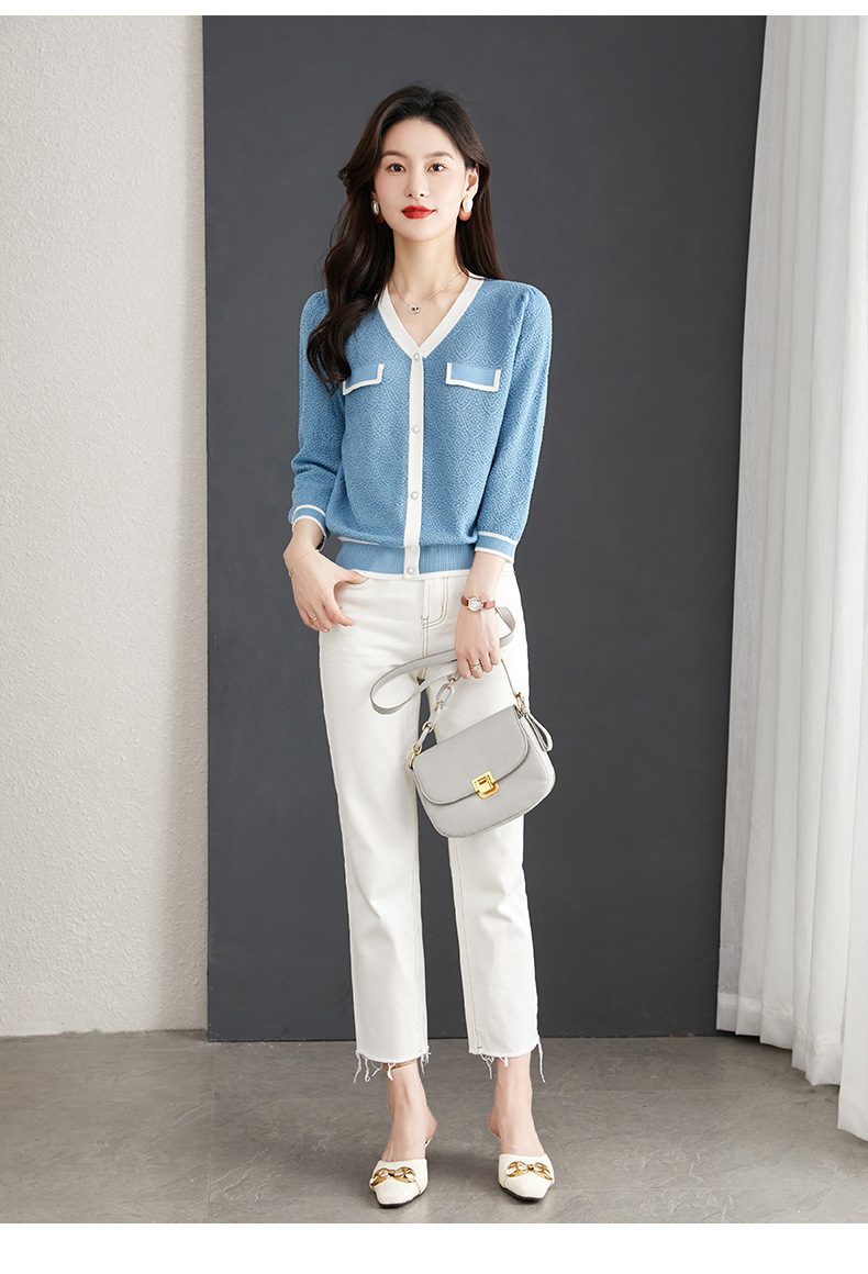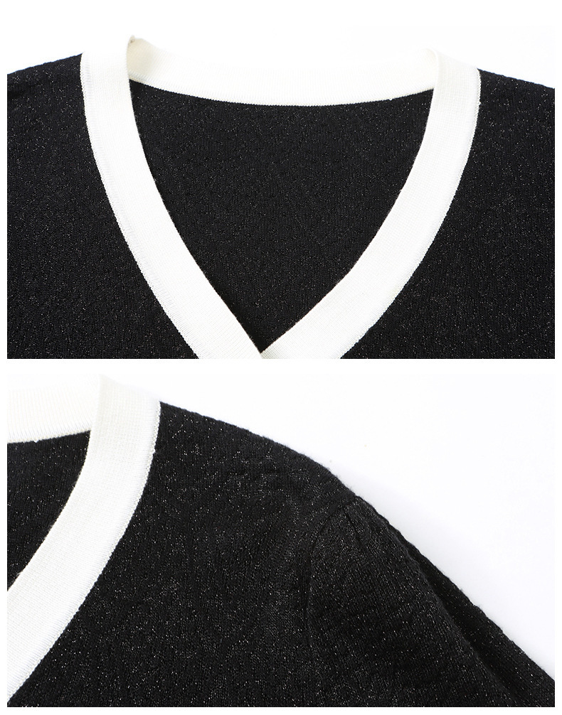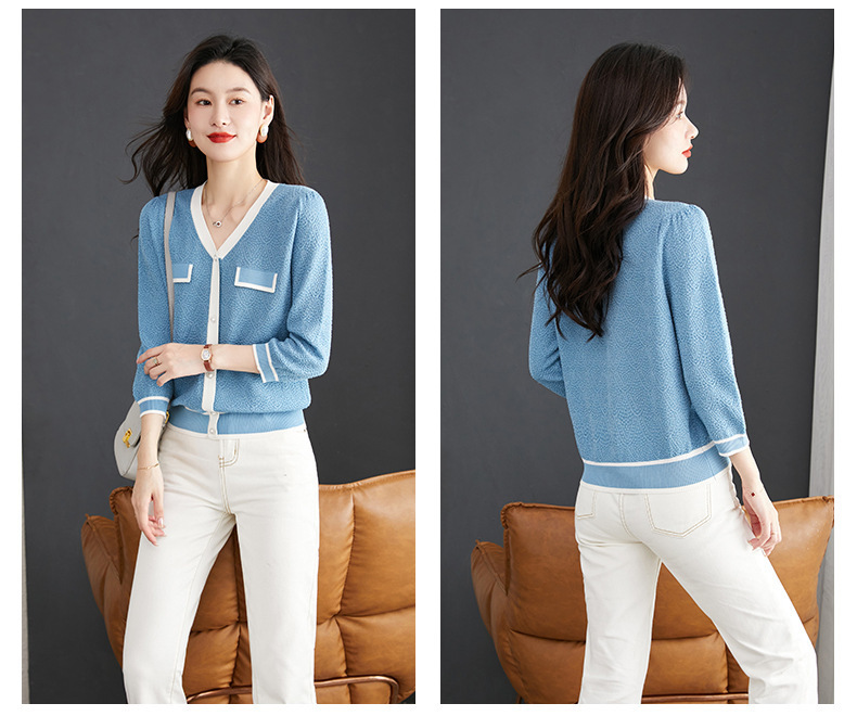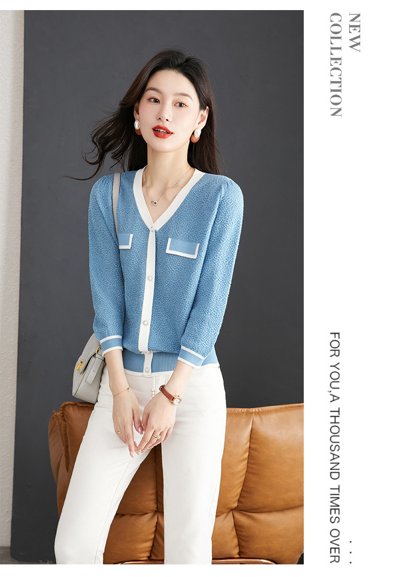 2025 새로운 V 넥 컬러 매칭 아이스 실크 니트 스웨터 여성 7 점 슬리브 캔들 실버 실크 샤넬 스타일 유행 웨스턴 스타일 탑