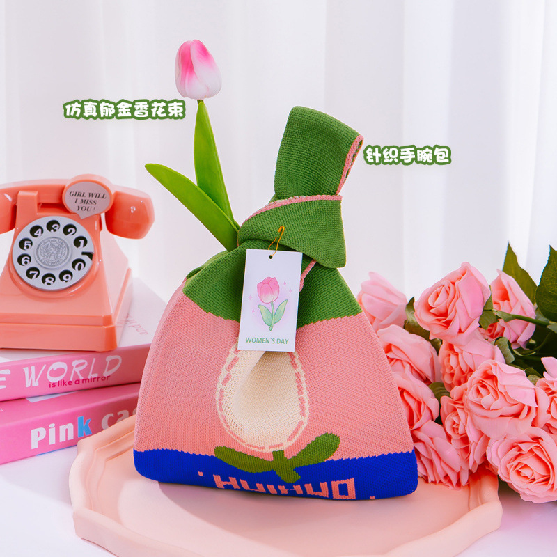 • [핑크&그린 튤립] 니트 손목가방 세트D