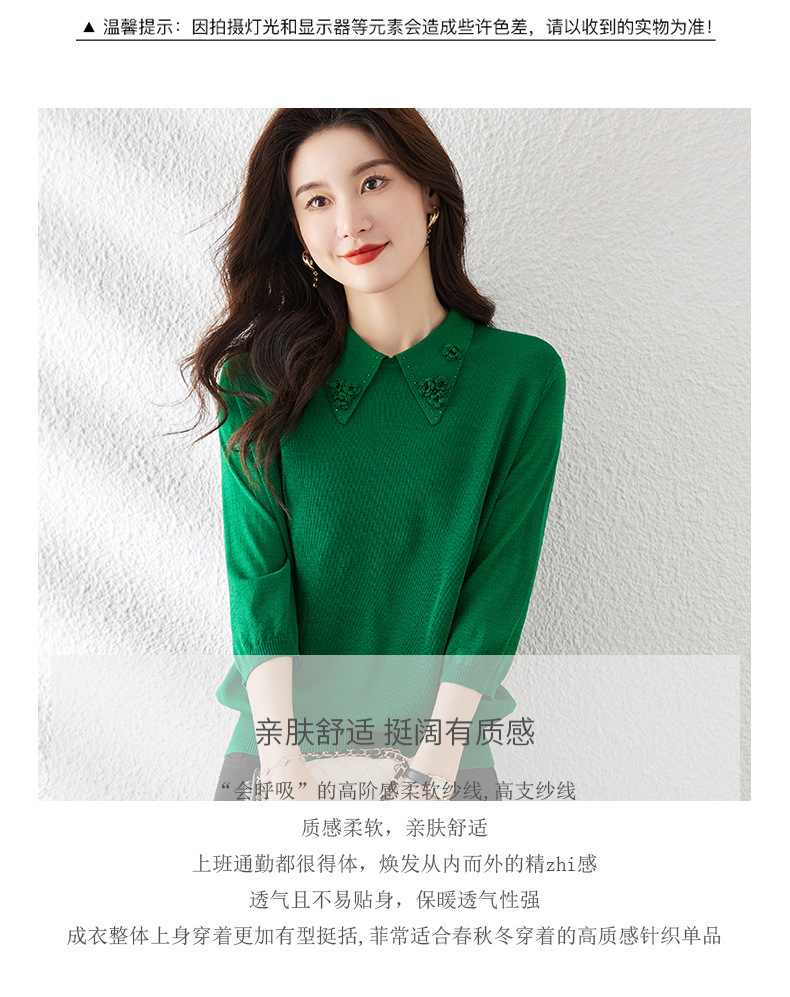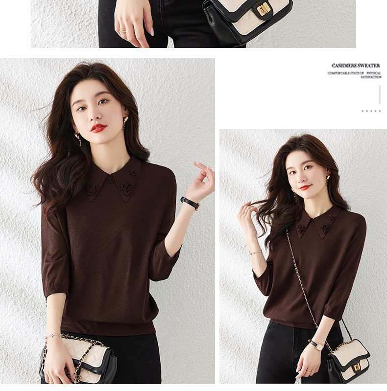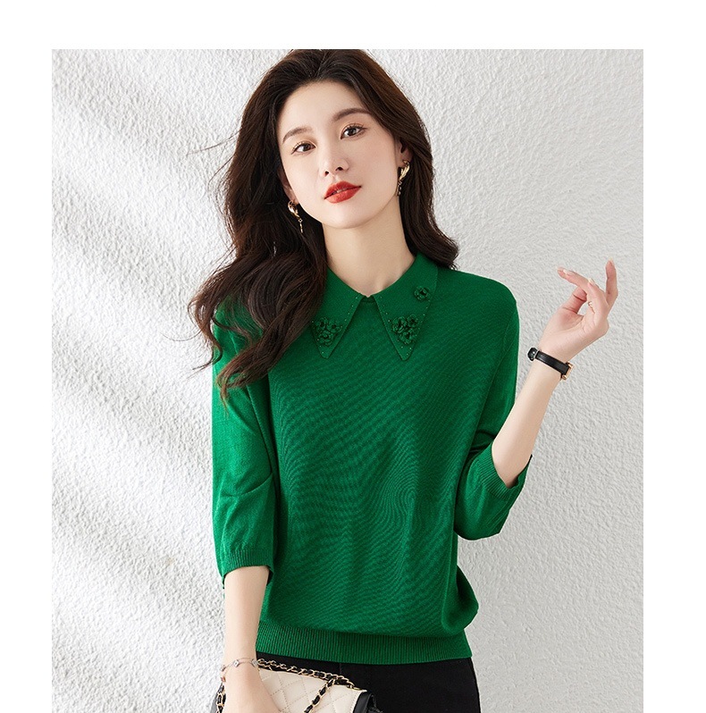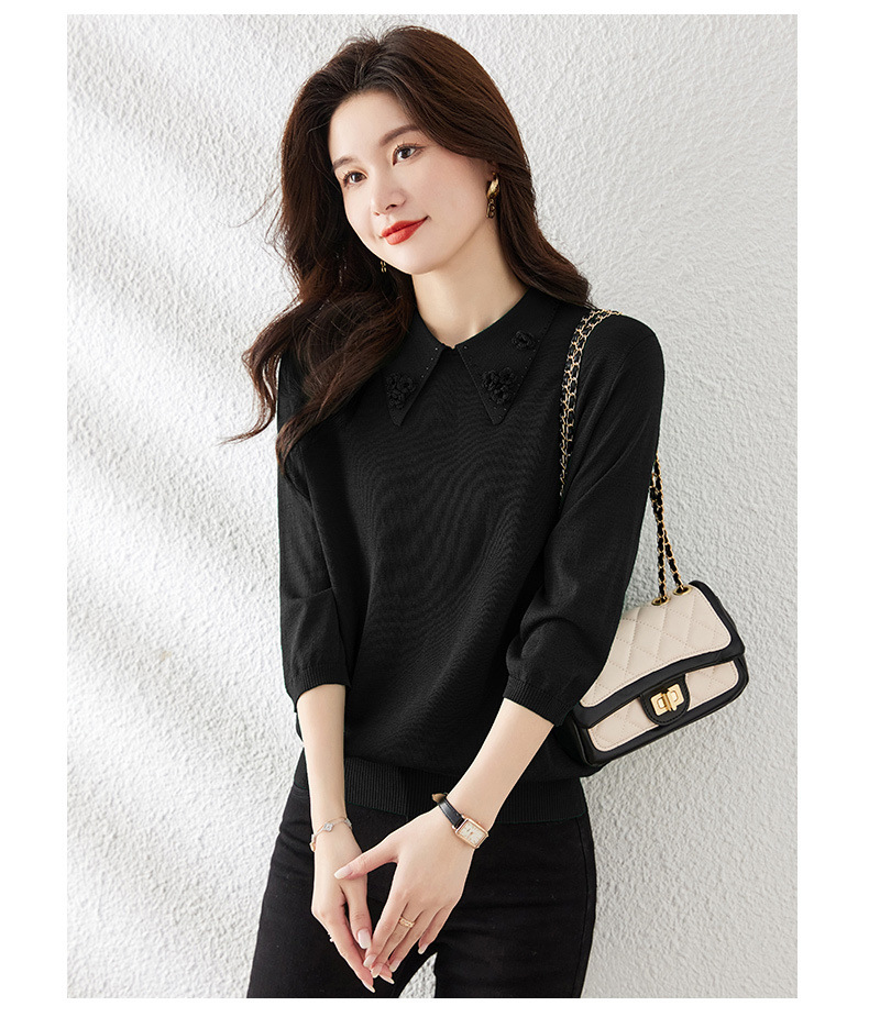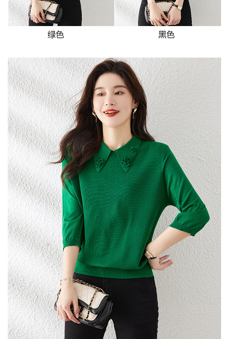 Mid-Sleeve Seven-Sleeve 탑 아이스 실크 니트 셔츠 어머니 봄과 여름 새로운 인형 칼라 스타일 얇은 반소매 작은 셔츠