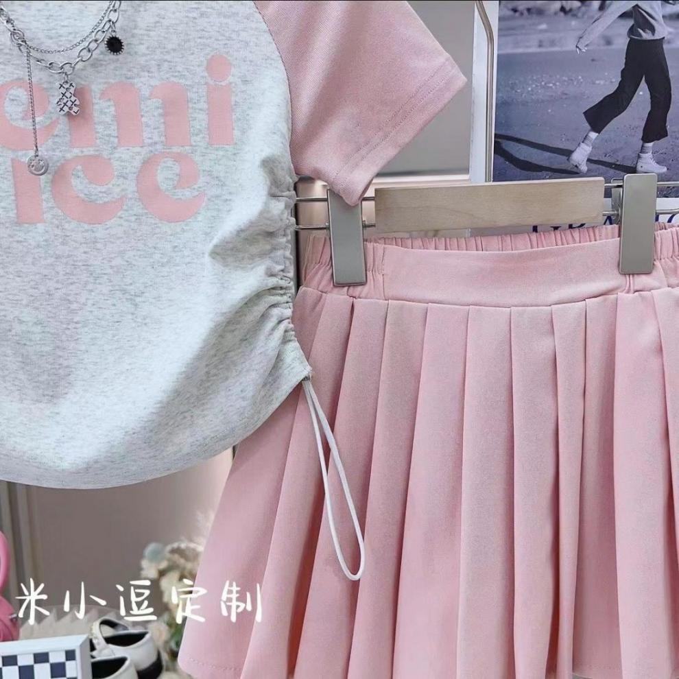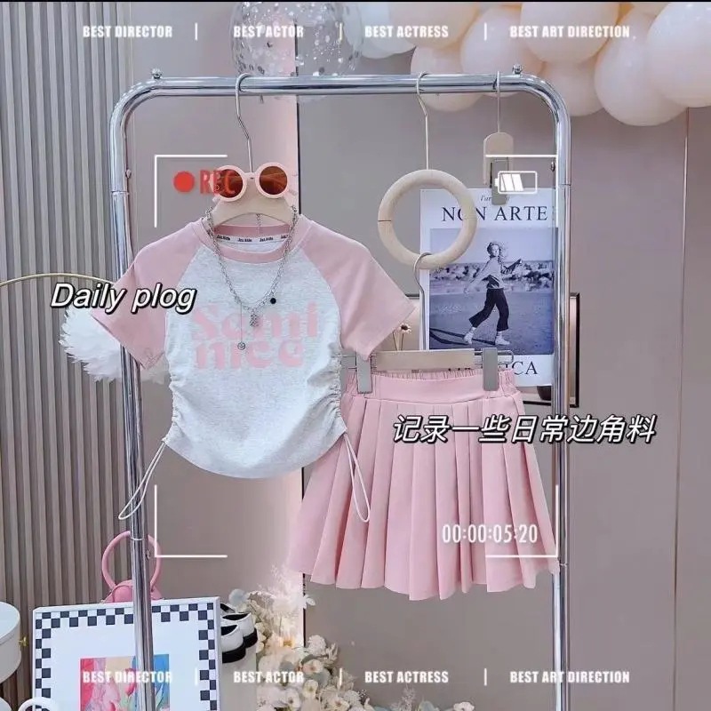 아동복, 여아 패션 정장, 여름옷, 중대형 아동용 반팔 티셔츠, 플리츠 스커트, 여아용 아동 패션 투피스 세트