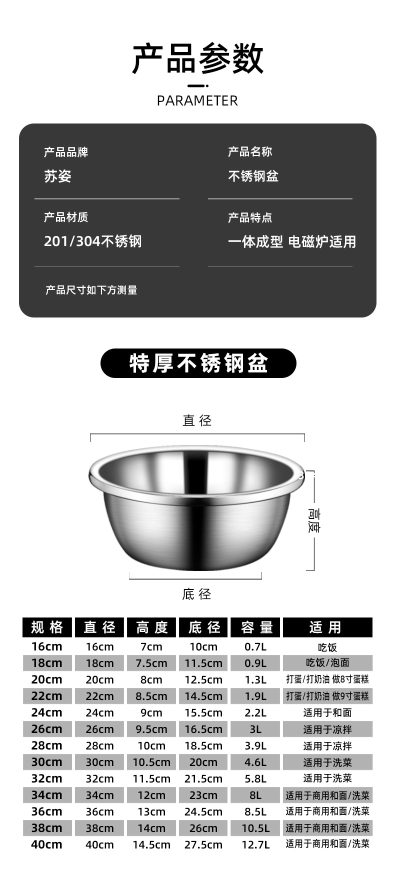 가정용 304 스테인레스 스틸 두꺼운 수프 분지 식품 등급 베이킹 및 계란 구타 분지 주방 쌀 씻기 야채 세척 분지스토어 가기