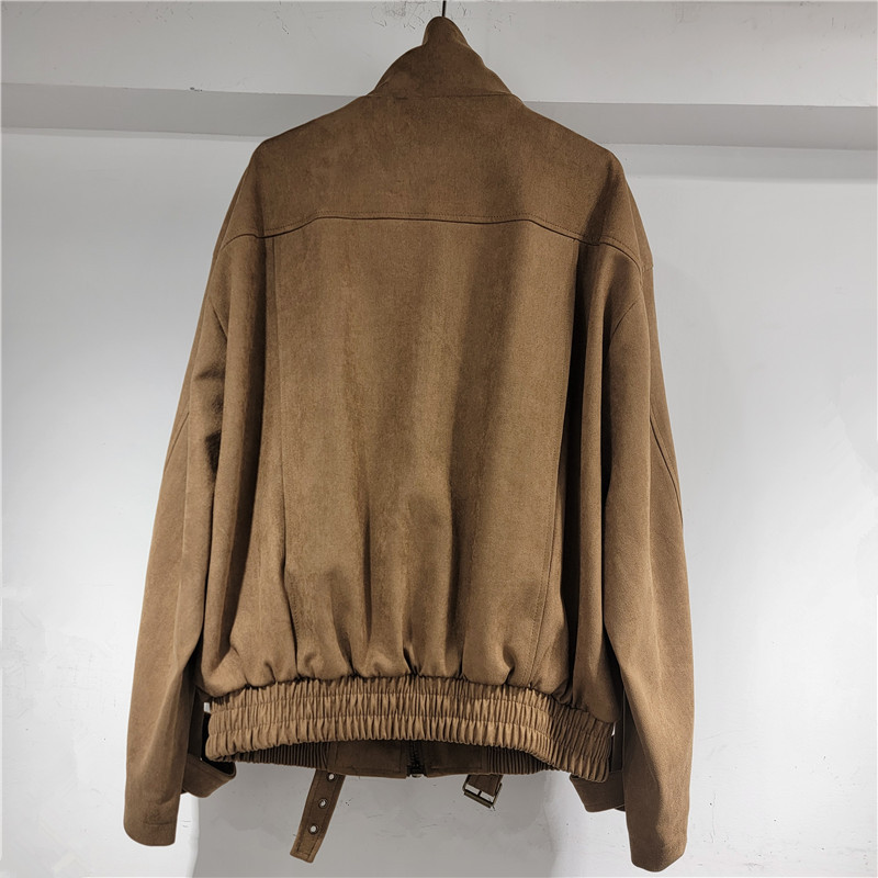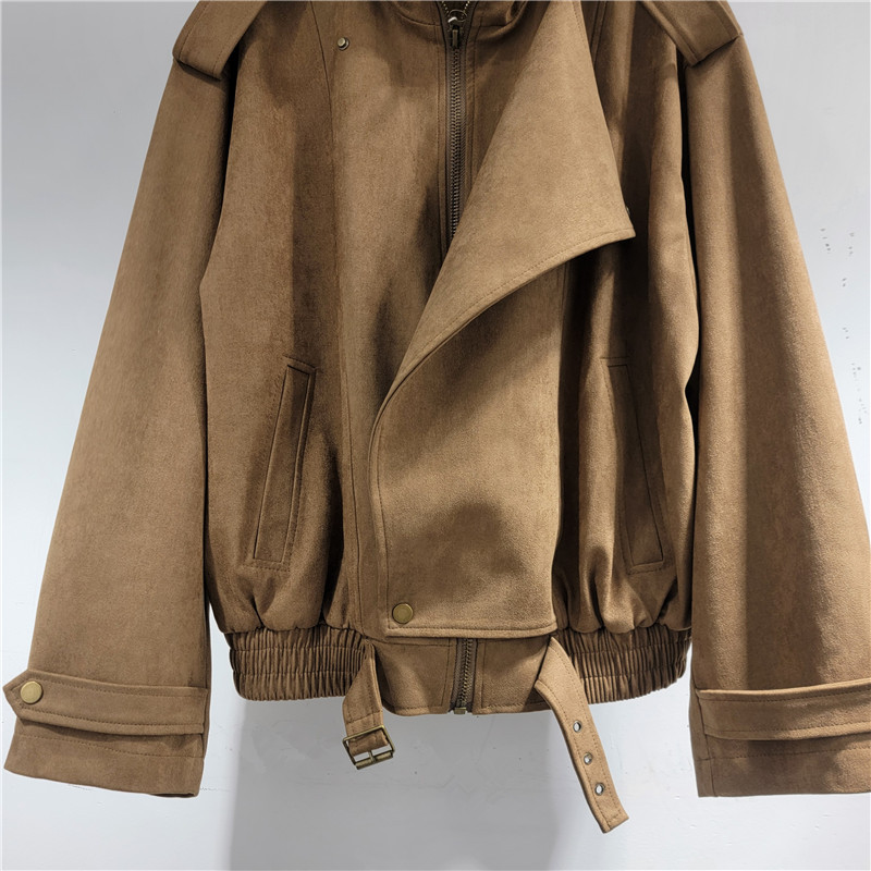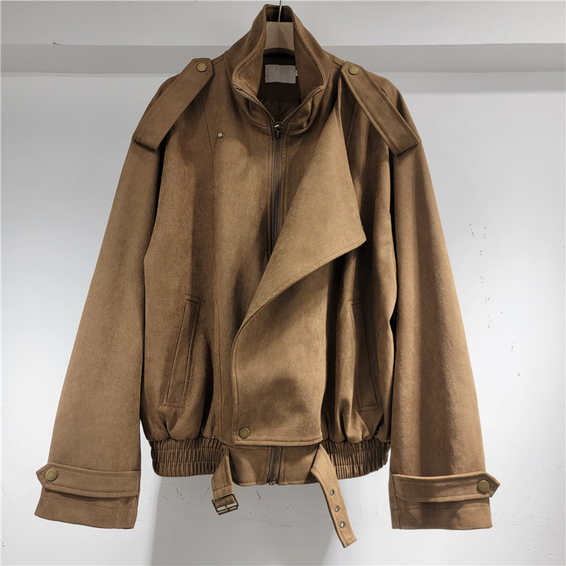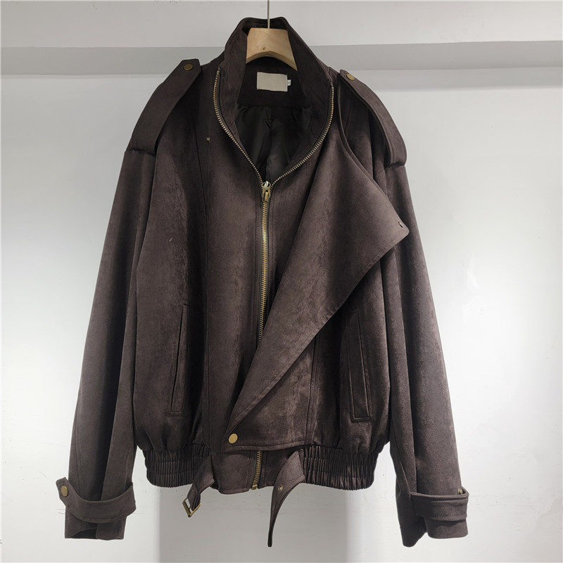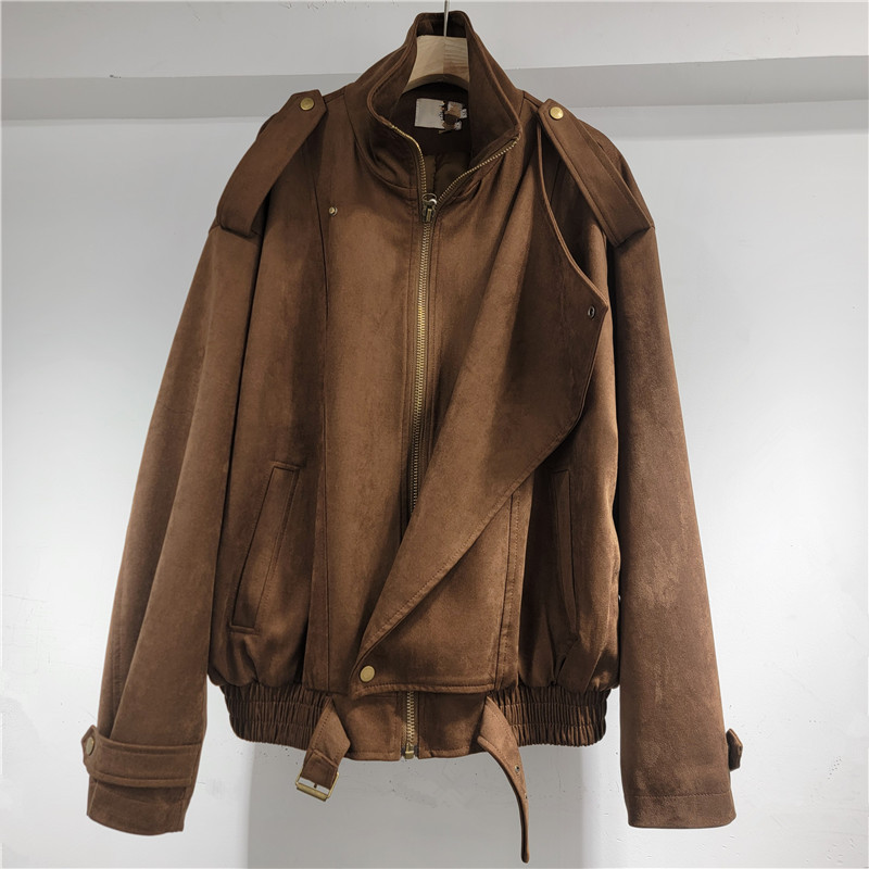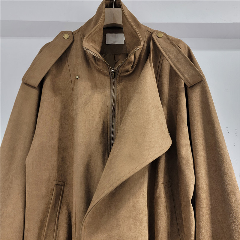 다크 브라운 고급 모조 스웨이드 코트 2025 봄과 가을 패션 짧은 수직 칼라 재킷 미니멀리스트 캐주얼 탑스토어 가기