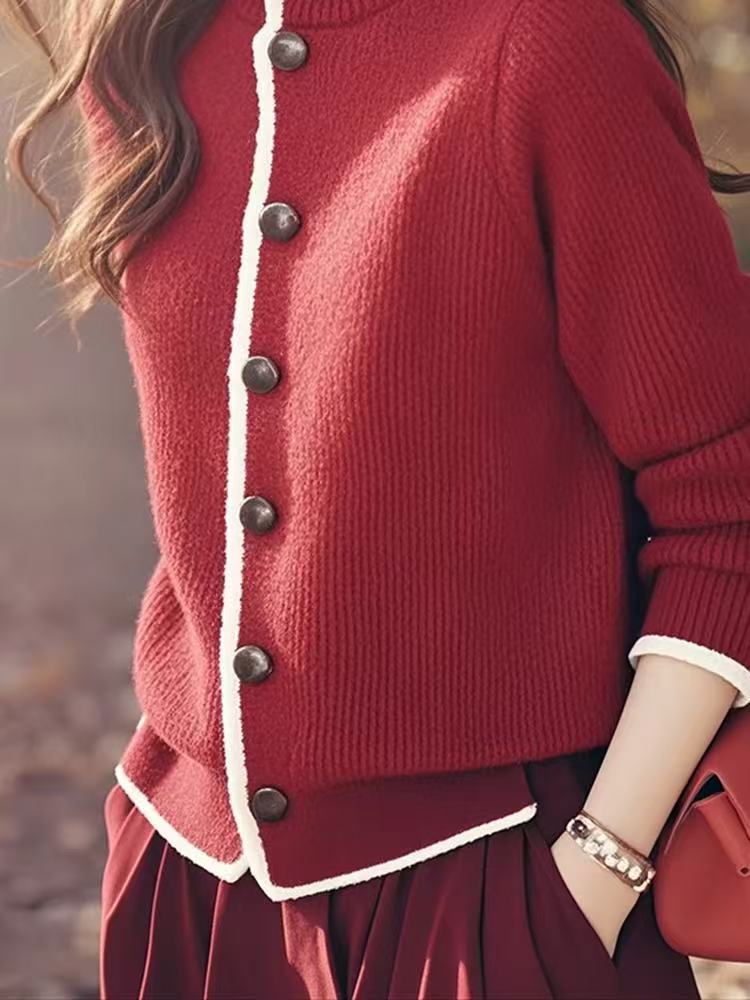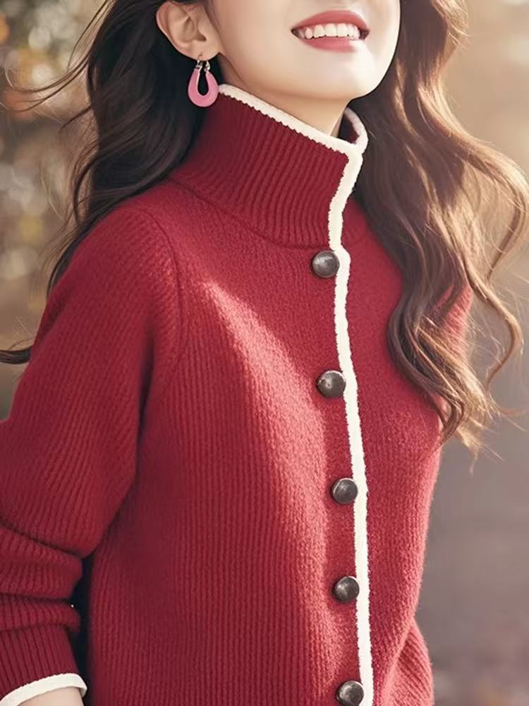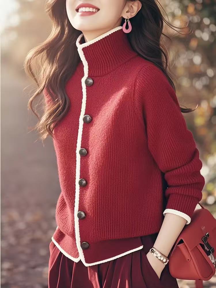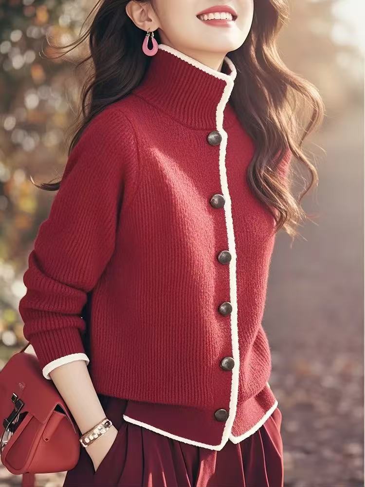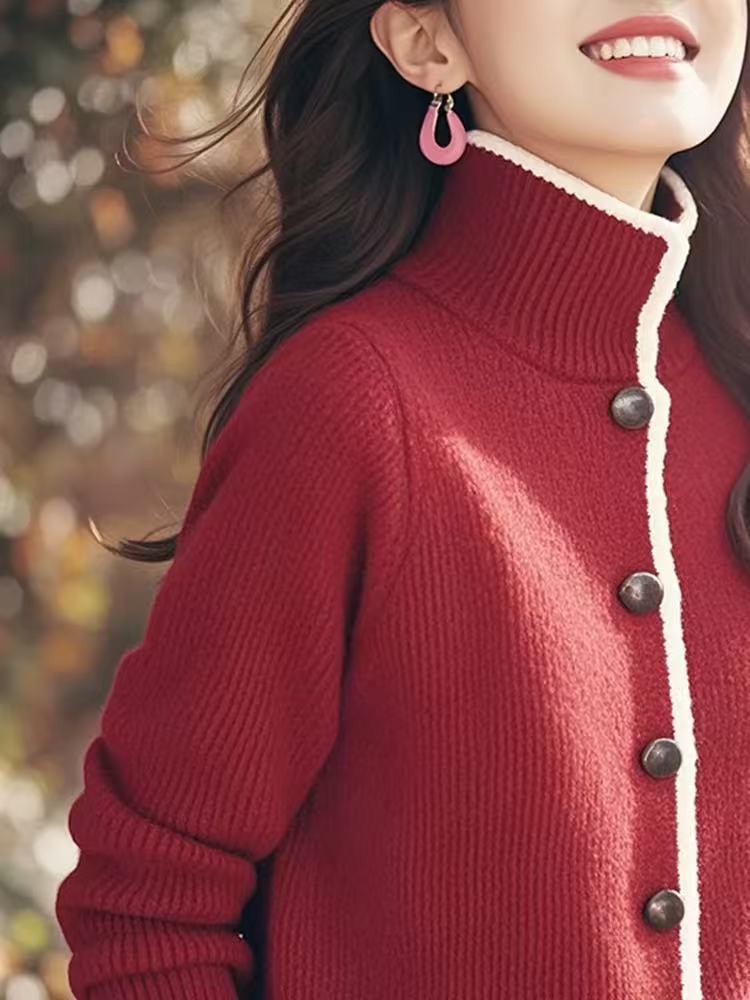 2024 겨울 하이 엔드 슈퍼 잘 생긴 스웨터 하이 엔드 유럽 스타일의 세련된 독특한 레드 하이 칼라 니트 카디건