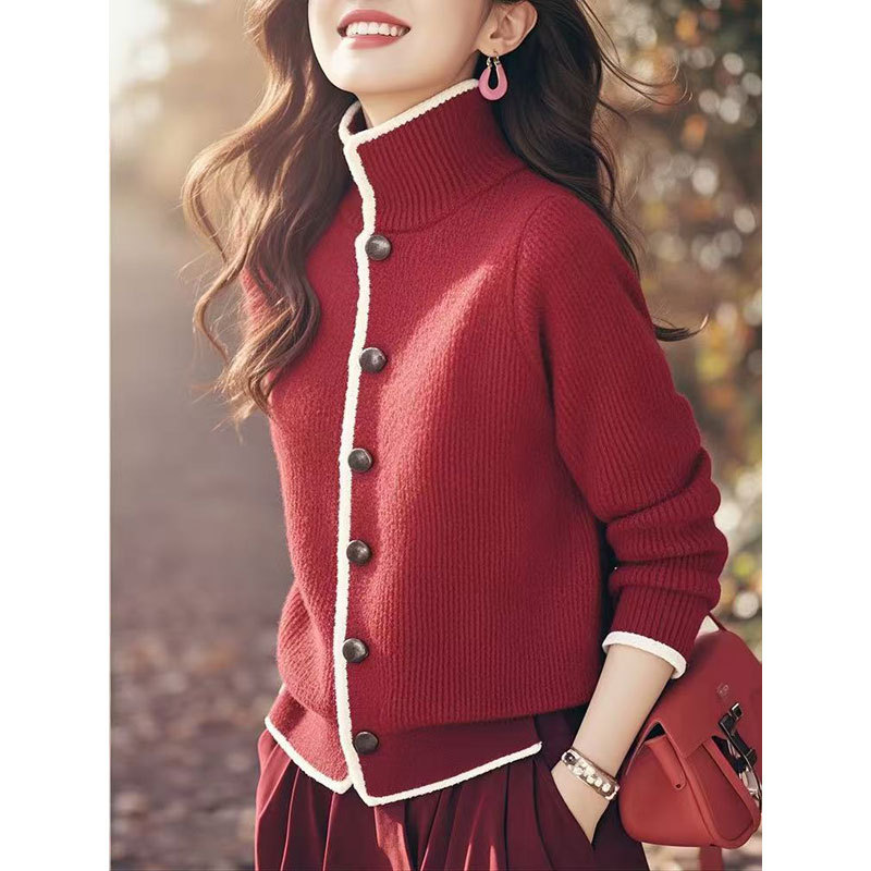 2024 겨울 하이 엔드 슈퍼 잘 생긴 스웨터 하이 엔드 유럽 스타일의 세련된 독특한 레드 하이 칼라 니트 카디건스토어 가기
