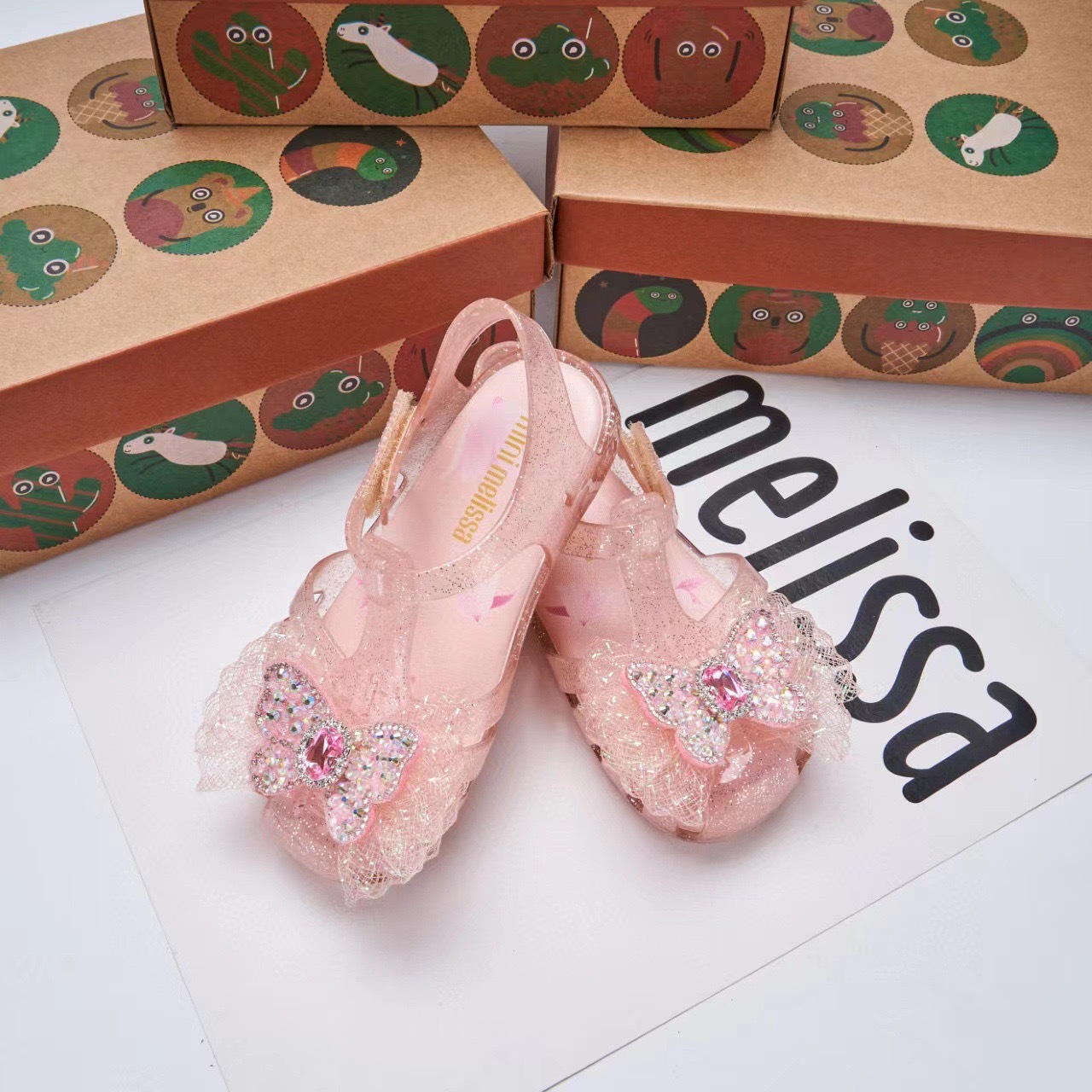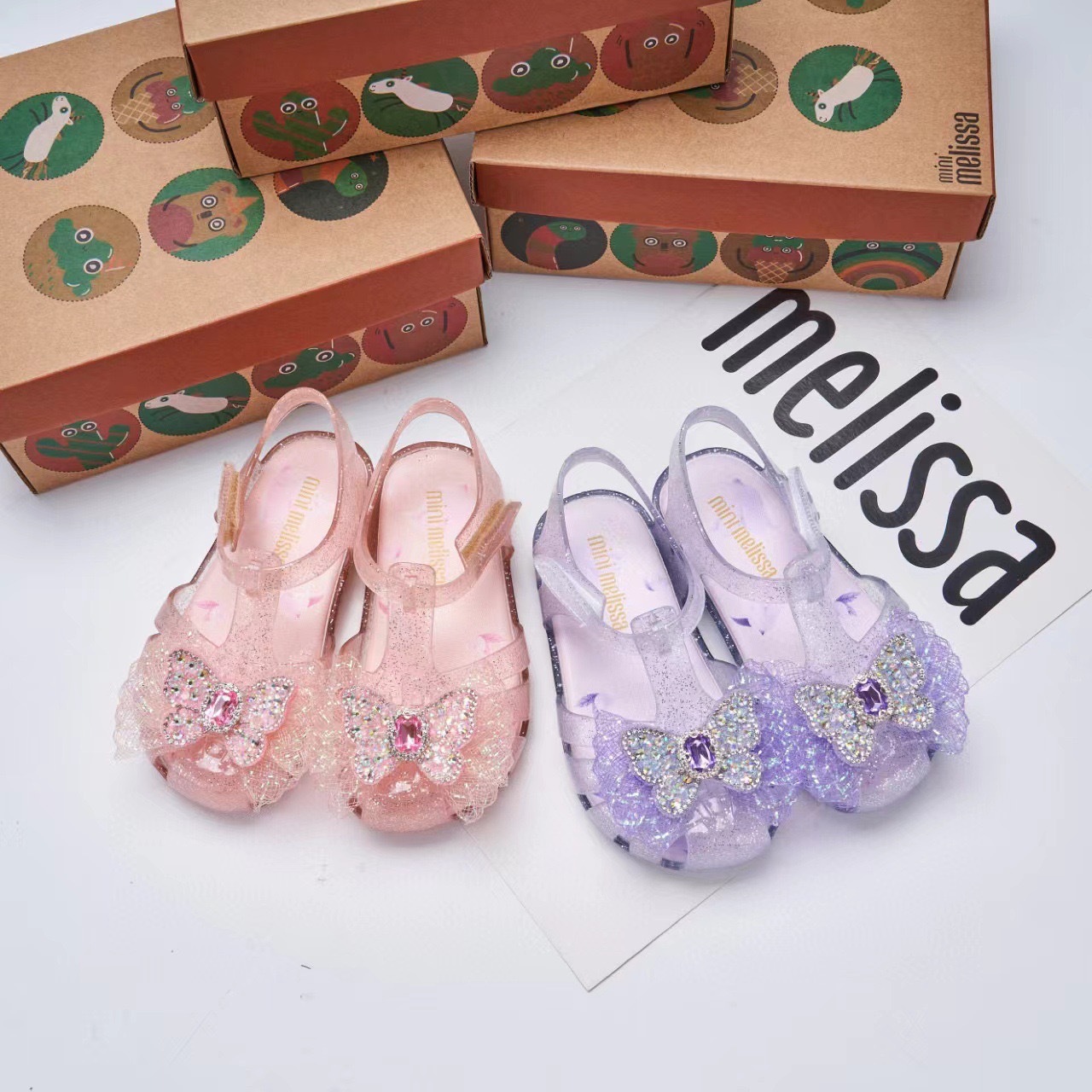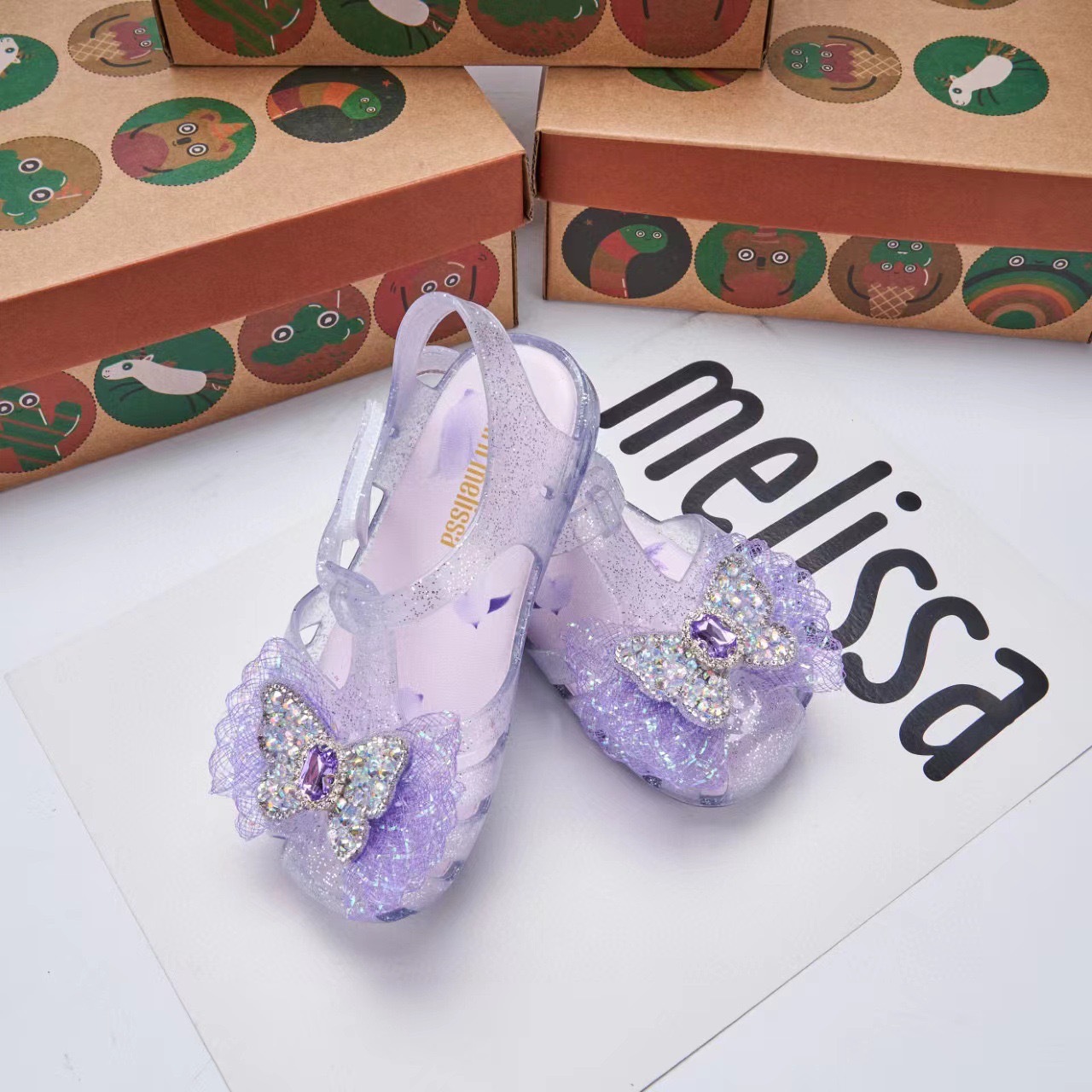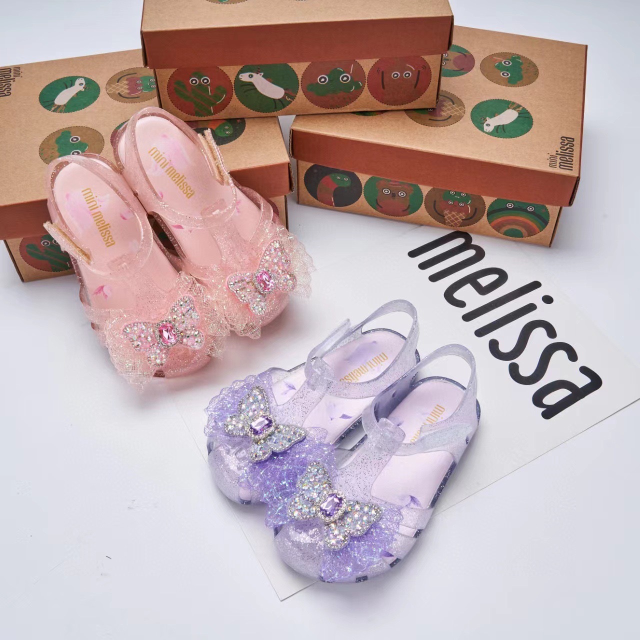 2025 멜리사 새로운 젤리 신발 멜리사 활 어린이 신발 랩 머리 나비 라인스톤 비치 샌들 여성용스토어 가기