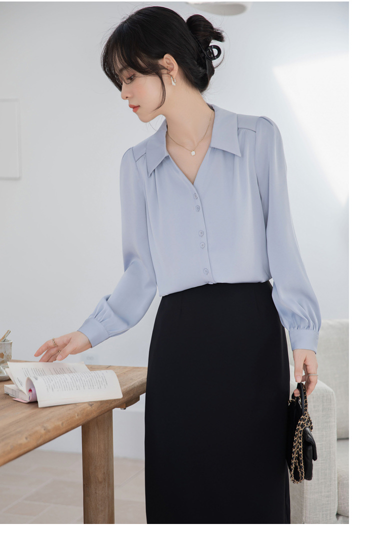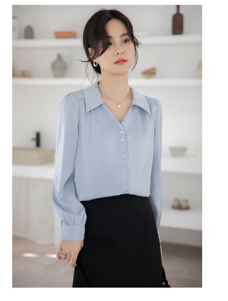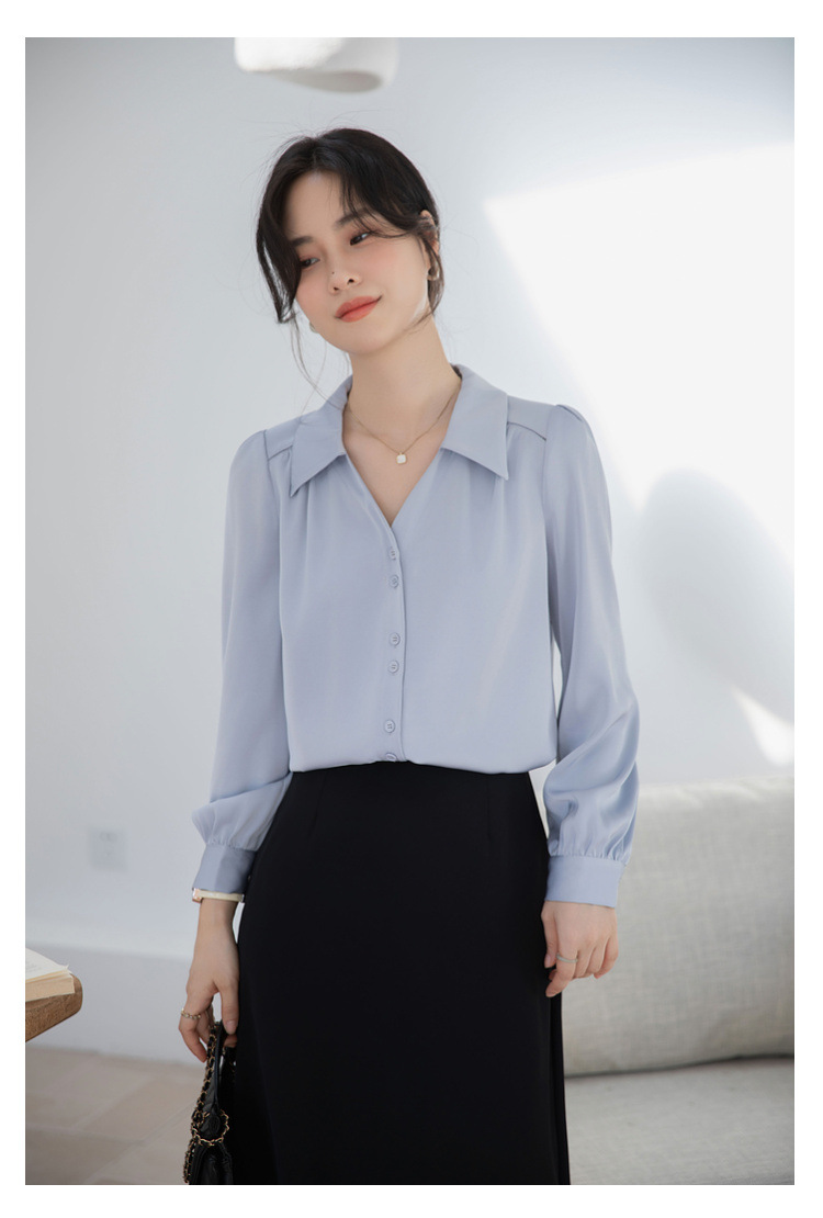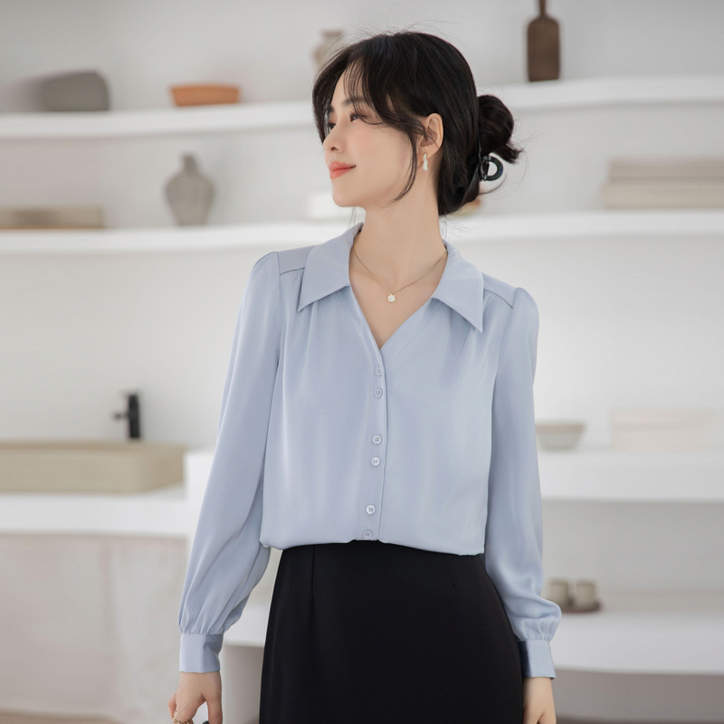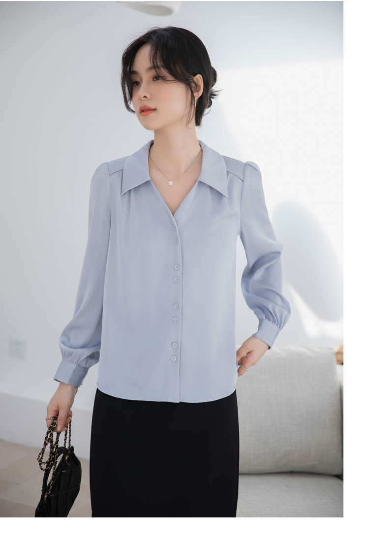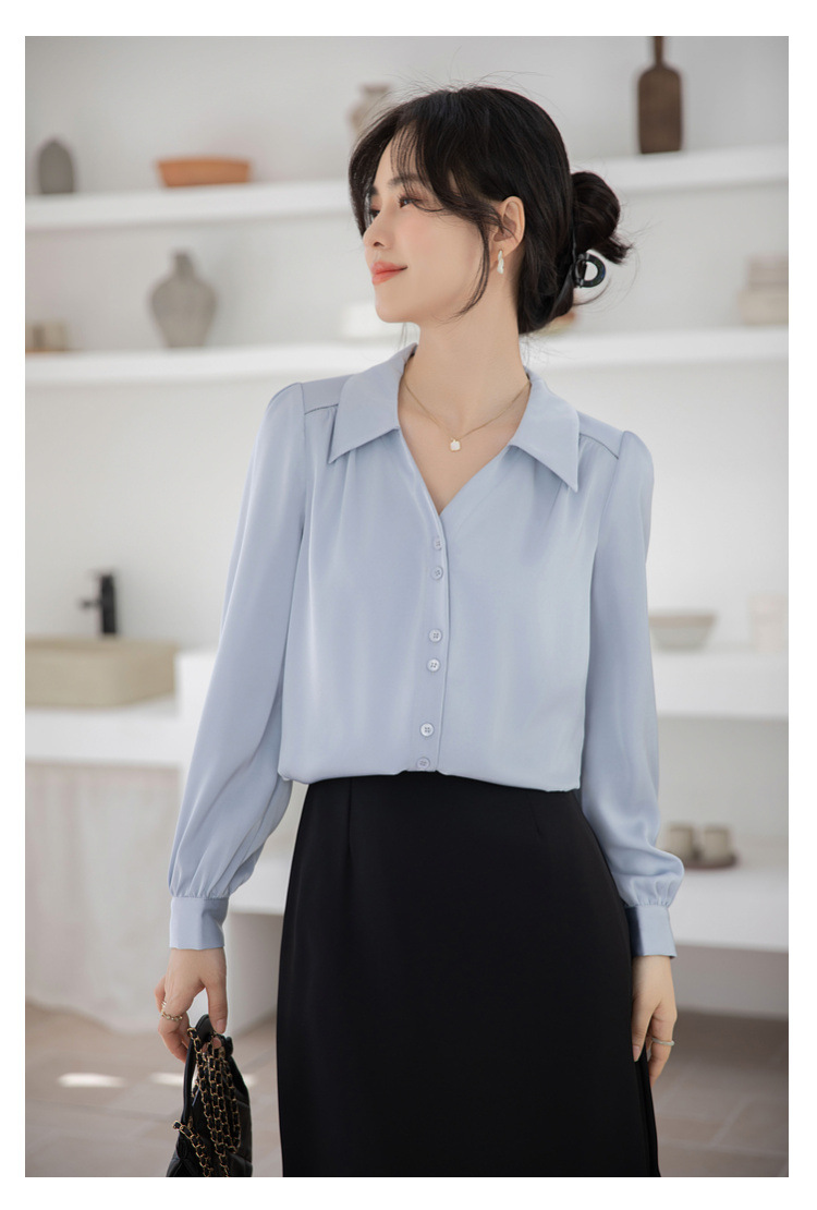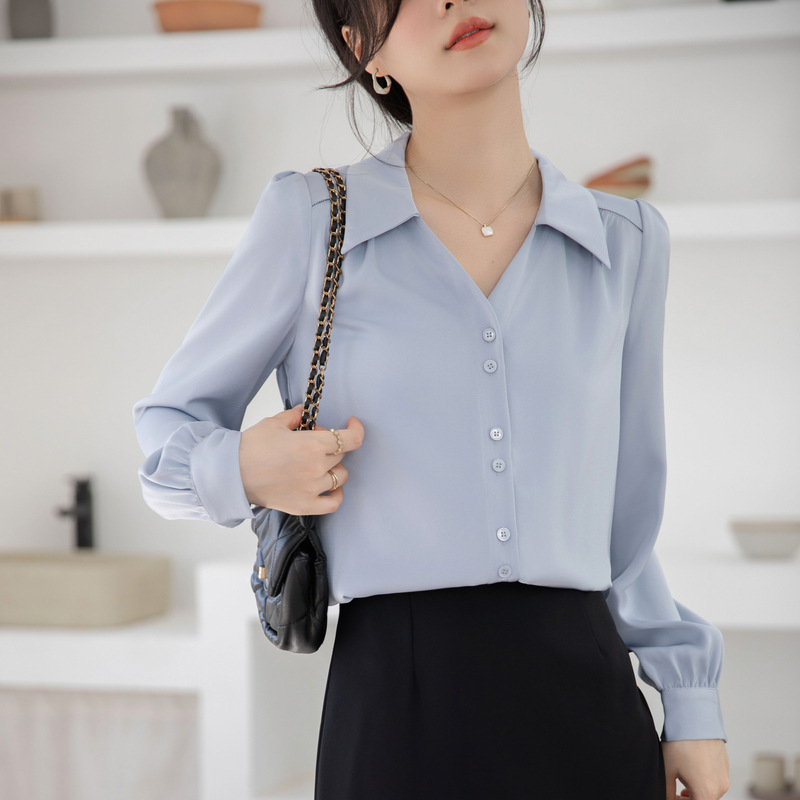 봄 2025 블루 새틴 셔츠 여성 V 넥 셔츠 전문 기질 원피스 인터뷰 느슨한 퍼프 슬리브 탑스토어 가기