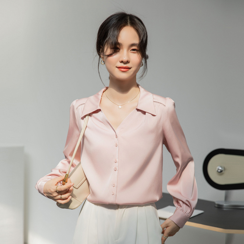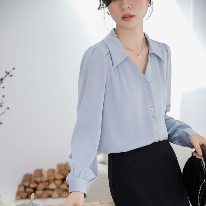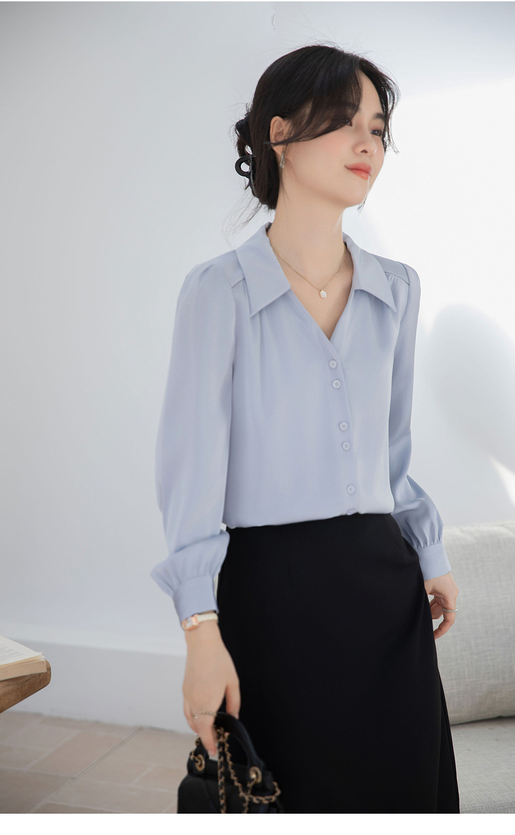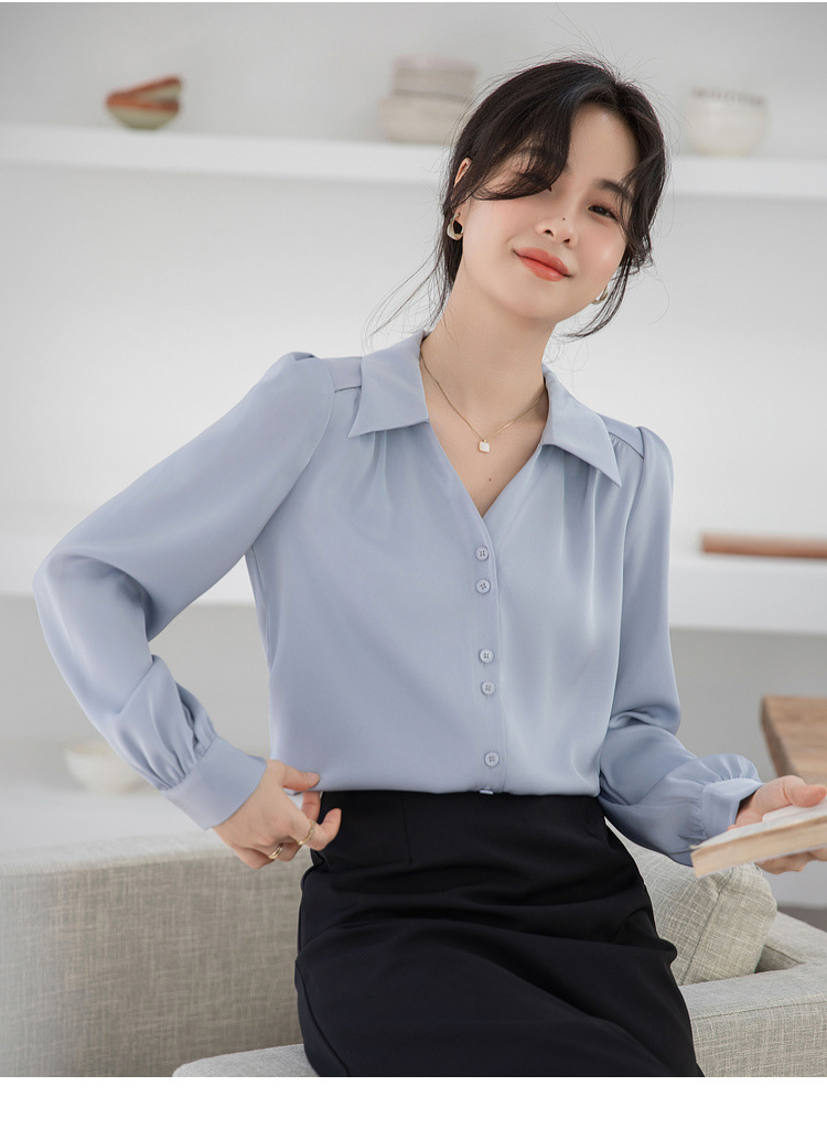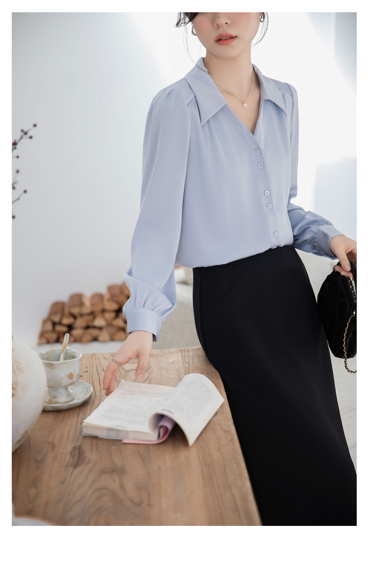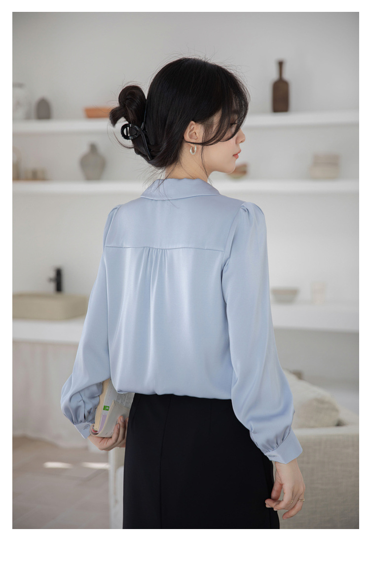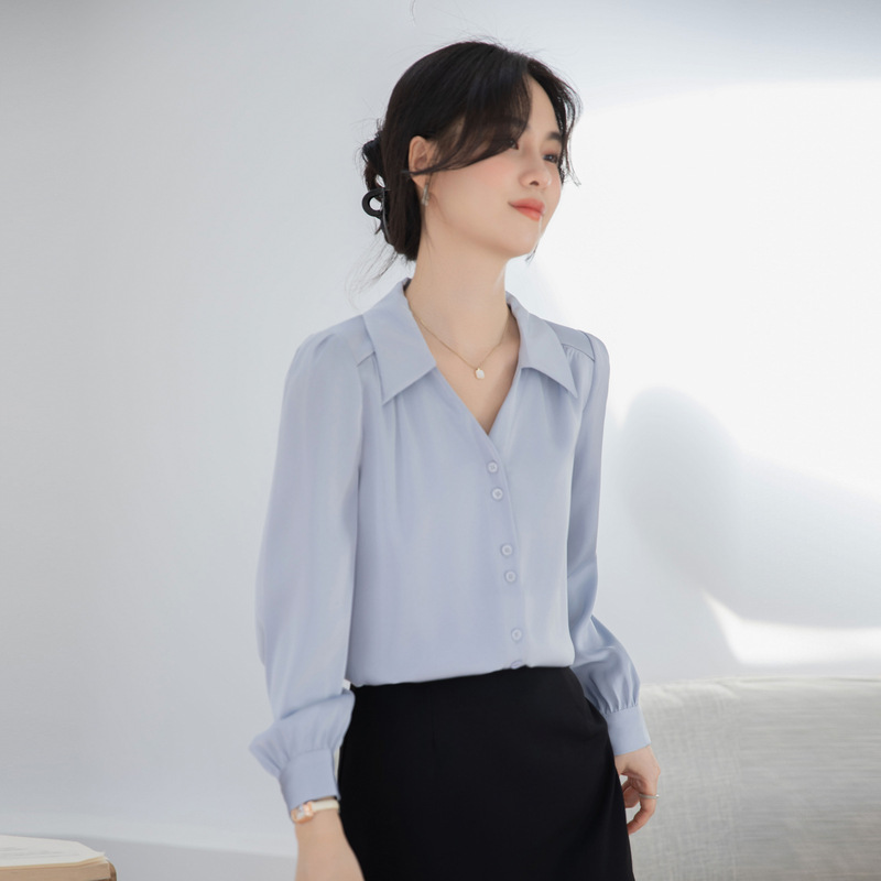 봄 2025 블루 새틴 셔츠 여성 V 넥 셔츠 전문 기질 원피스 인터뷰 느슨한 퍼프 슬리브 탑스토어 가기