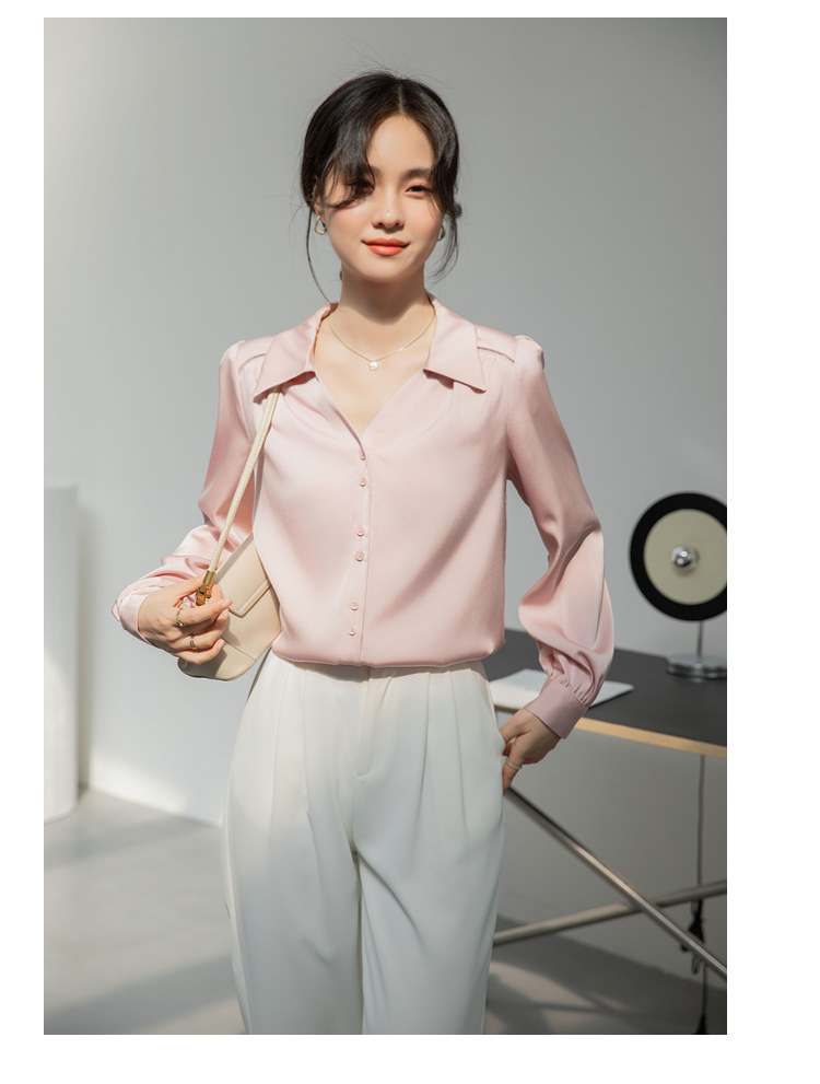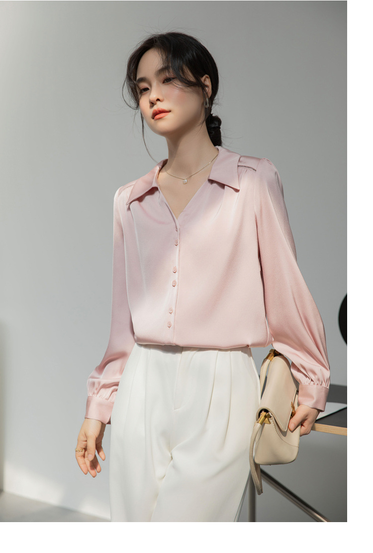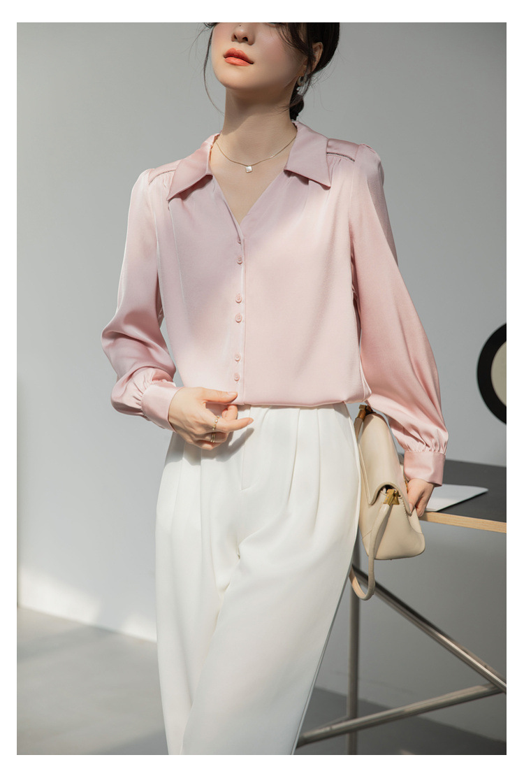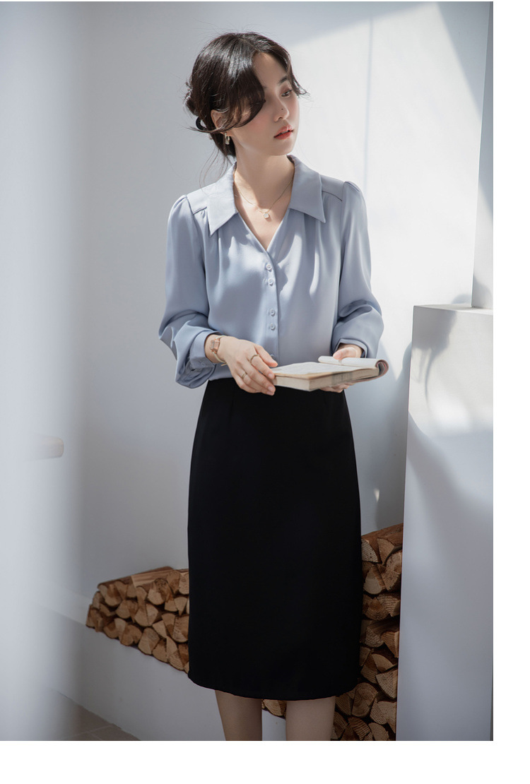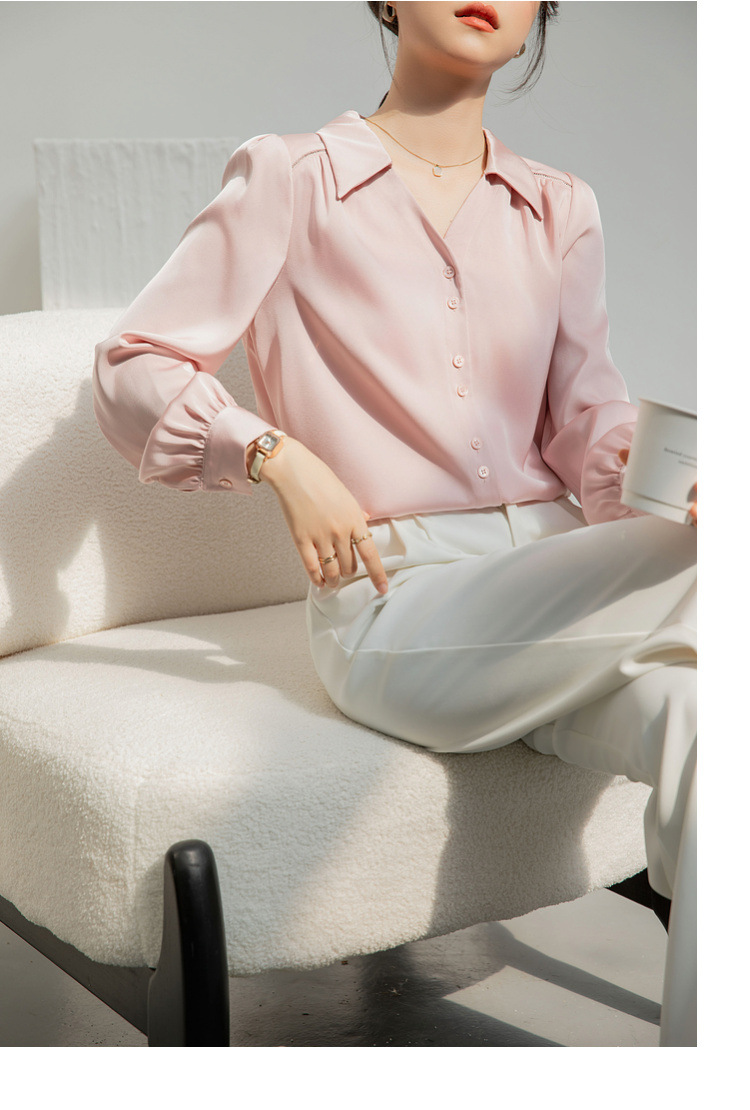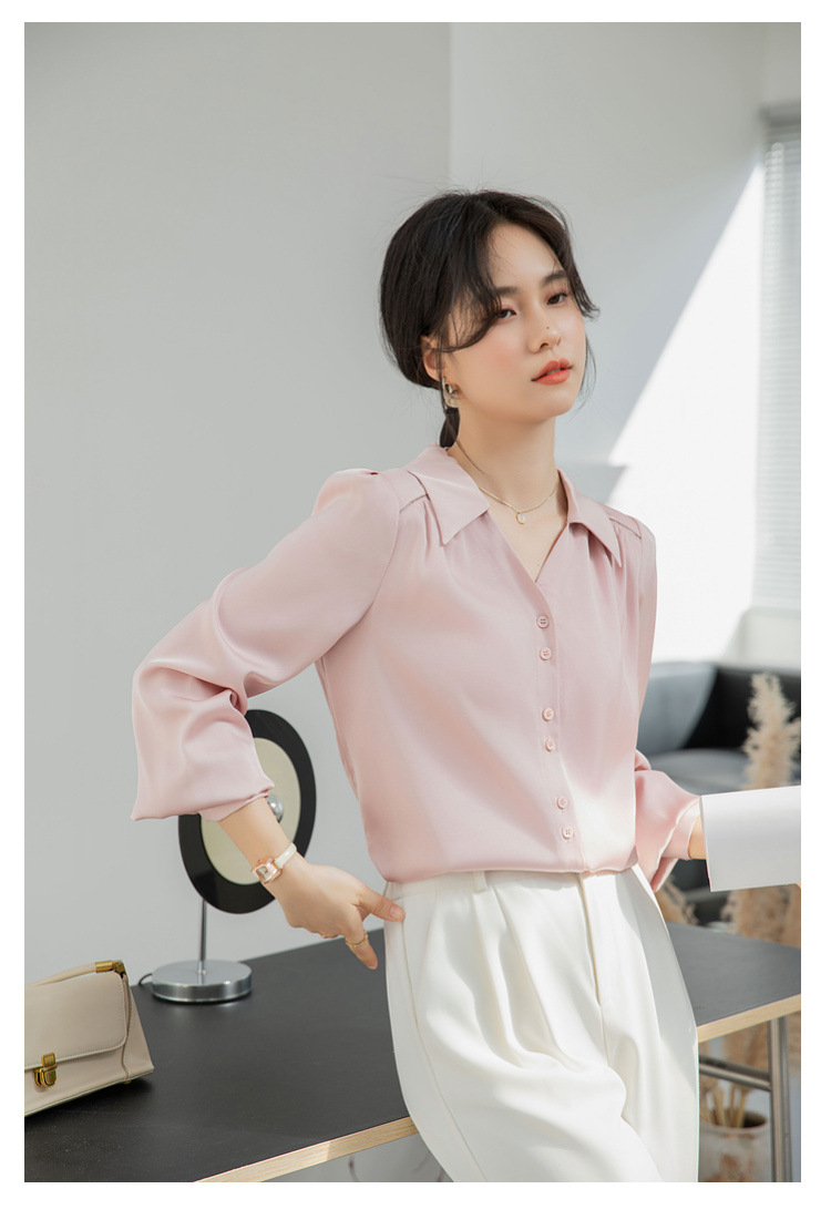 봄 2025 블루 새틴 셔츠 여성 V 넥 셔츠 전문 기질 원피스 인터뷰 느슨한 퍼프 슬리브 탑스토어 가기