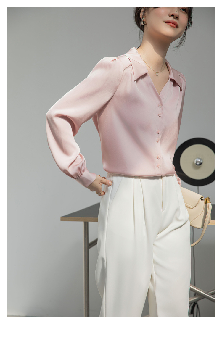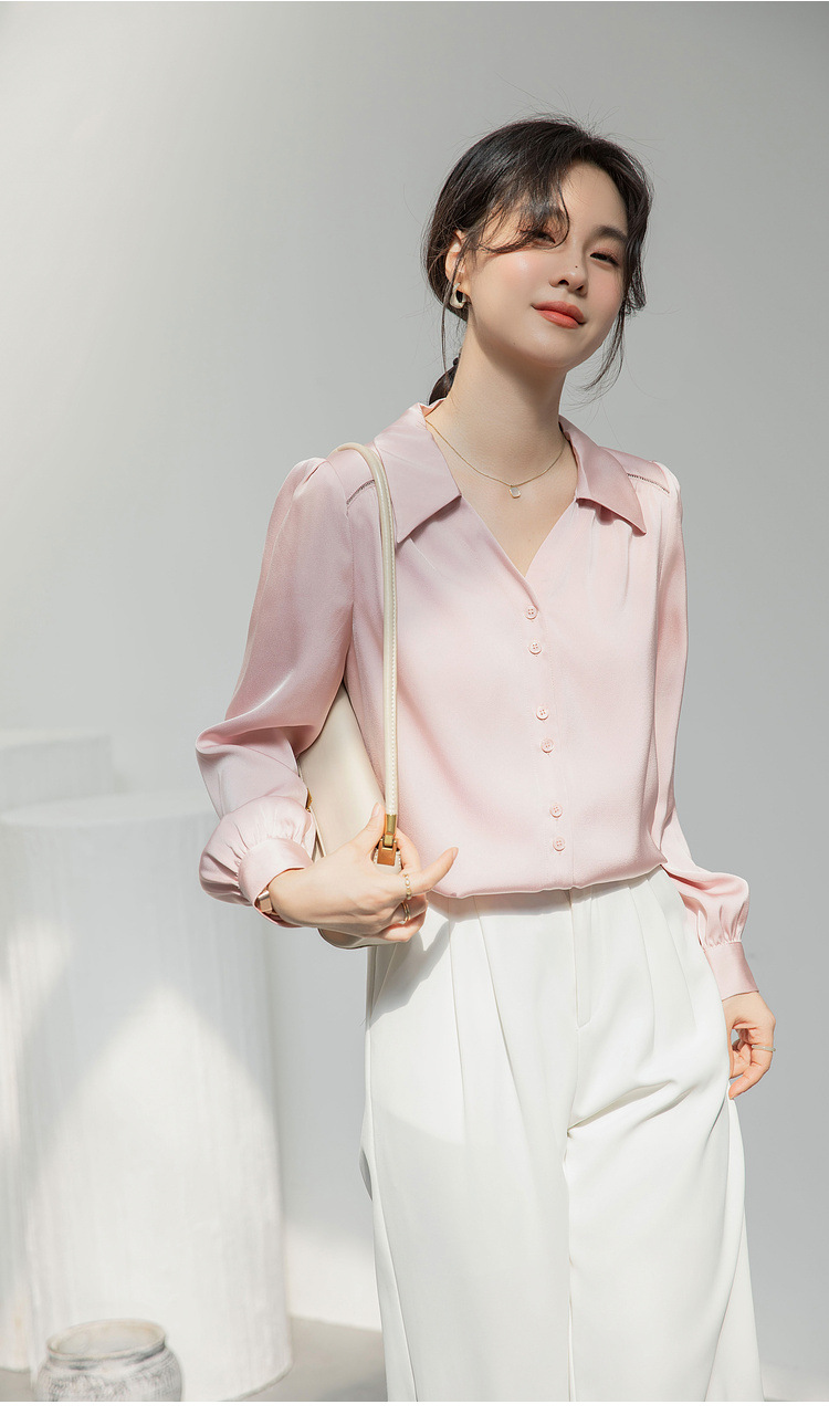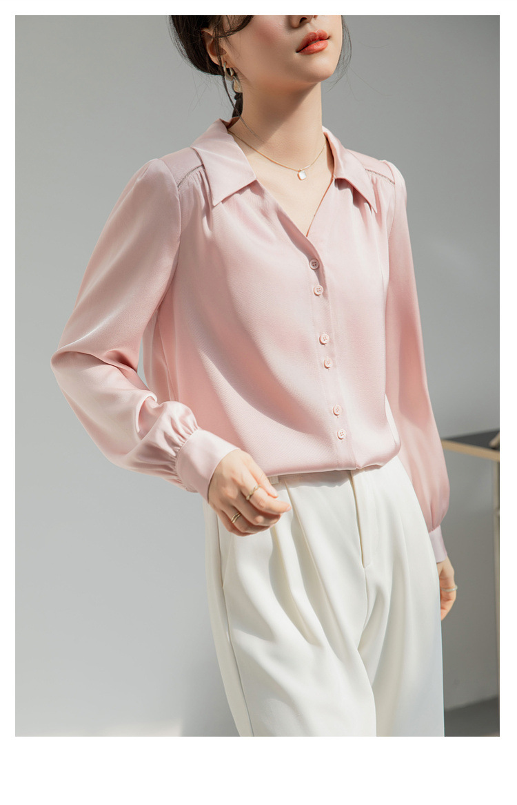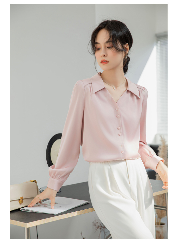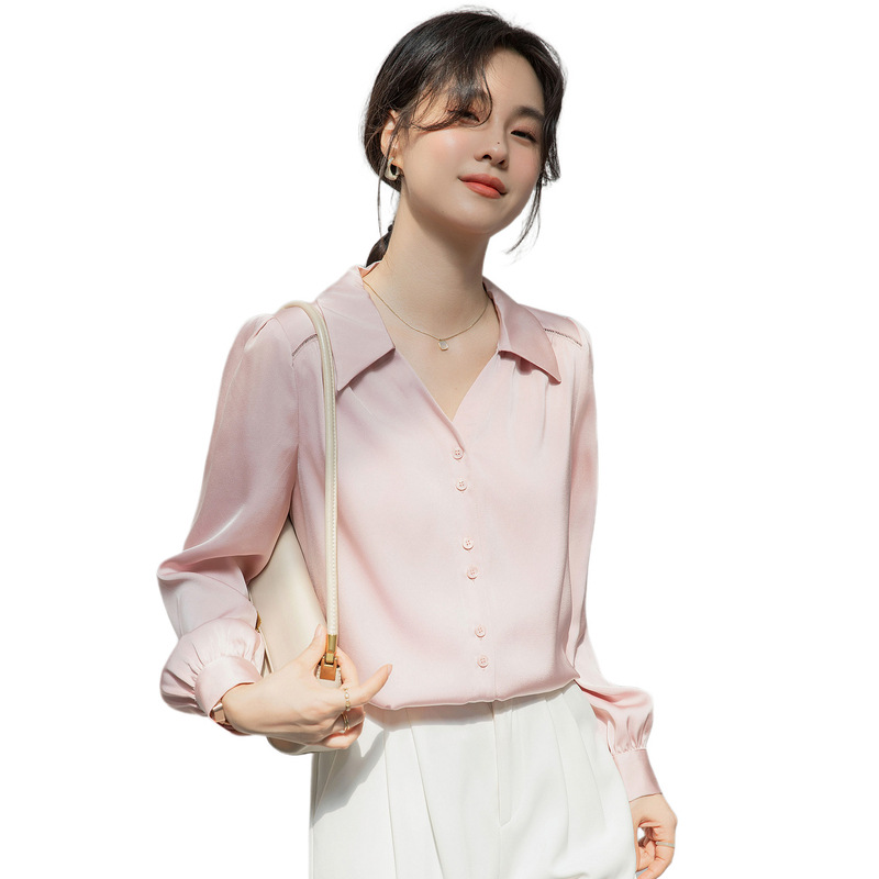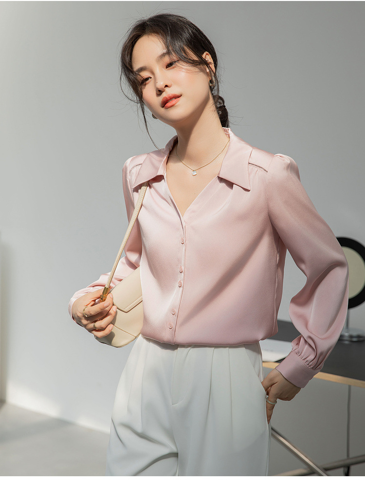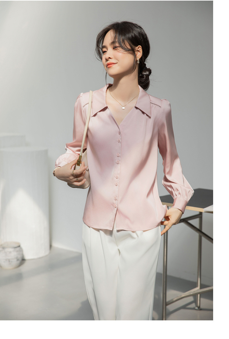 봄 2025 블루 새틴 셔츠 여성 V 넥 셔츠 전문 기질 원피스 인터뷰 느슨한 퍼프 슬리브 탑스토어 가기