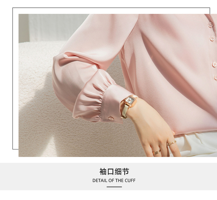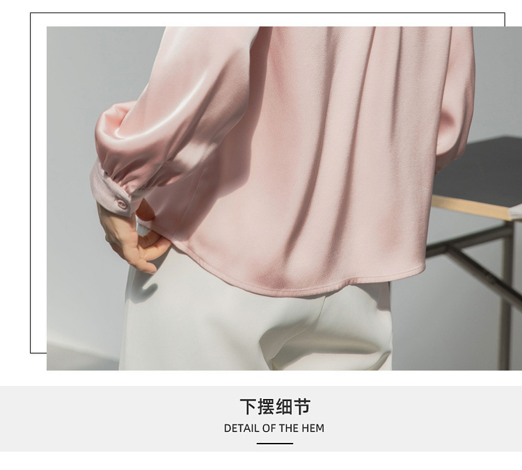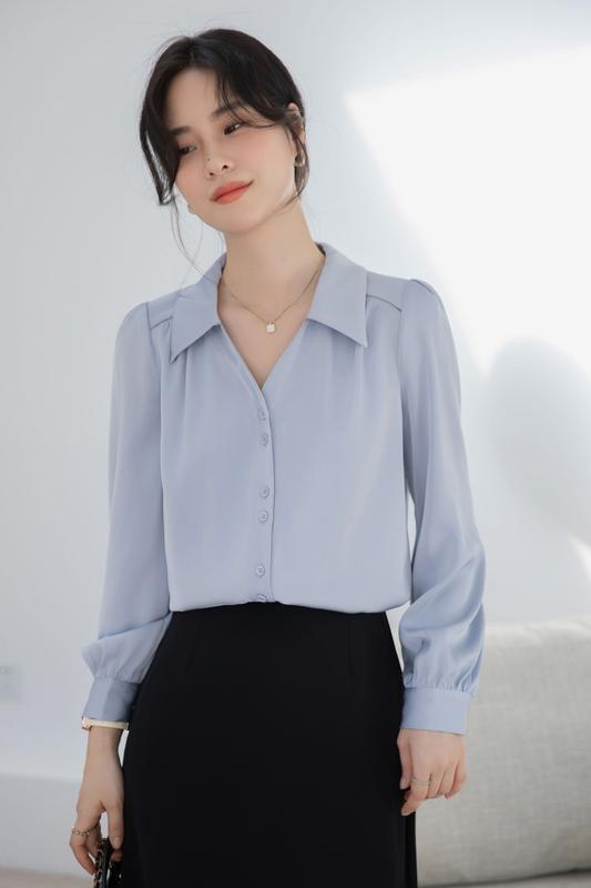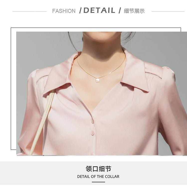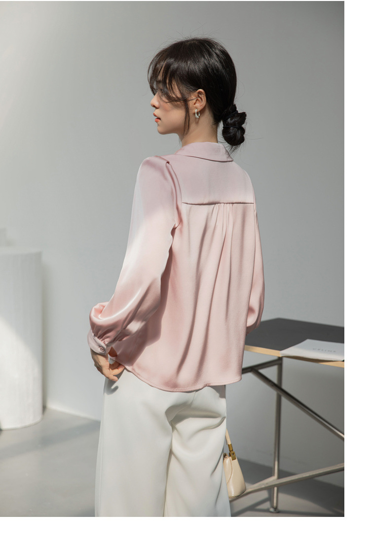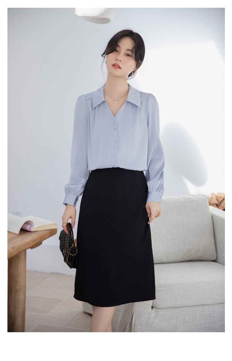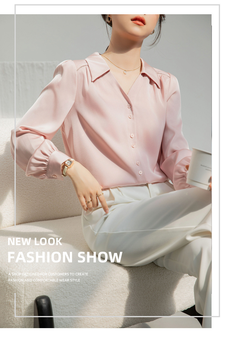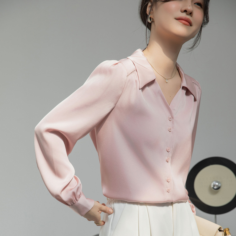 봄 2025 블루 새틴 셔츠 여성 V 넥 셔츠 전문 기질 원피스 인터뷰 느슨한 퍼프 슬리브 탑스토어 가기
