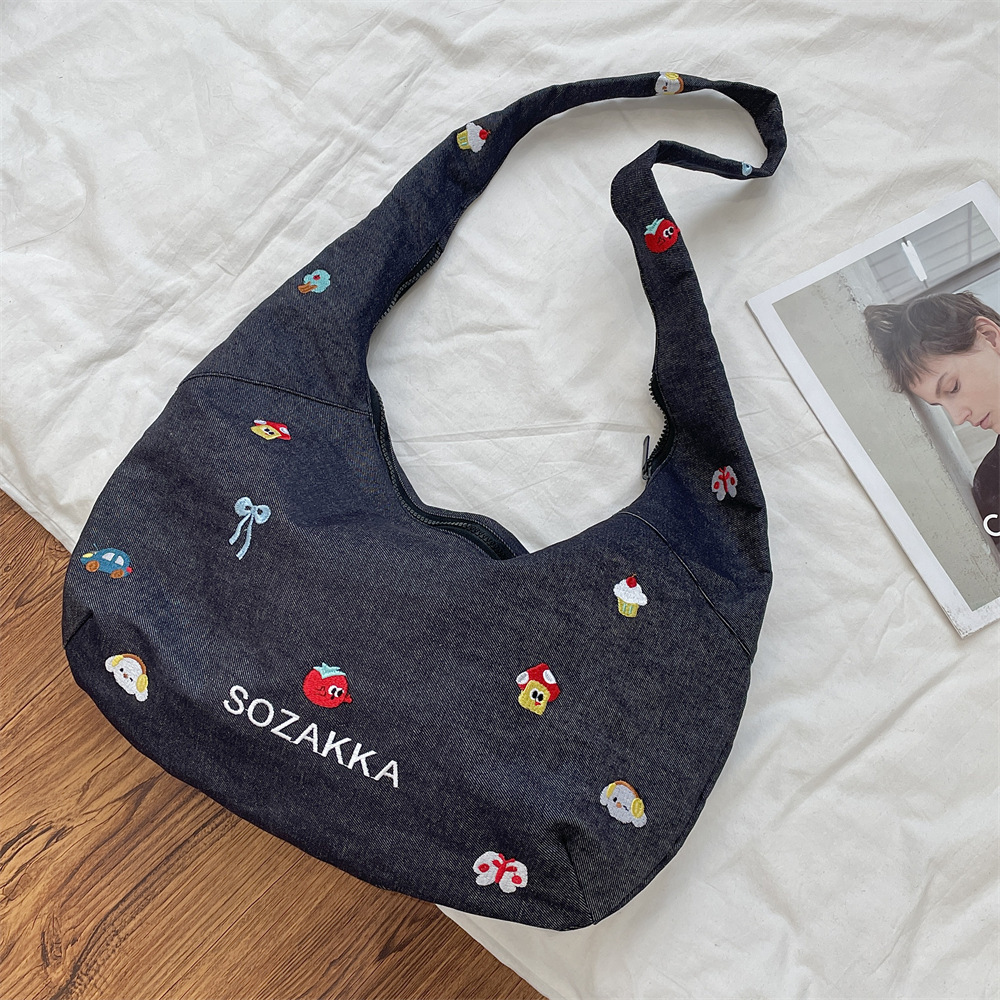 52232 데님 크로스바디백 여자 올매치 한국식 자수 숄더 토트 백의 간단한 학생 헝겊 가방