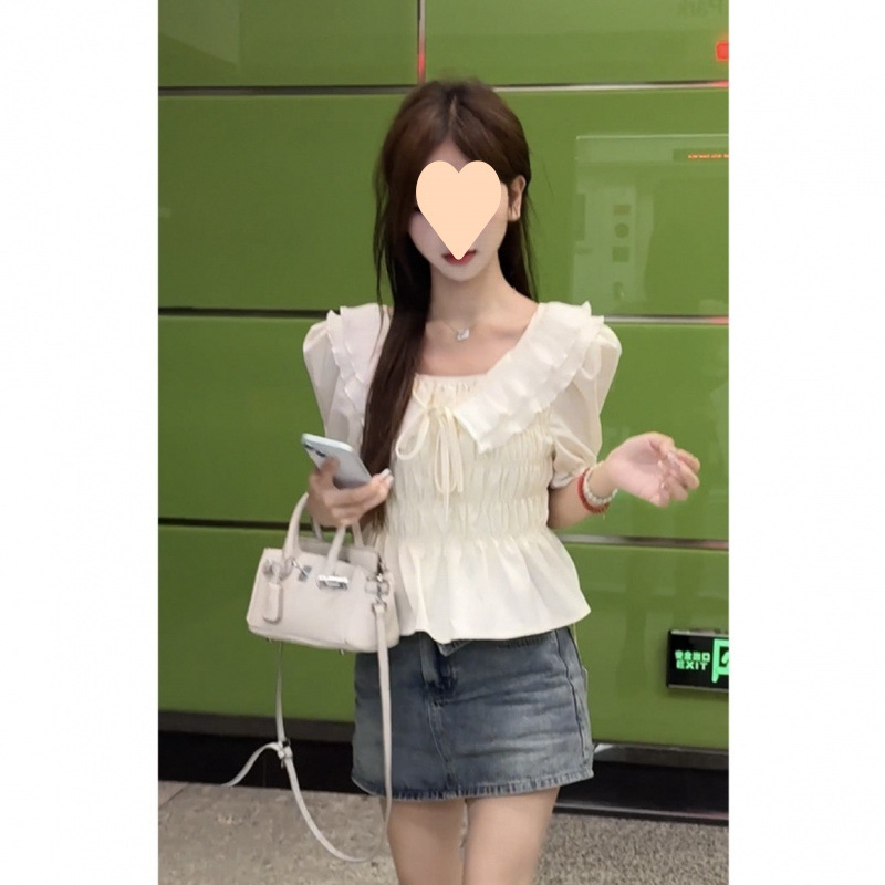 한국식 퍼프 슬리브 여름 프랑스 스타일 달콤한 러플 인형 칼라 짧은 소매 여성의 스타일리시 나이 감소 주름 허리 슬리밍스토어 가기