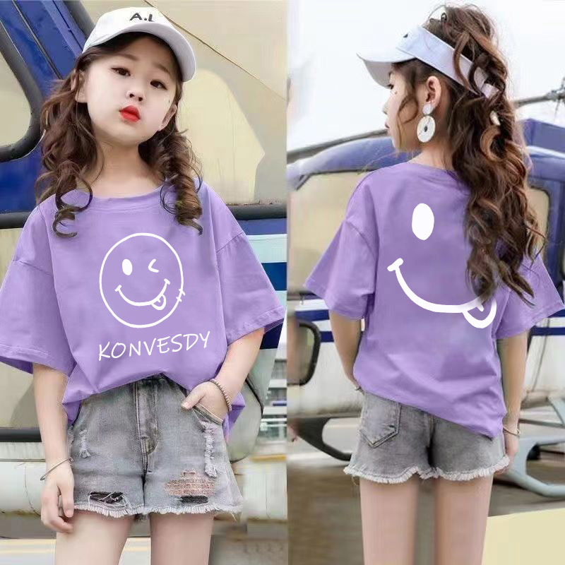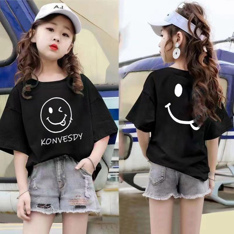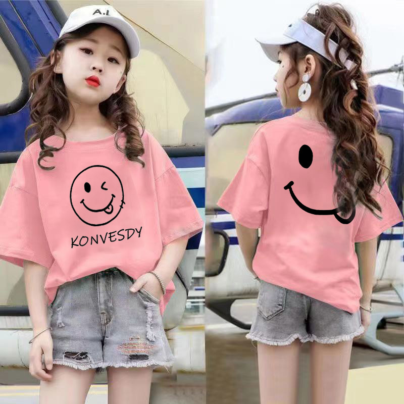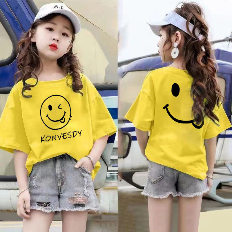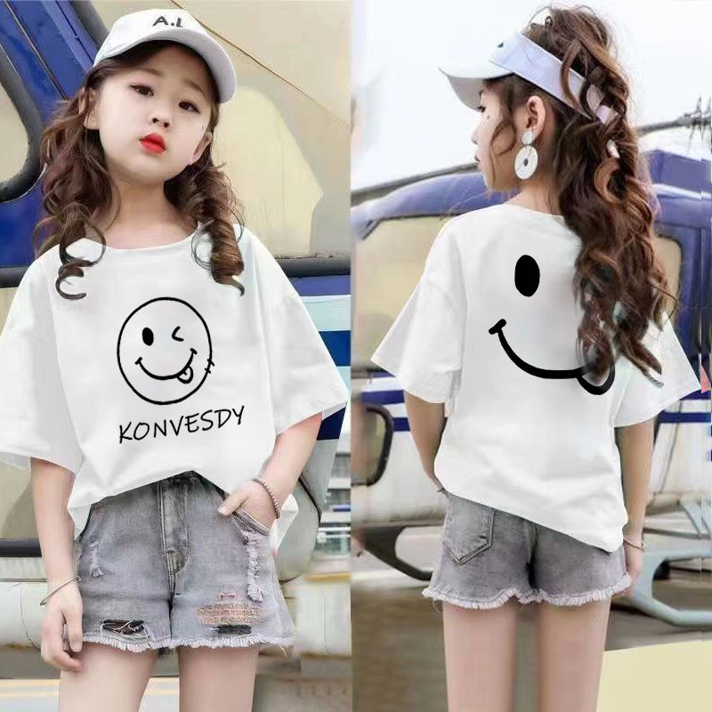 여자 여름 코튼 반팔 티셔츠 크루 넥 스마일리 인쇄 한국 스타일 유행 캐주얼 루즈 탑 Ins