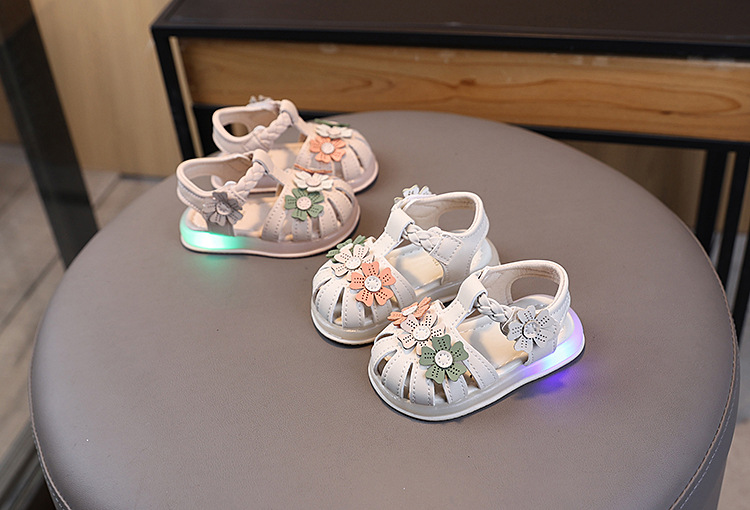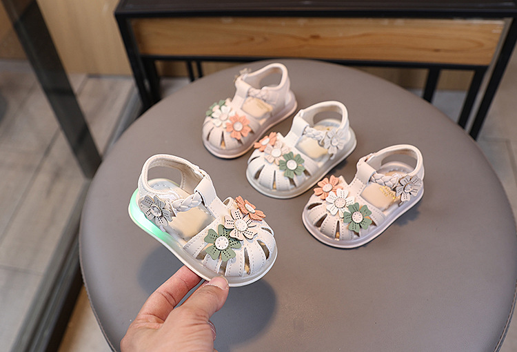 여름 새로운 밝은 조명 아기 소녀 유아 신발 1-2 세 어린이 공주 신발 커버 발가락 안티 킥 꽃 샌들스토어 가기