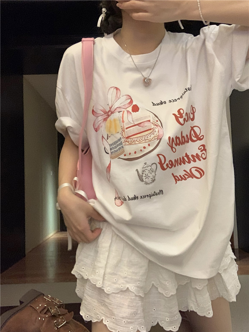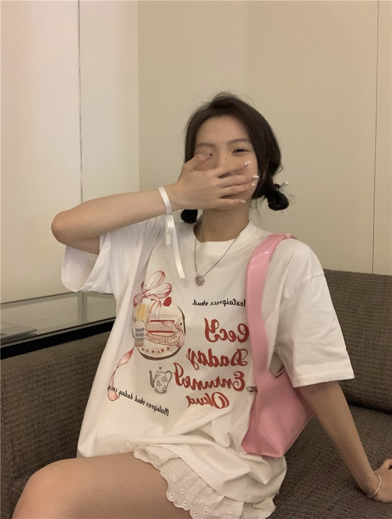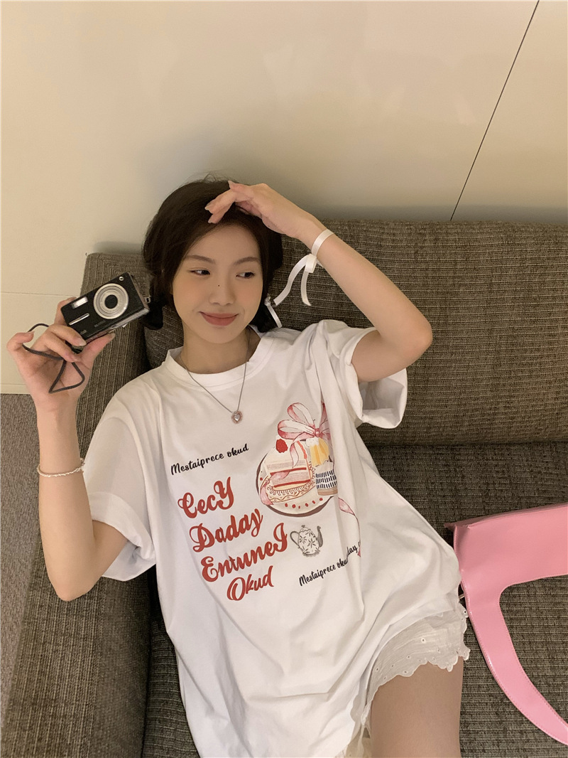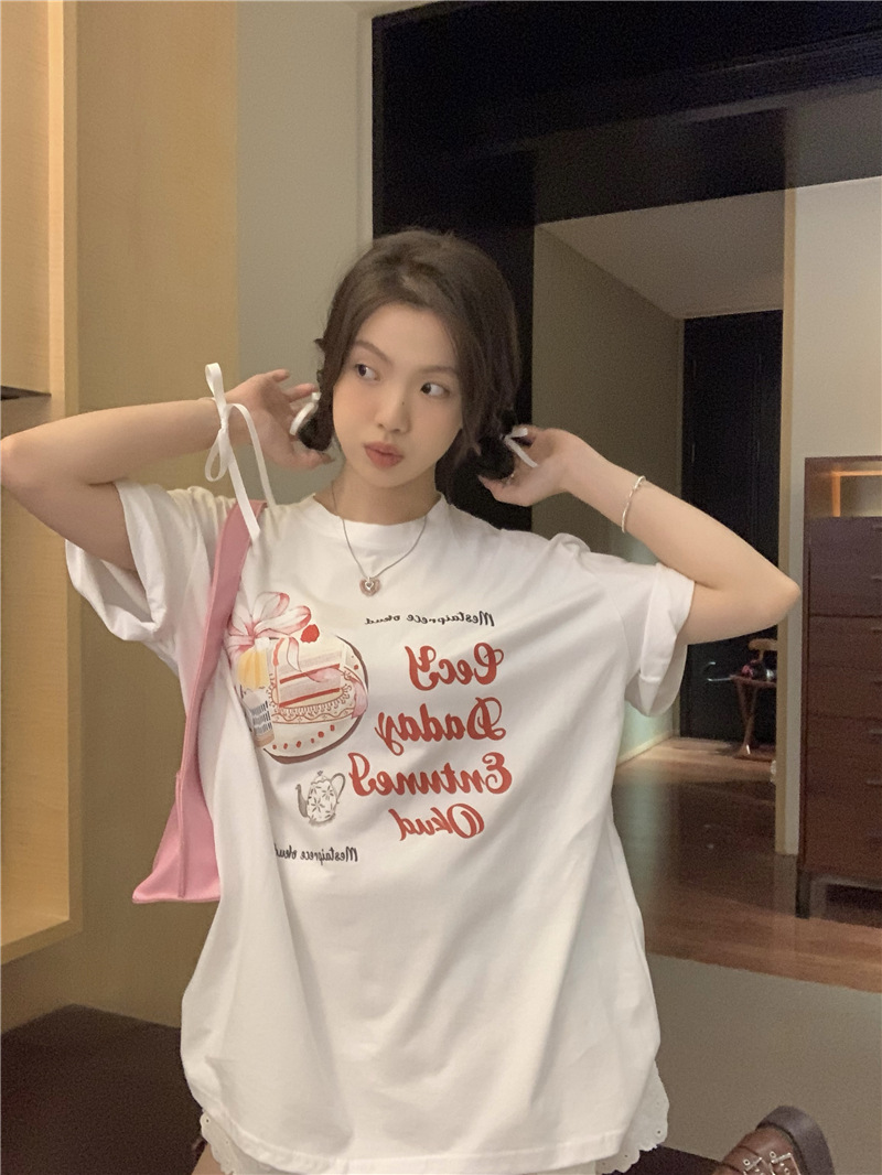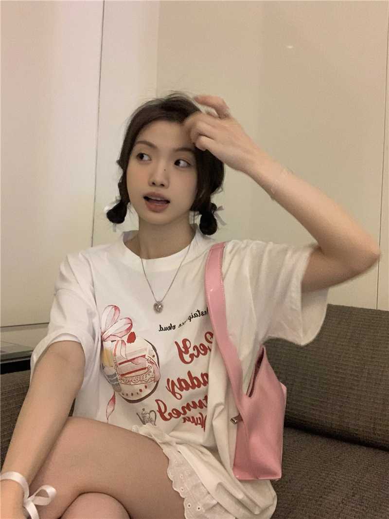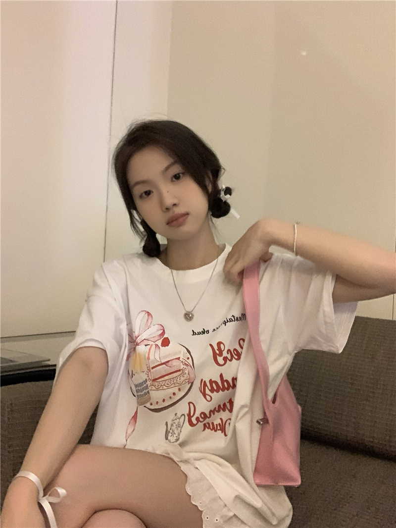 리얼 샷 ~ 일본 소녀 케이크 편지 인쇄 느슨한 반팔 티셔츠 캐주얼 다용도 연령 감소 재킷 조수 77338스토어 가기