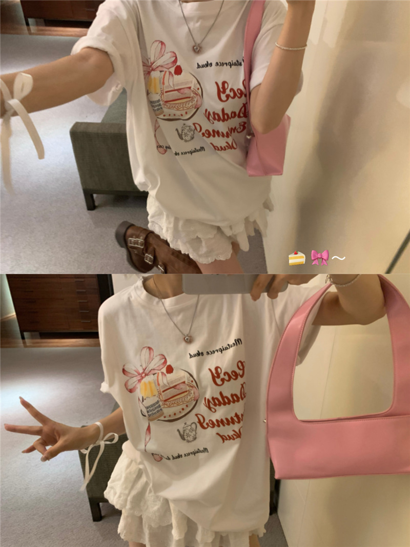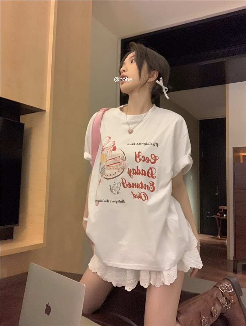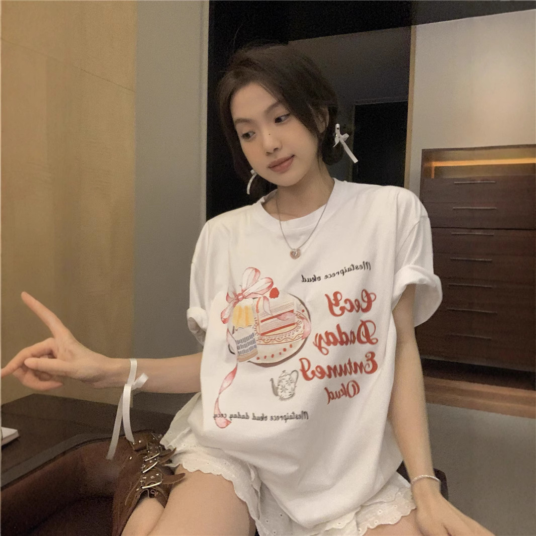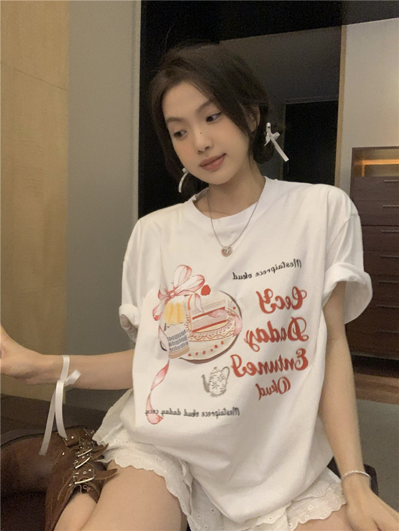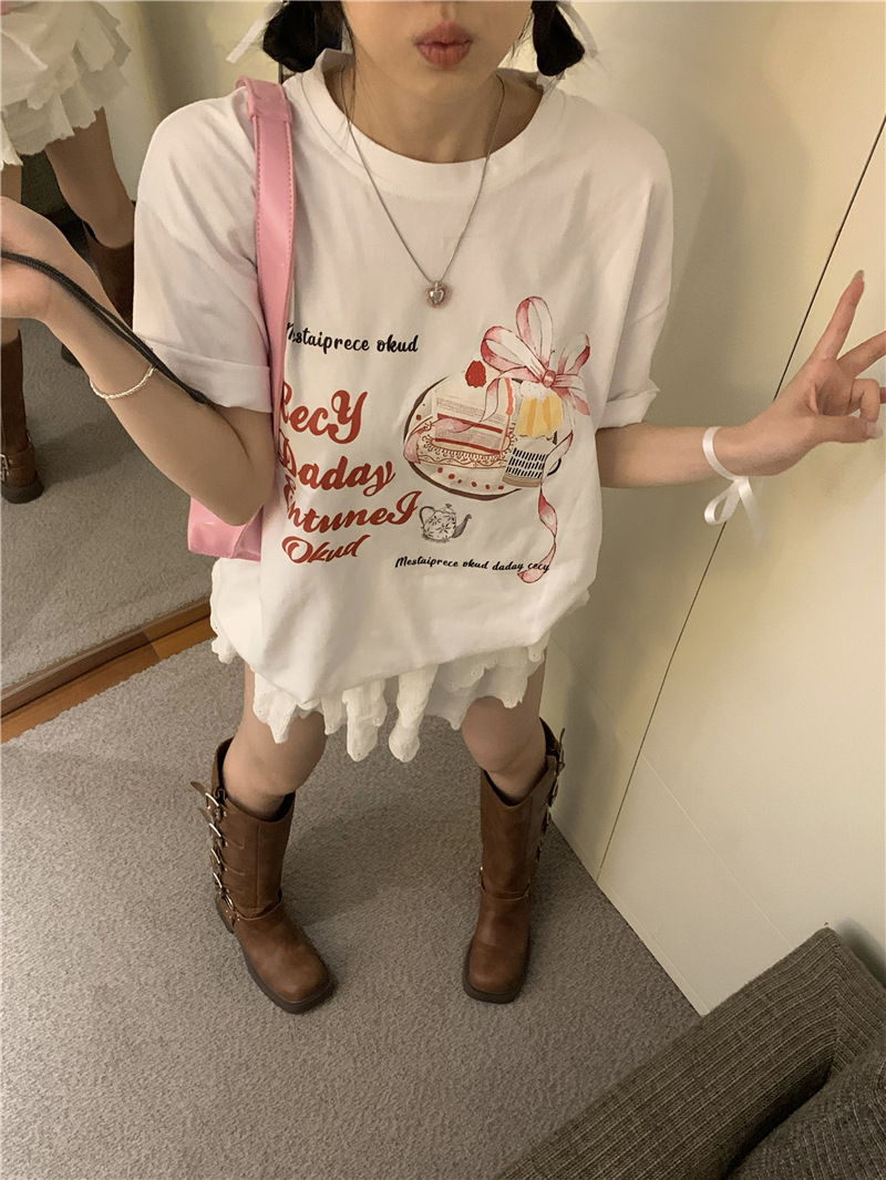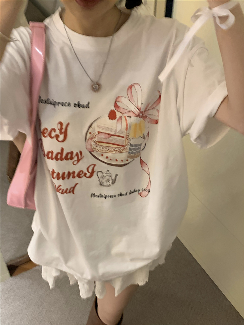 리얼 샷 ~ 일본 소녀 케이크 편지 인쇄 느슨한 반팔 티셔츠 캐주얼 다용도 연령 감소 재킷 조수 77338스토어 가기