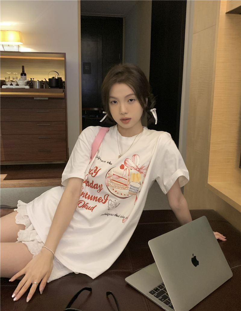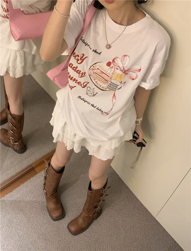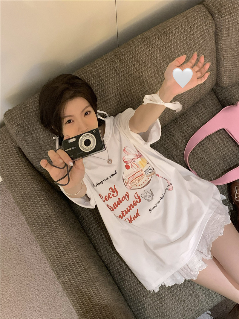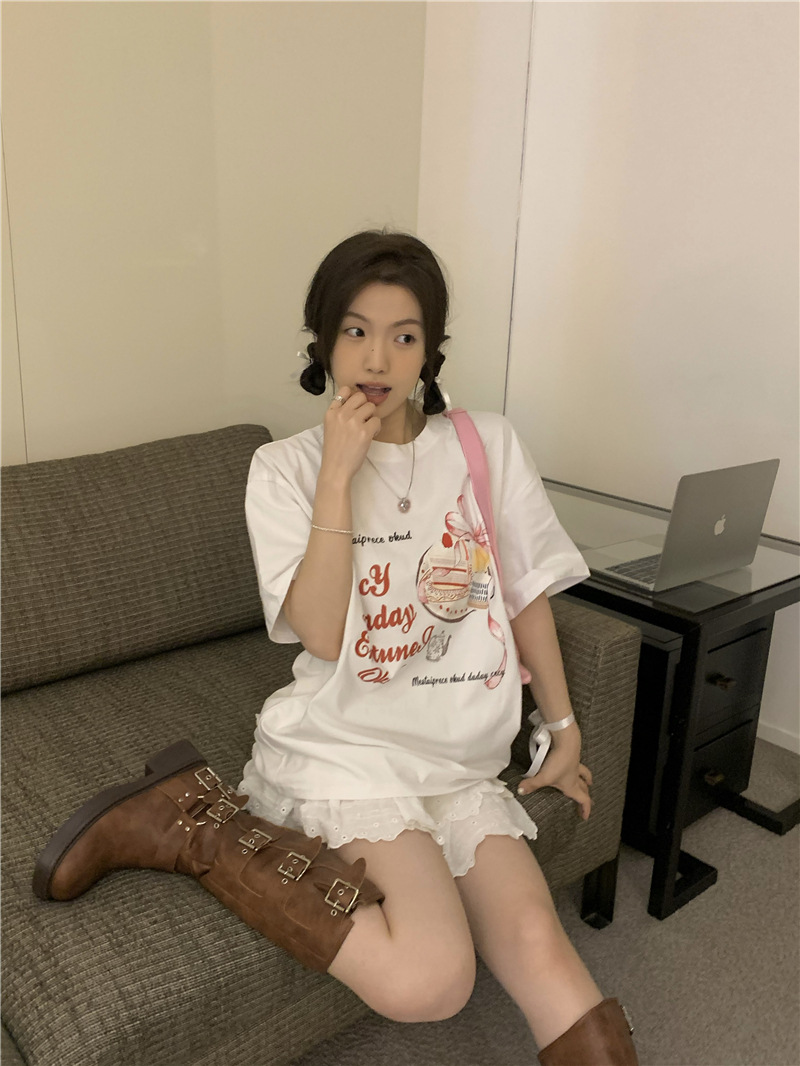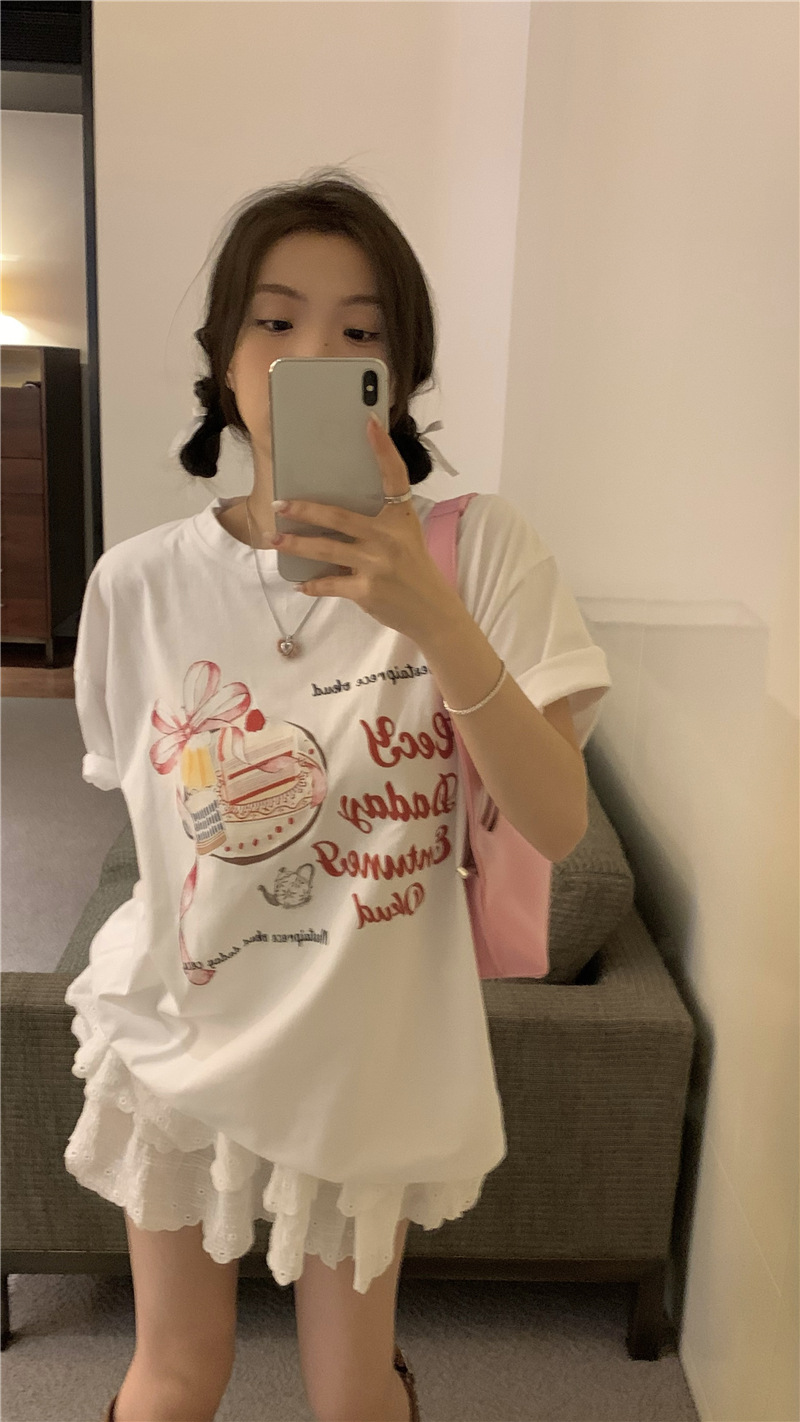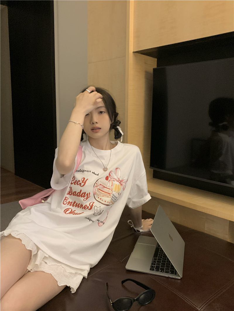리얼 샷 ~ 일본 소녀 케이크 편지 인쇄 느슨한 반팔 티셔츠 캐주얼 다용도 연령 감소 재킷 조수 77338스토어 가기