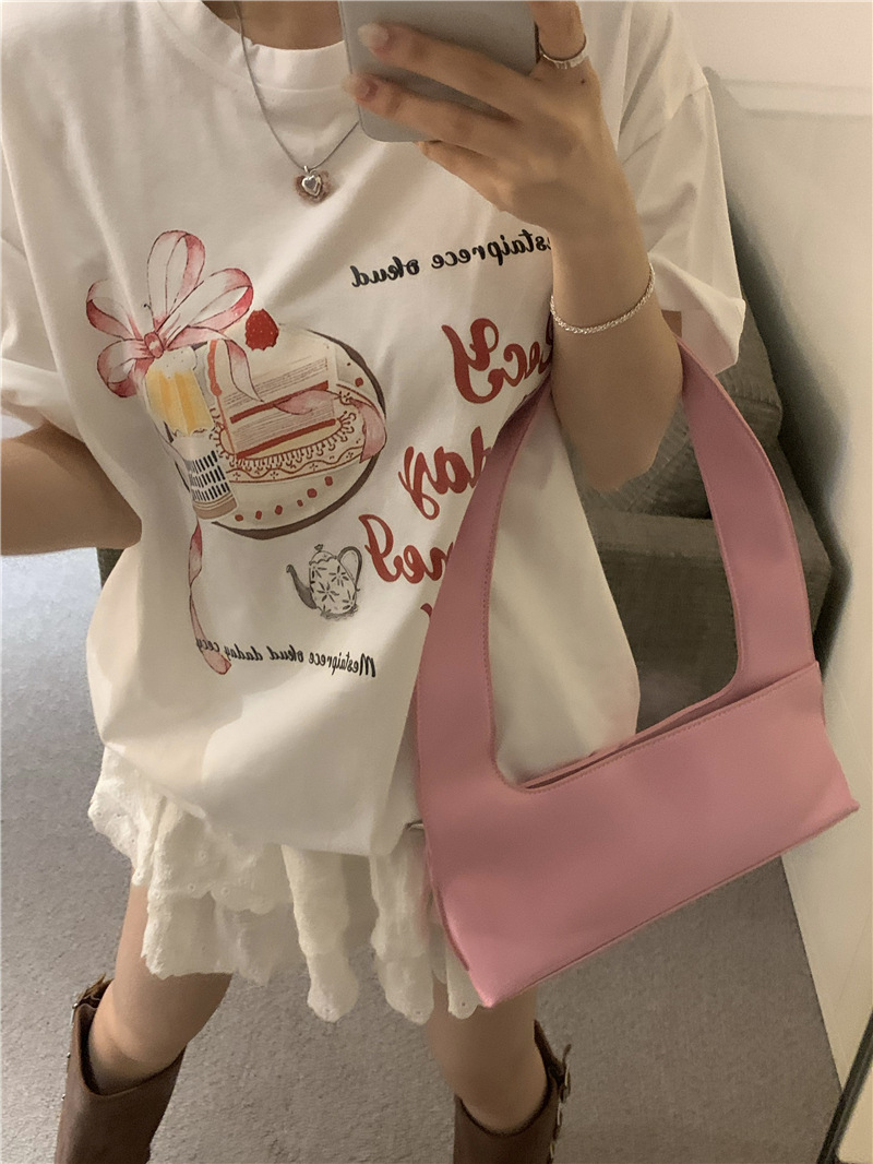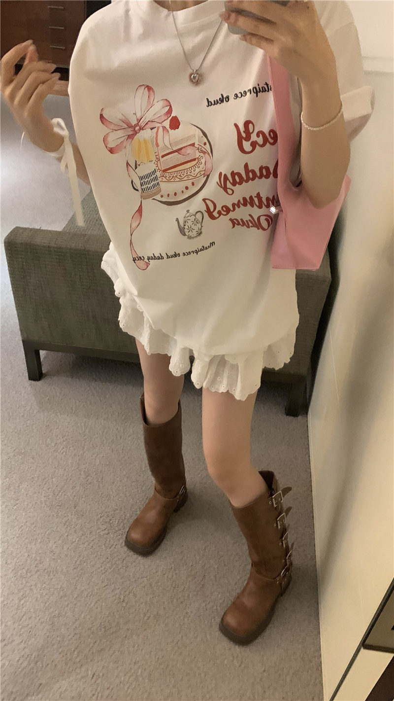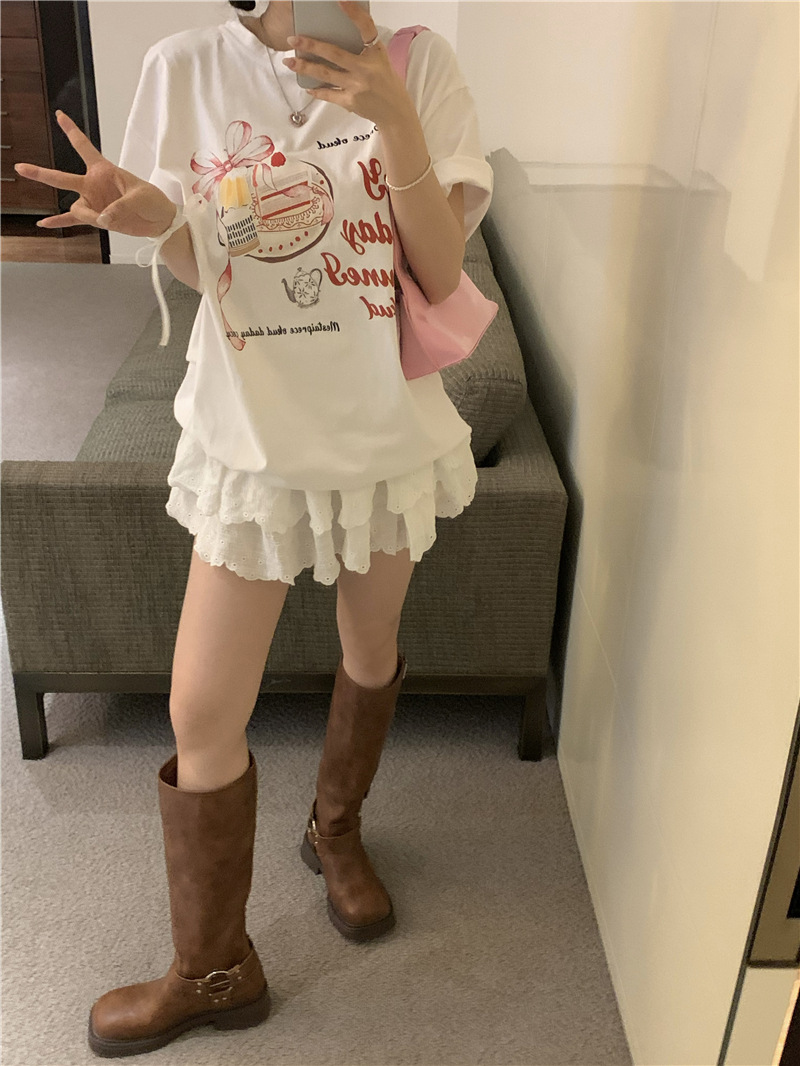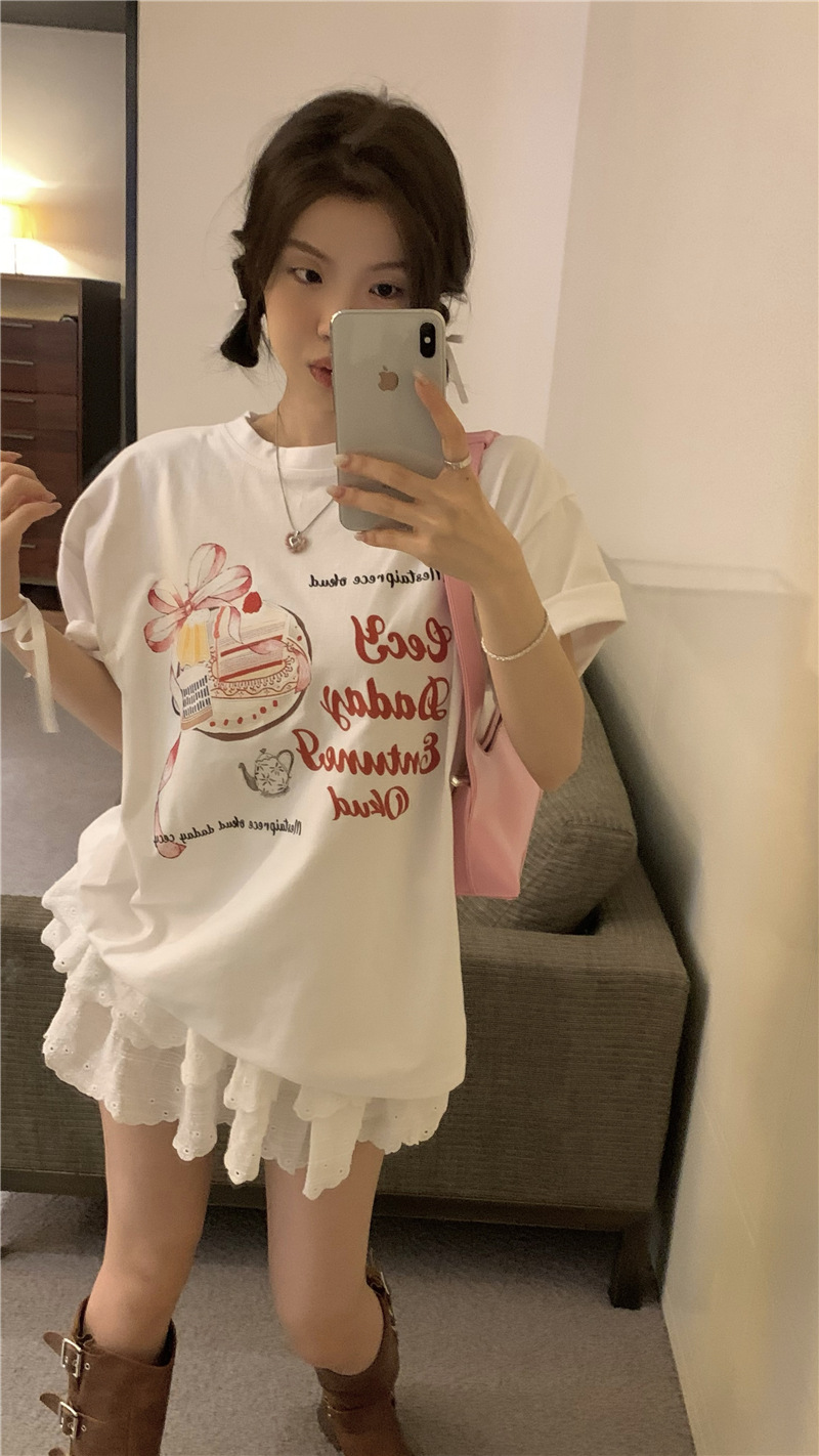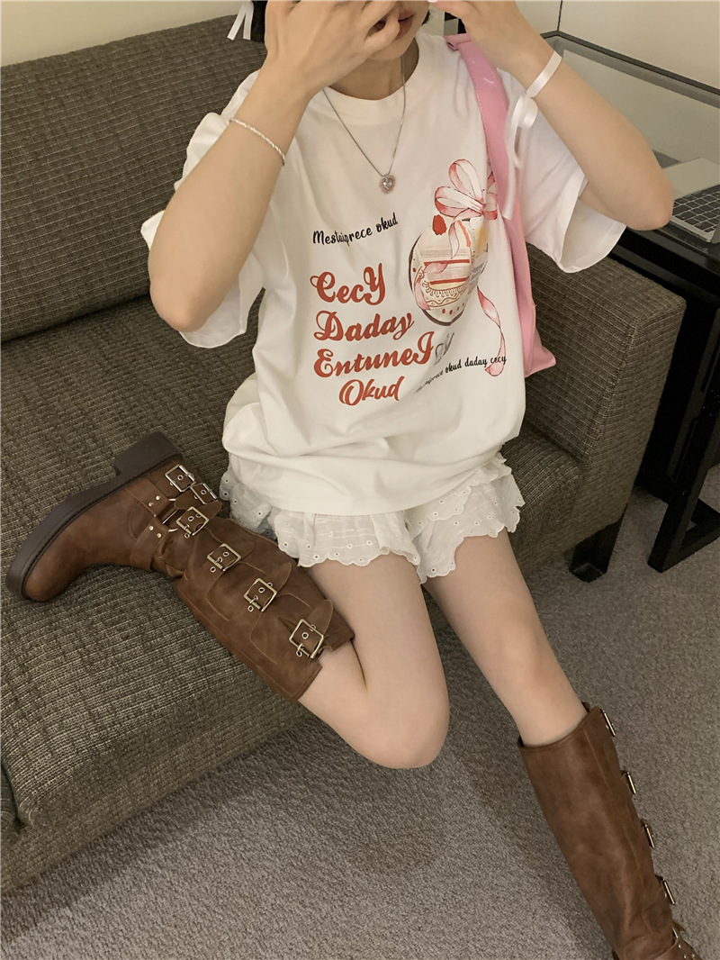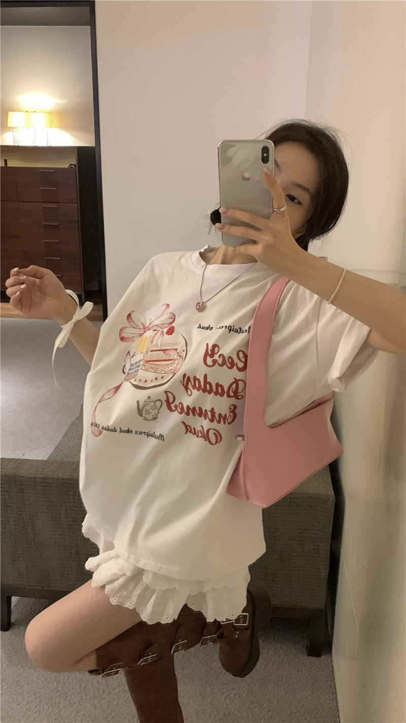 리얼 샷 ~ 일본 소녀 케이크 편지 인쇄 느슨한 반팔 티셔츠 캐주얼 다용도 연령 감소 재킷 조수 77338스토어 가기