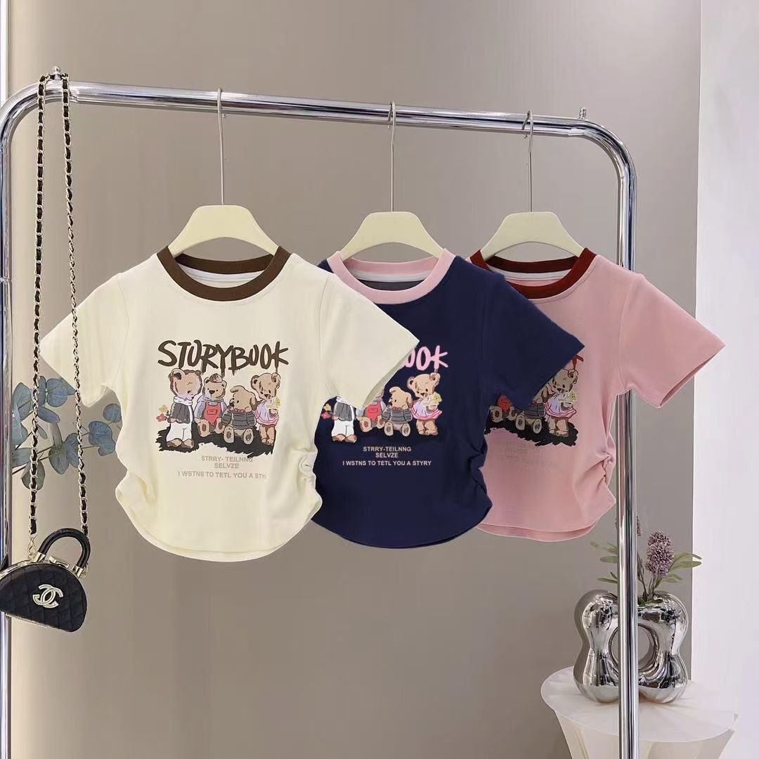 소녀의 새로운 여름 한국 스타일 올 매치 유치한 스타일 4 베어 인쇄 주름 반팔 인터넷 인기 슬림 핏 트렌디 티셔츠스토어 가기