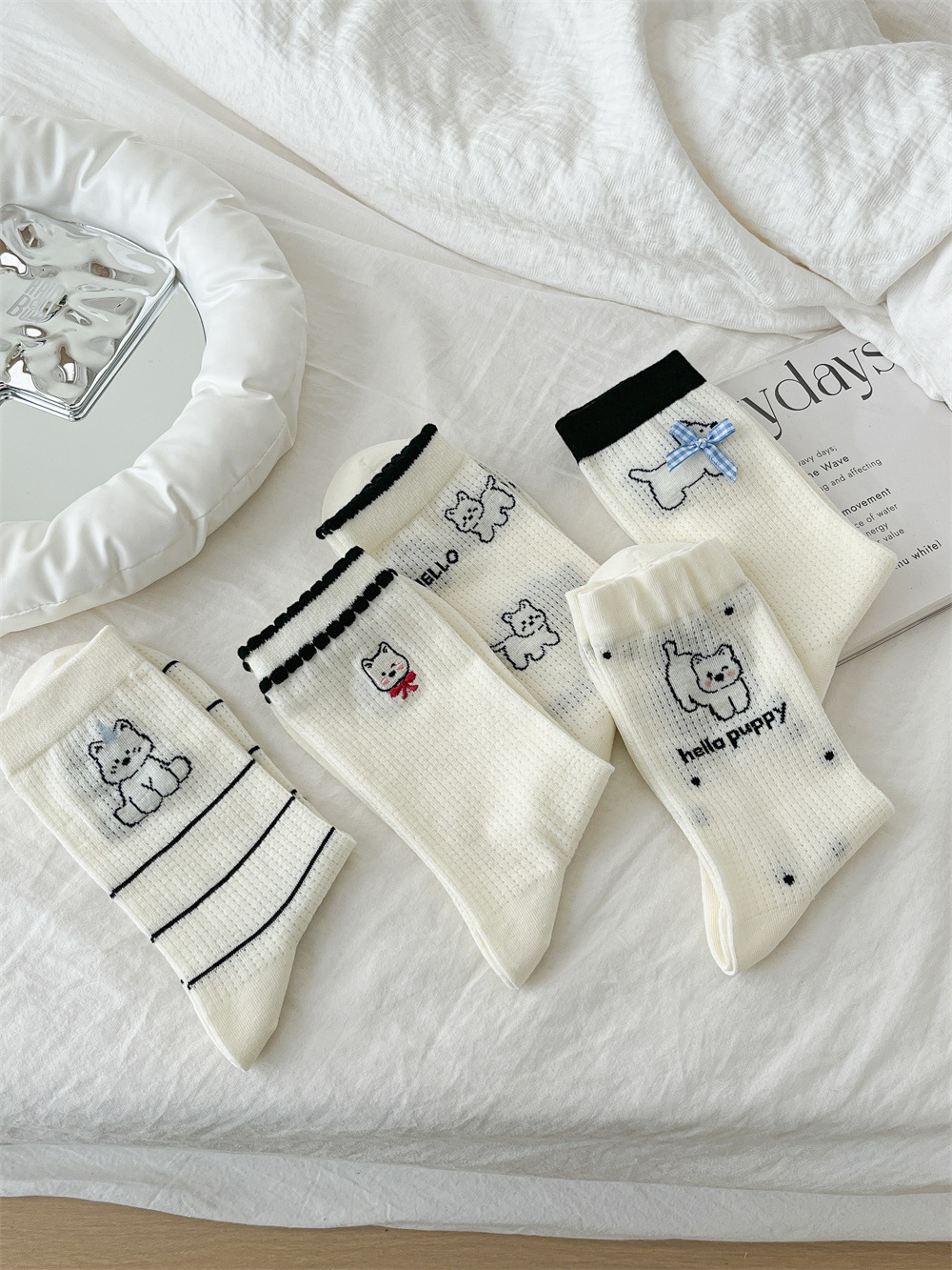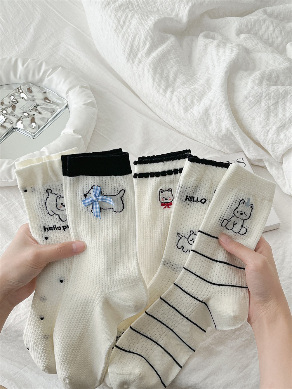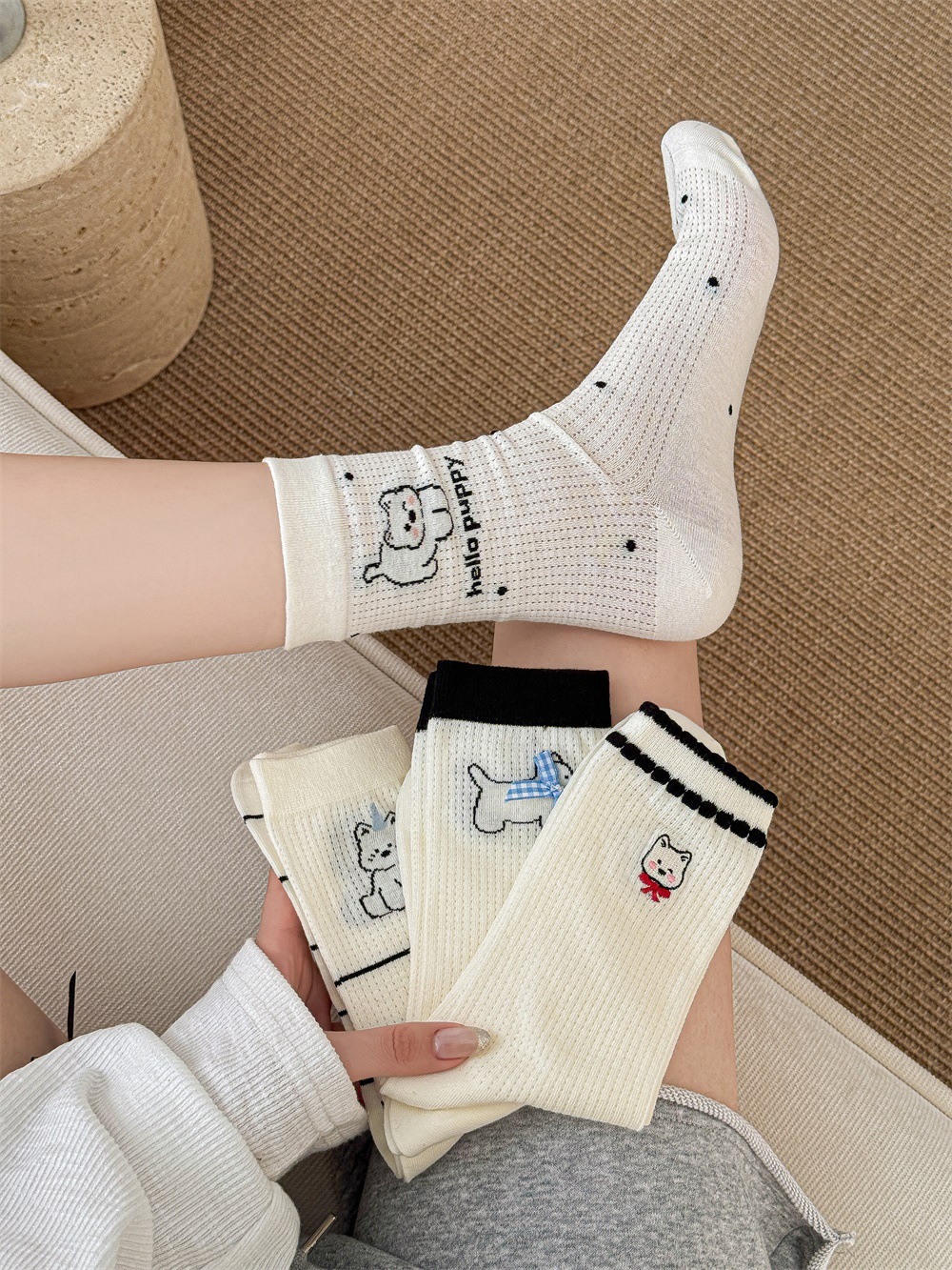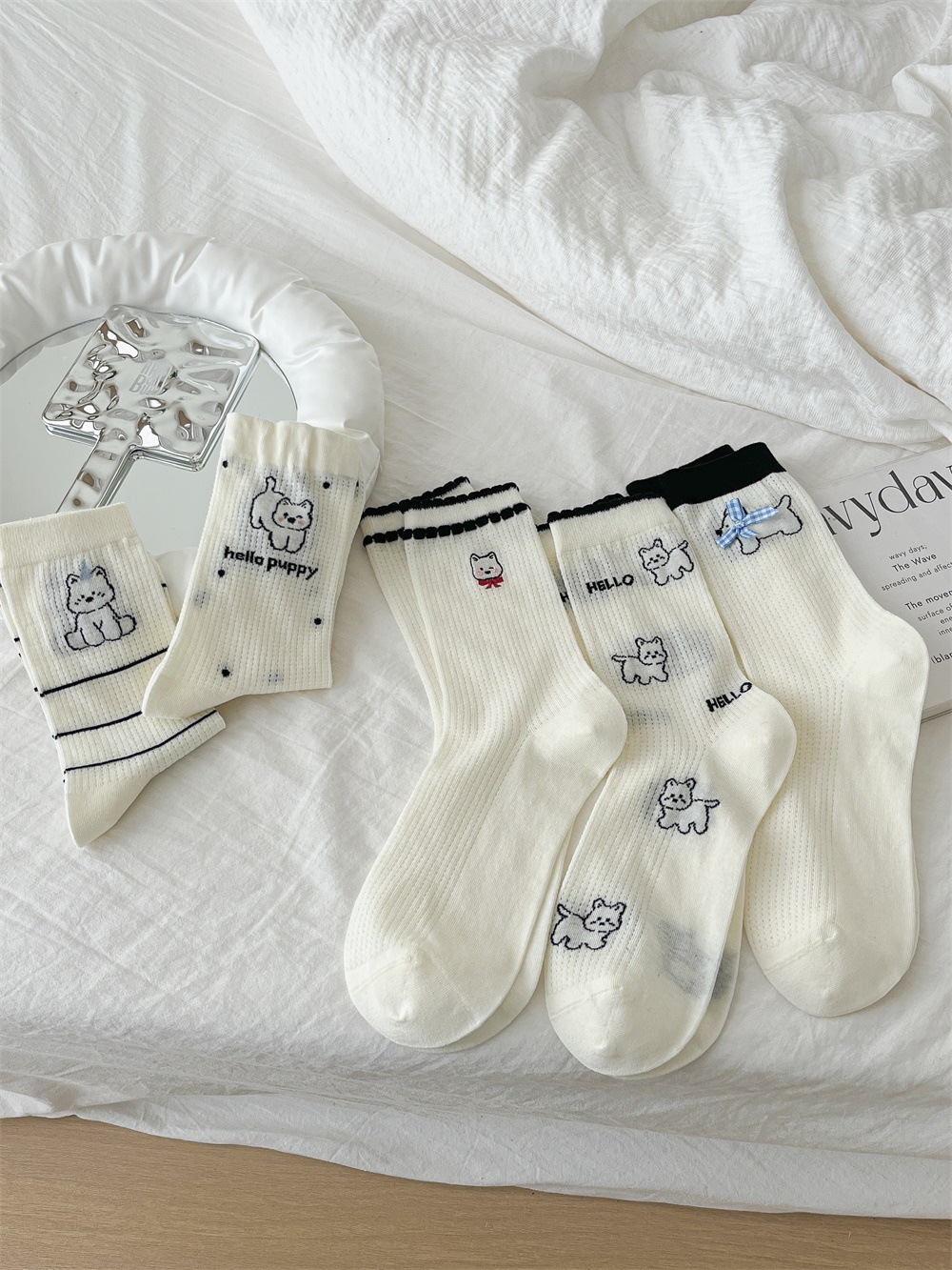 봄과 여름 새로운 흑백 강아지 메쉬 양말 여성 중간 길이 양말 일본 스타일 인스타그램 스타일 면 얇은 귀여운 스타킹