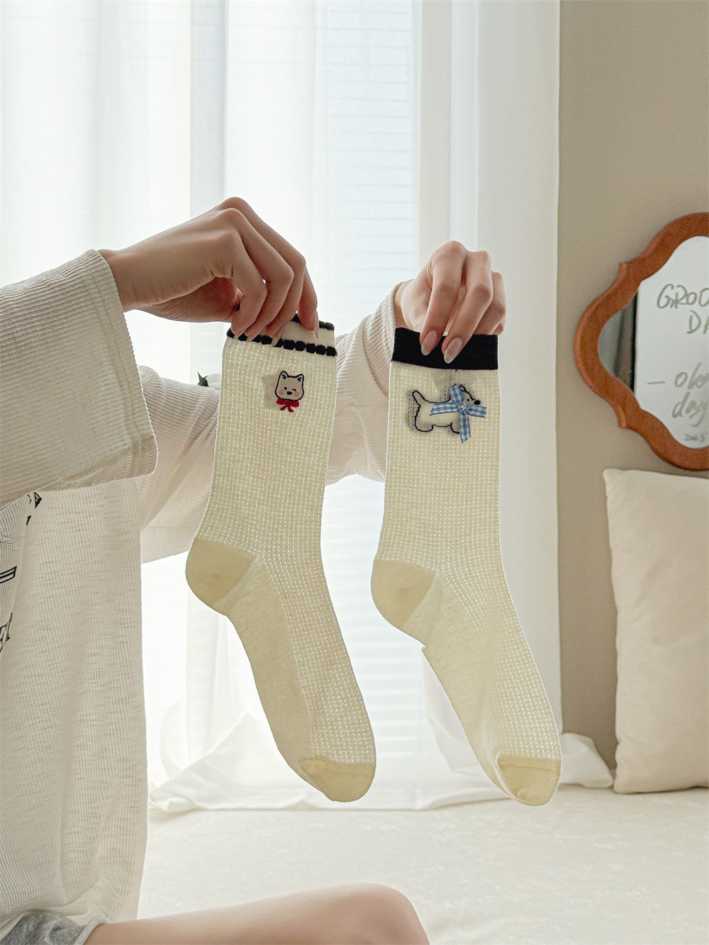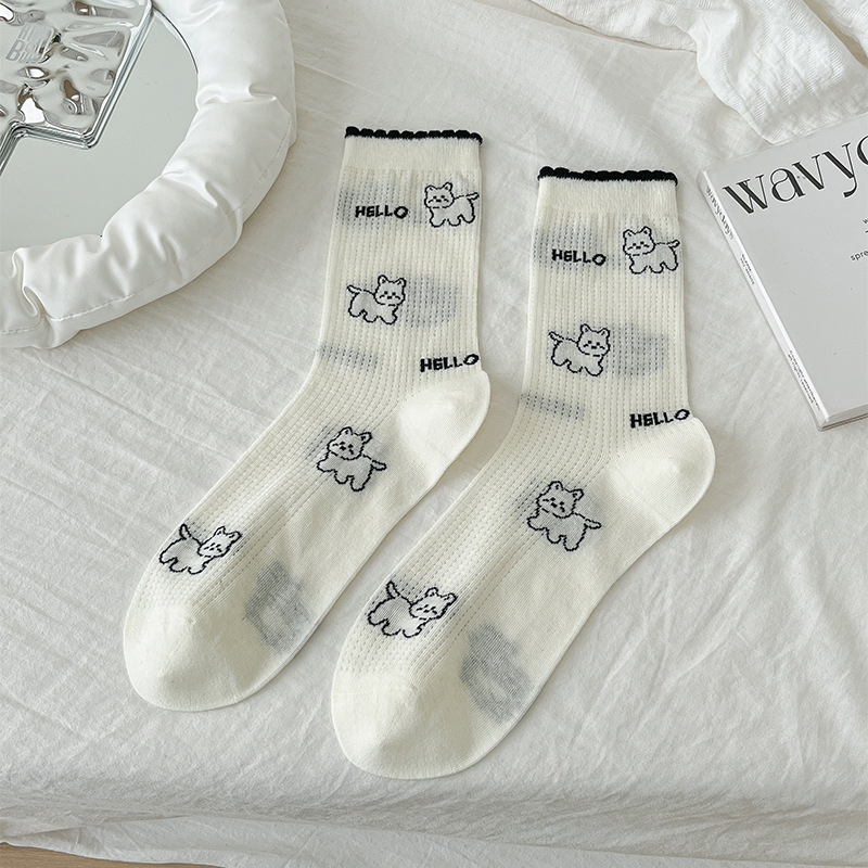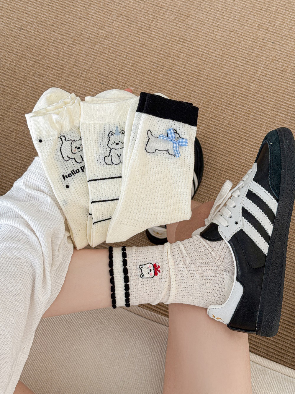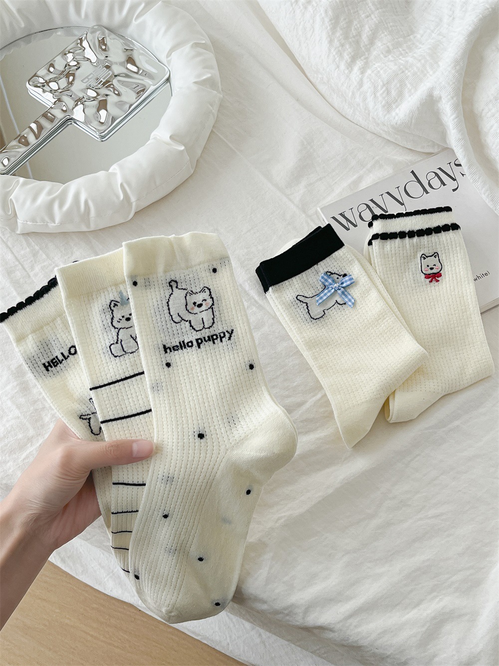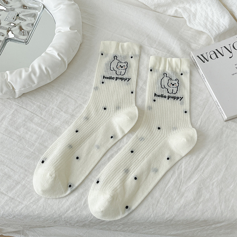 봄과 여름 새로운 흑백 강아지 메쉬 양말 여성 중간 길이 양말 일본 스타일 인스타그램 스타일 면 얇은 귀여운 스타킹