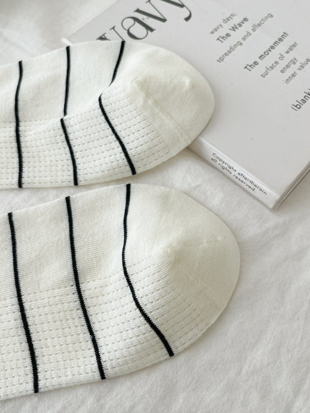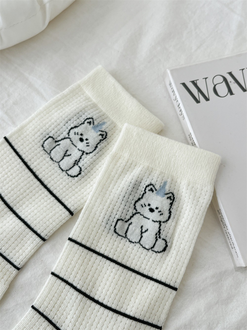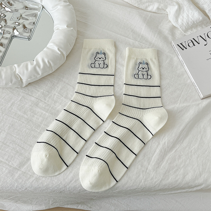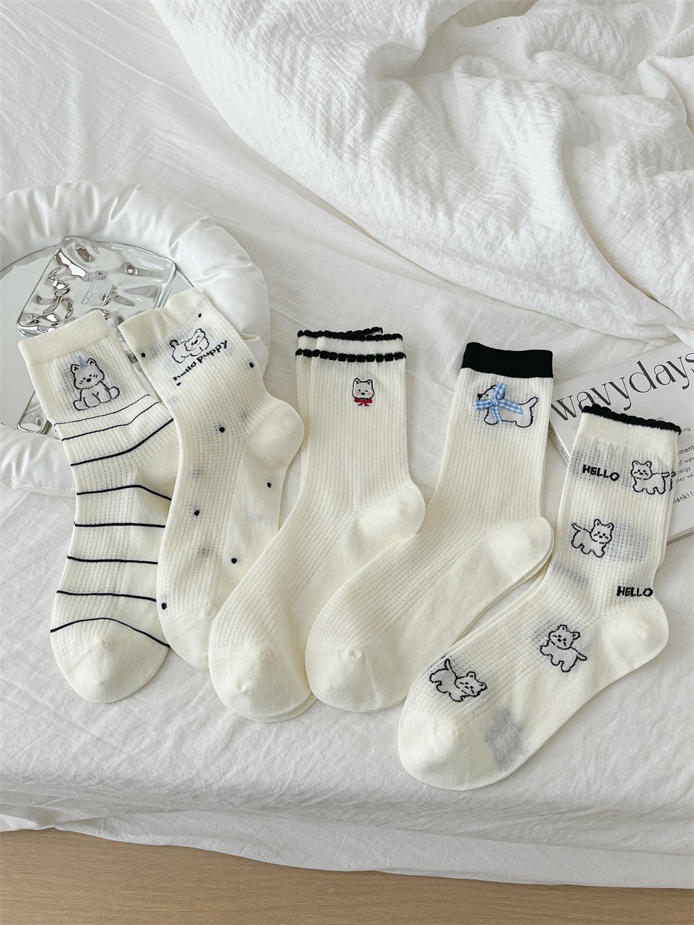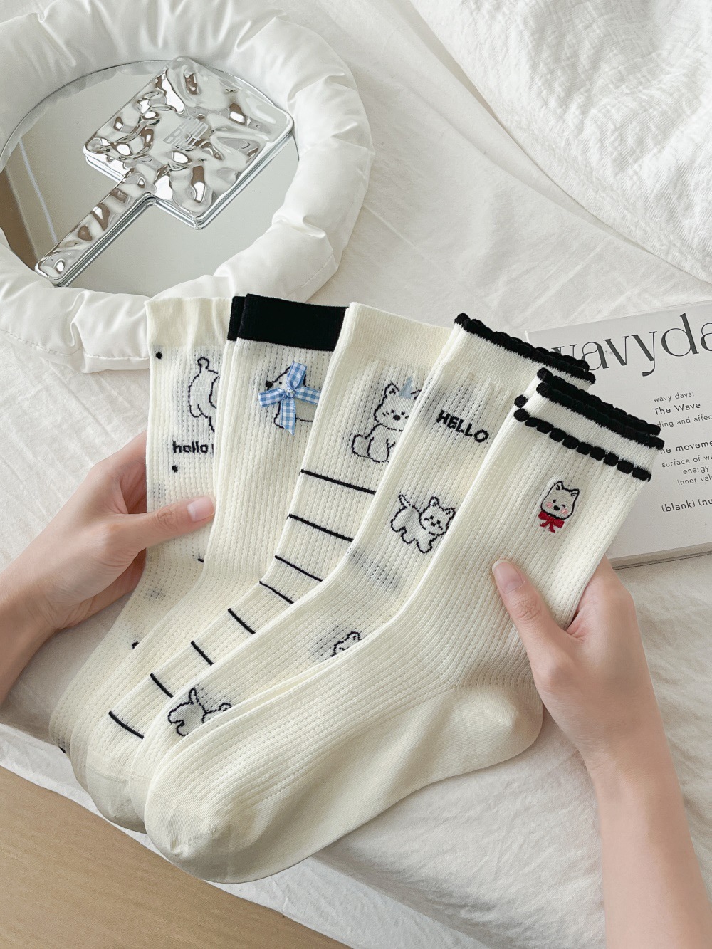 봄과 여름 새로운 흑백 강아지 메쉬 양말 여성 중간 길이 양말 일본 스타일 인스타그램 스타일 면 얇은 귀여운 스타킹