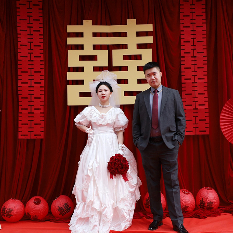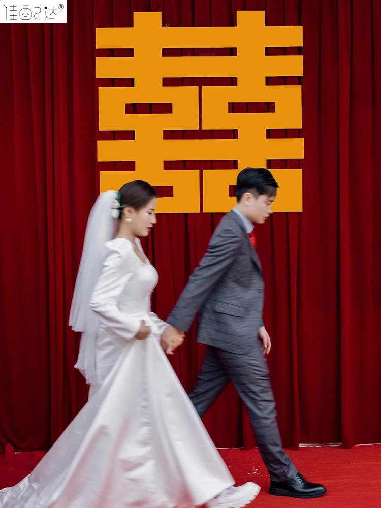 중국 결혼식 약혼 연회 장식 황금 행복 캐릭터 버건디 커튼 결혼식 아침 가운 사진 배경 레이아웃스토어 가기