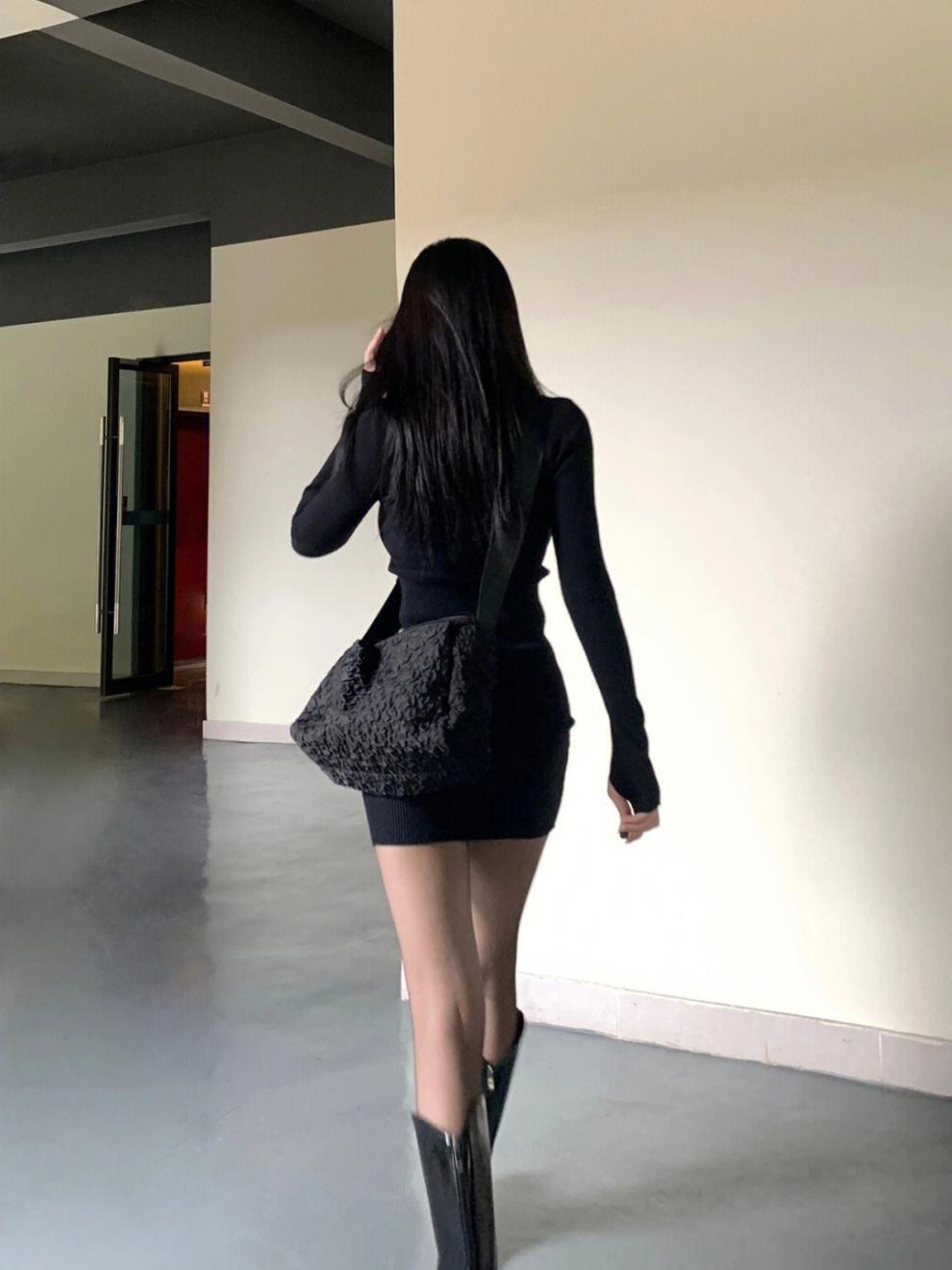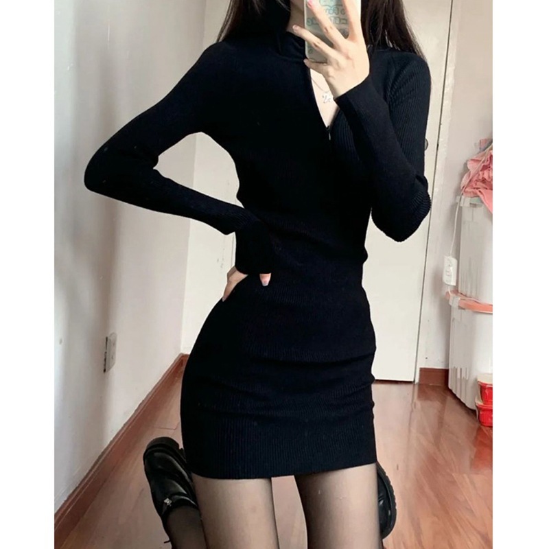 플러스 사이즈 통통한 여동생 긴팔 니트 기지 원피스 여성의 봄 가을과 겨울 새로운 슬리밍 섹시한 칼집 검은 치마스토어 가기