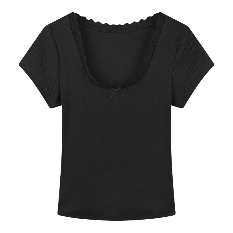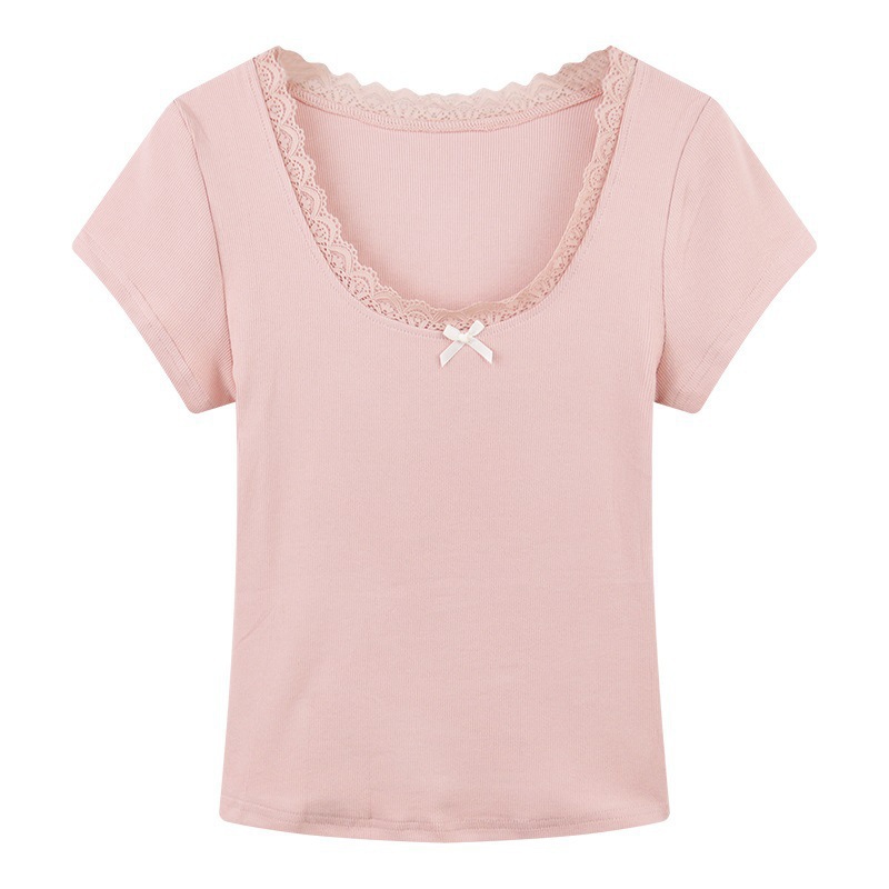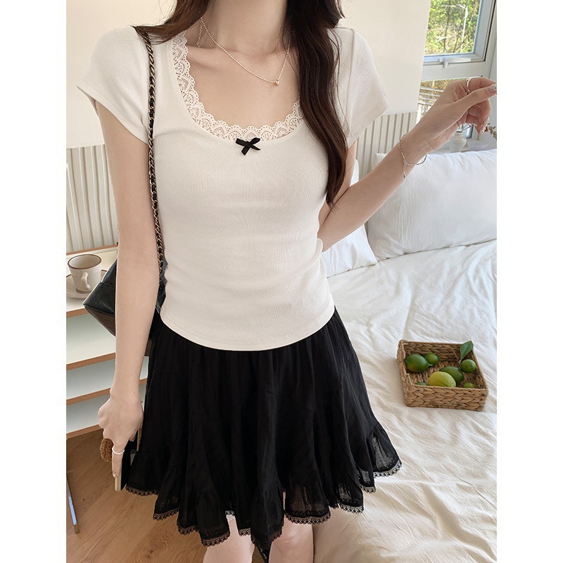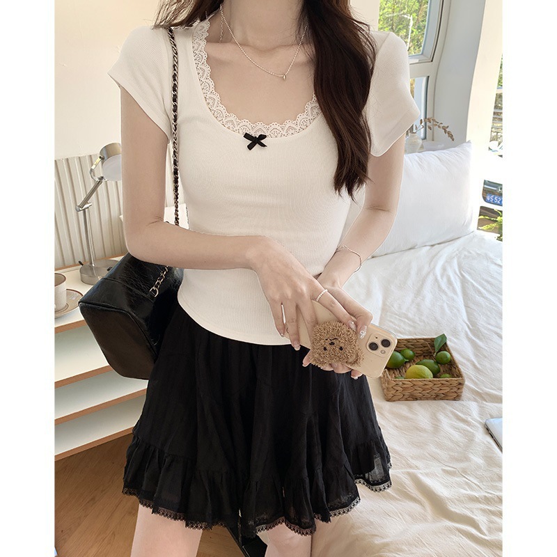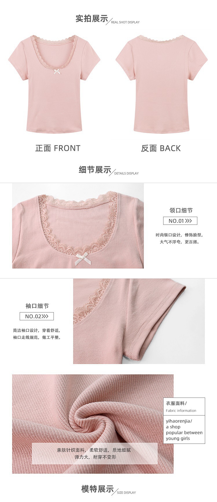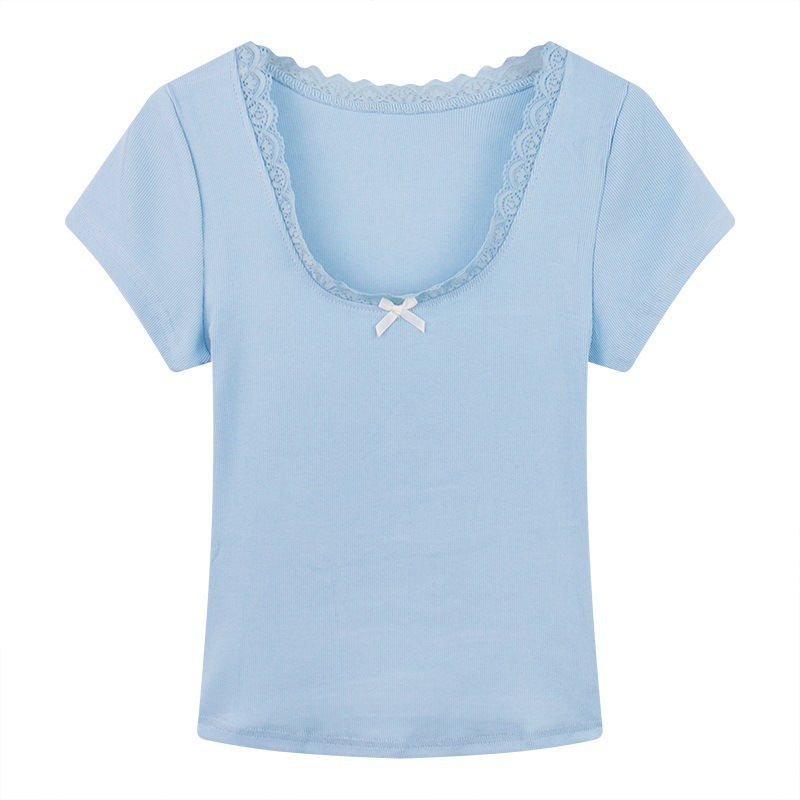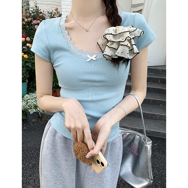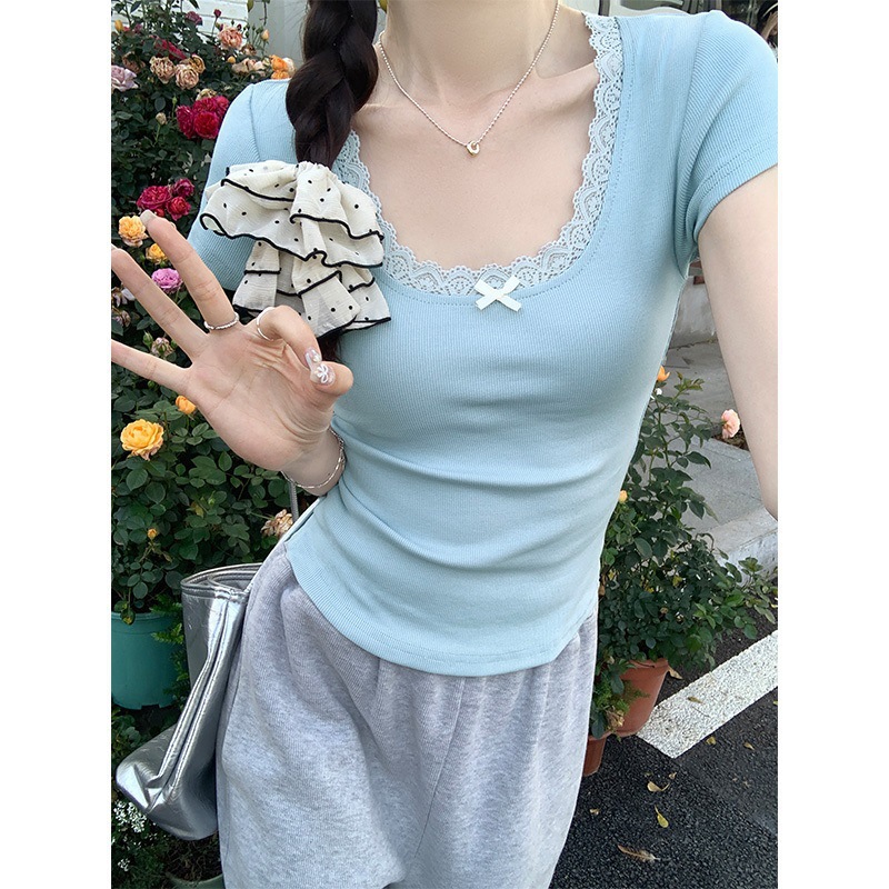 퓨어 블루 레이스 반팔 티셔츠 여성용 2024 년 새 여름 세련된 달콤하고 뜨거운 짧은 슬림 핏 숄더 탑